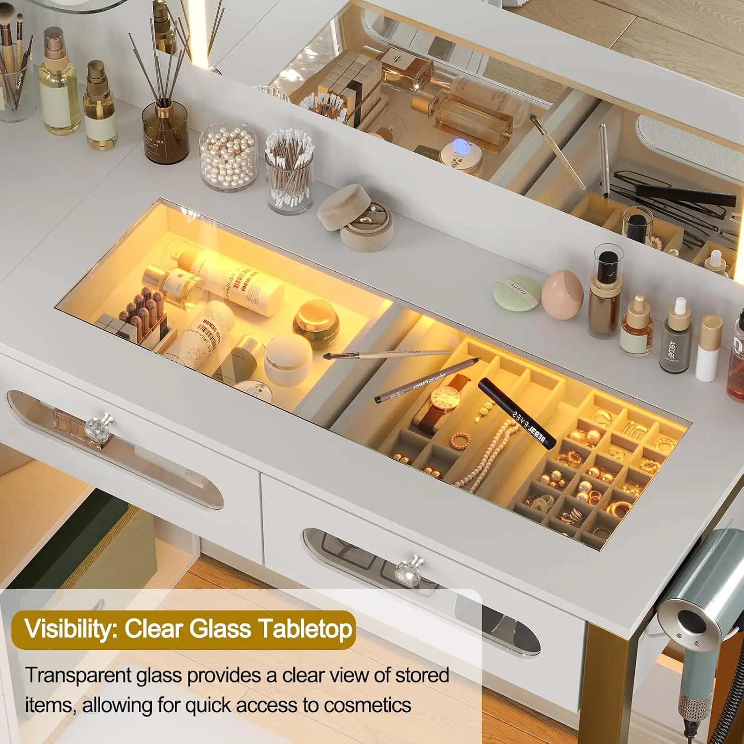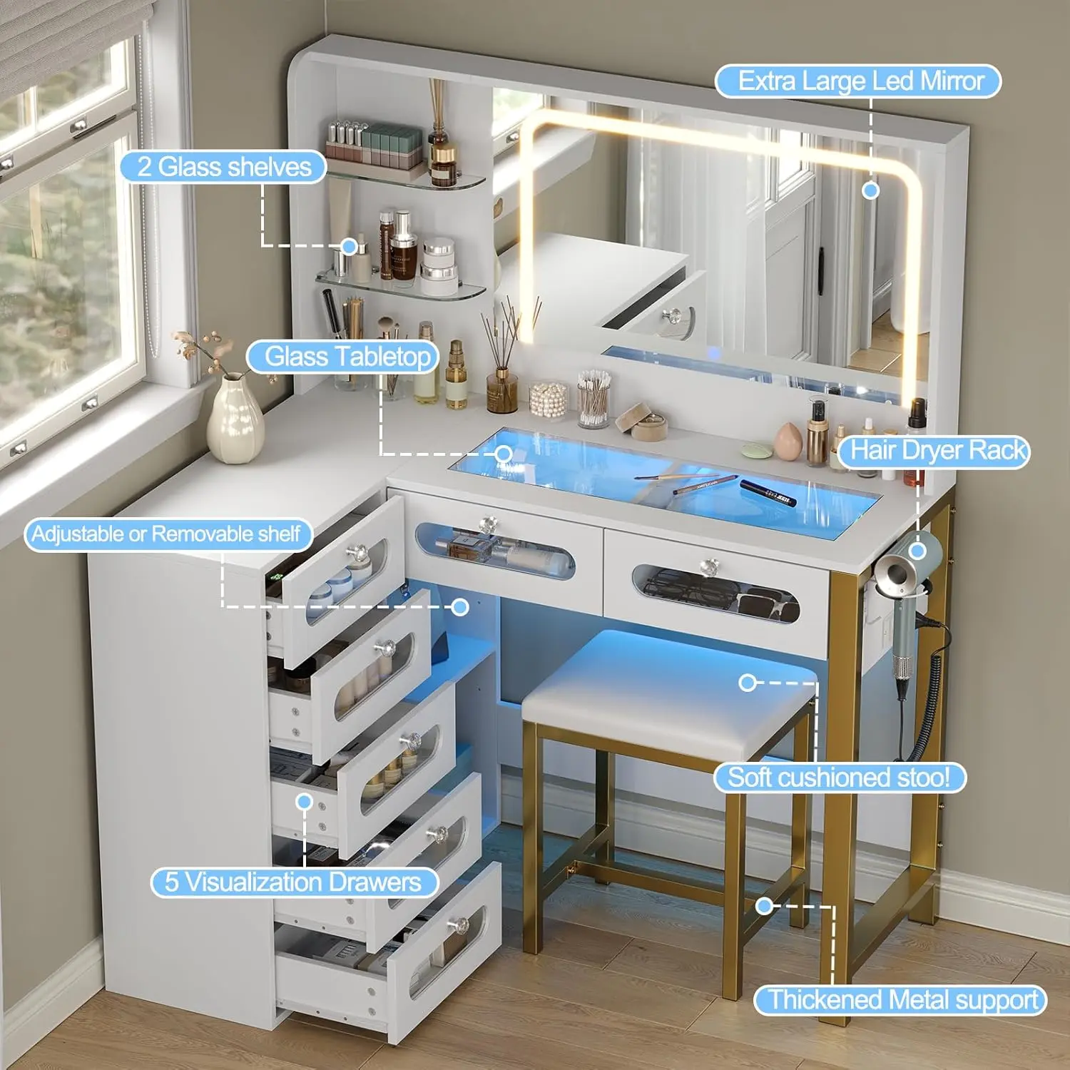 ·Powerful Storage Capacity: Large makeup desk, it features 2 RGB Drawers and 5 drawers with tempered glass visualization panels, 2 acrylic shelves and 1 adjustable or removable wooden shelf, of your habit to avoid the desktop messy and can’t find cosmetics.