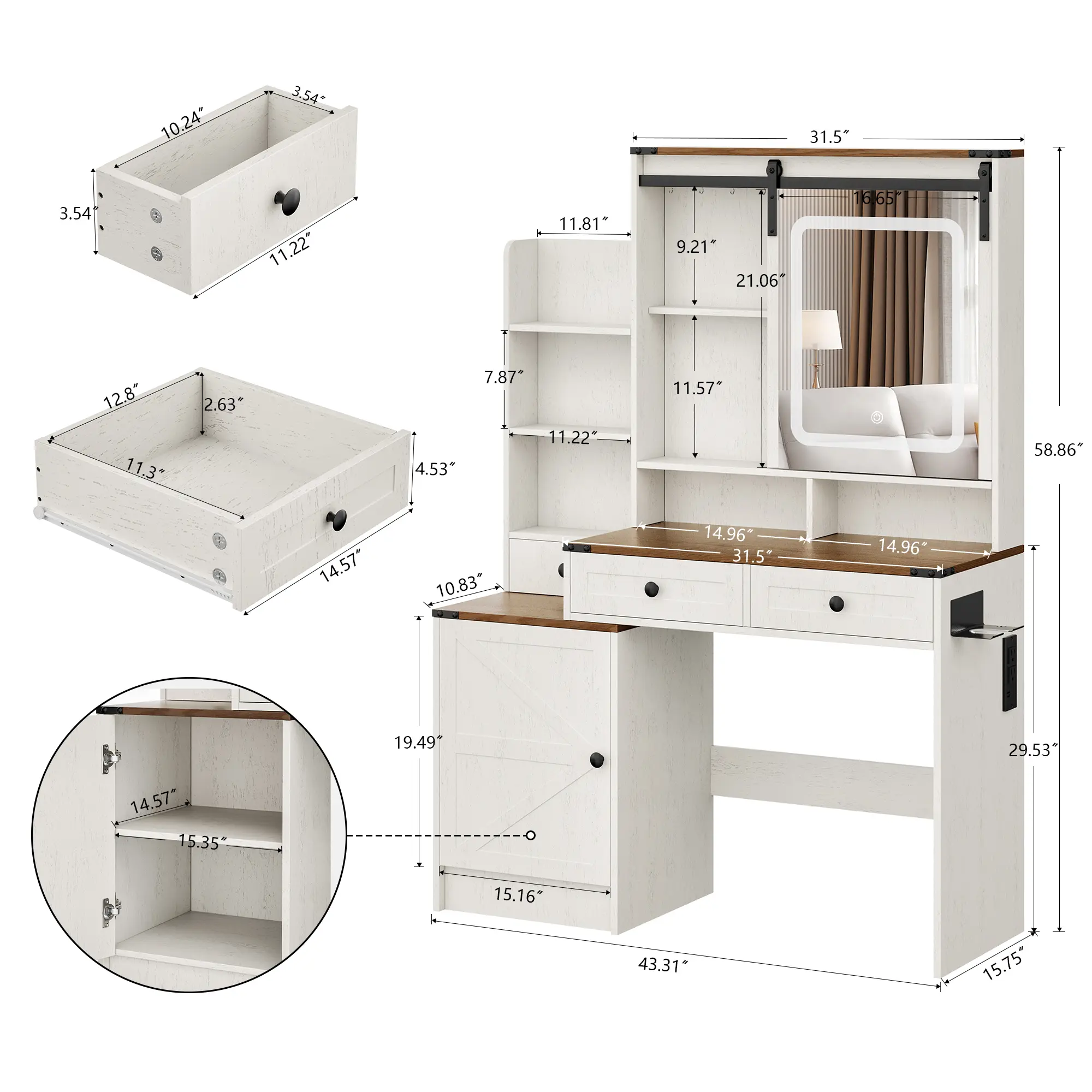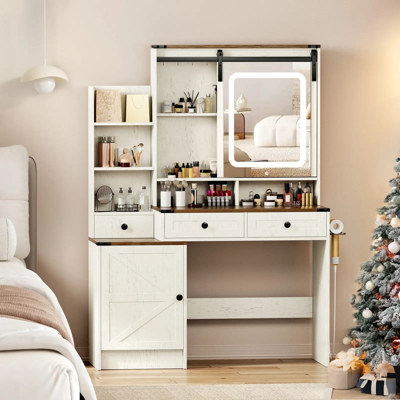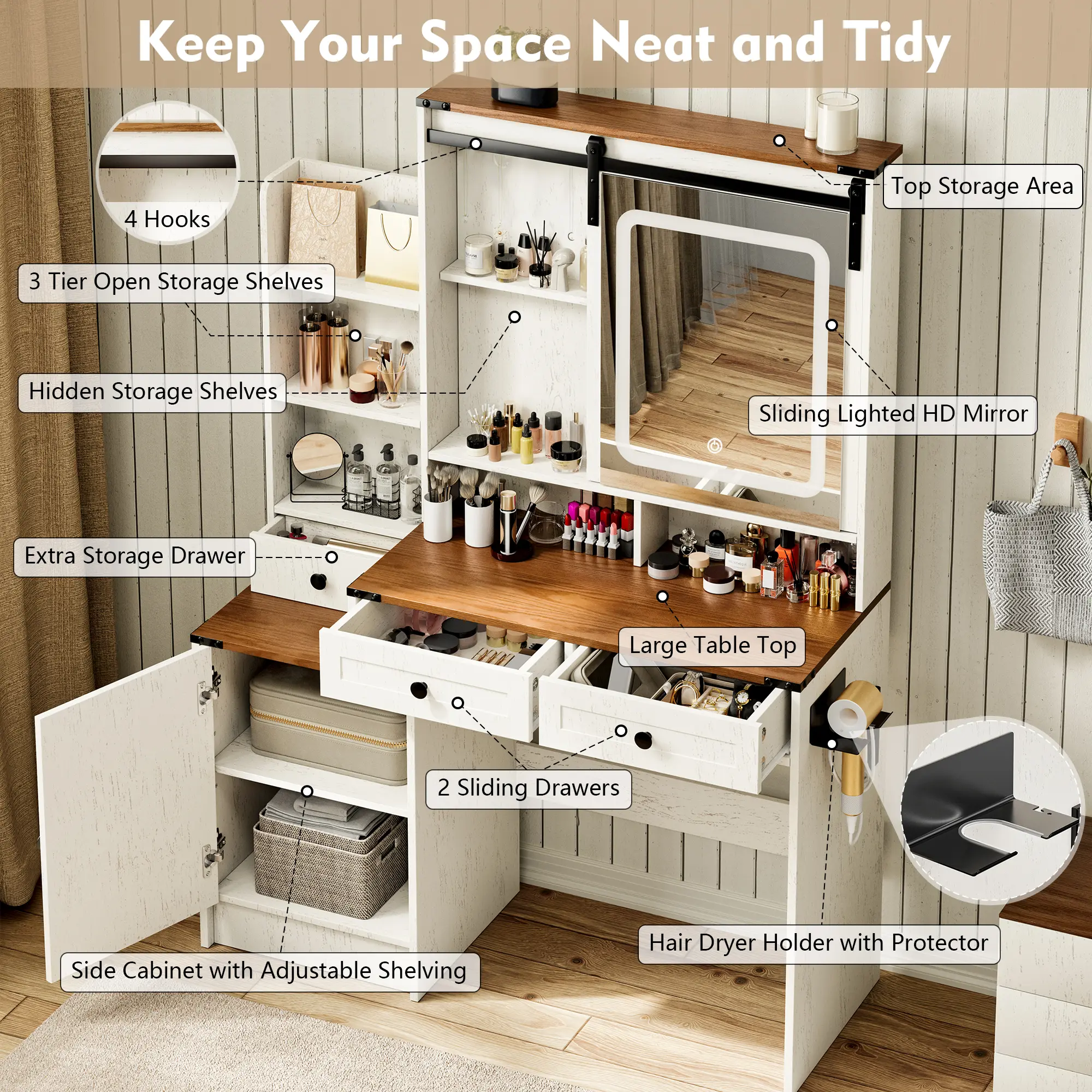 ·Multi-functional Design: In addition to storage and lighting, the side of the vanity includes a hairdryer holder and built-in power outlets (2 3-prong sockets and 2 USB ports), making it convenient to charge your devices or power your beauty tools.