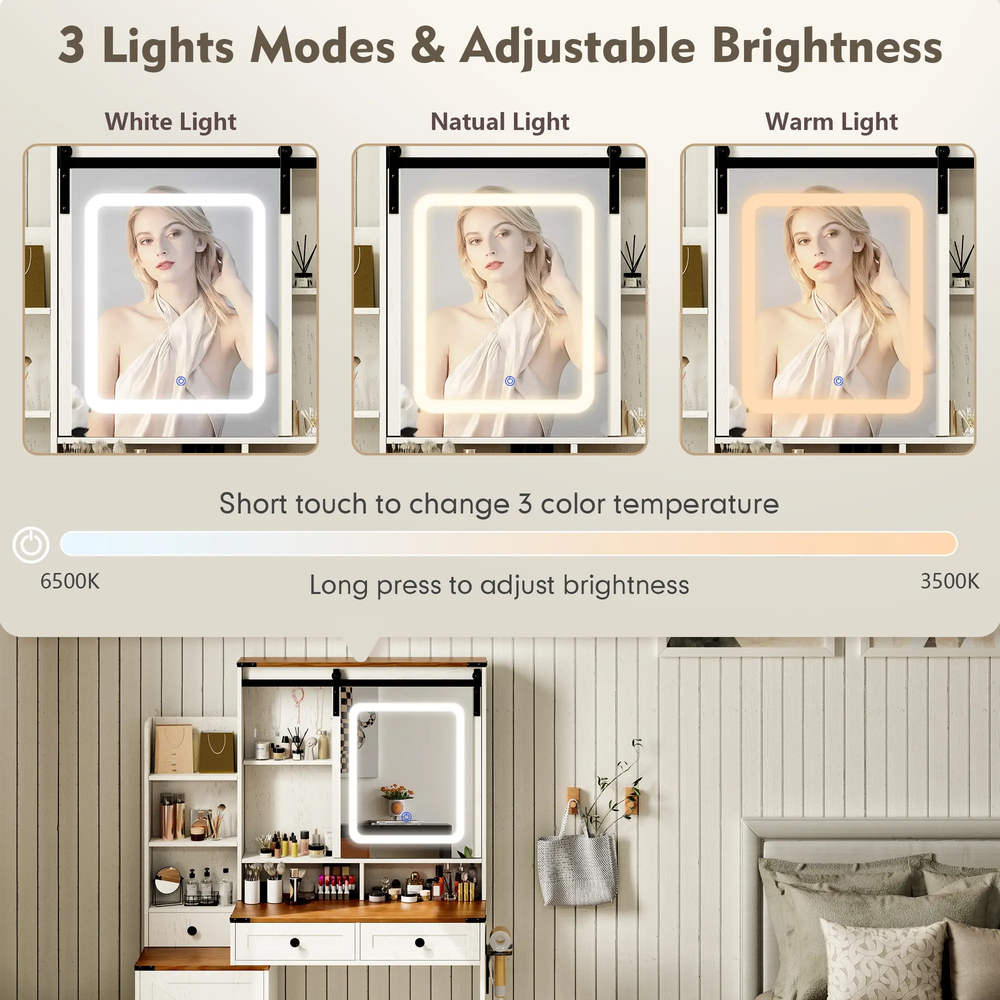 ·HD Mirror with Adjustable LED Lighting: The built-in LED strip offers 3 light modes (Cool, Warm, Natural) with a touch screen for easy switching. You can also adjust the brightness to suit your needs, ensuring the perfect lighting for your makeup routine.