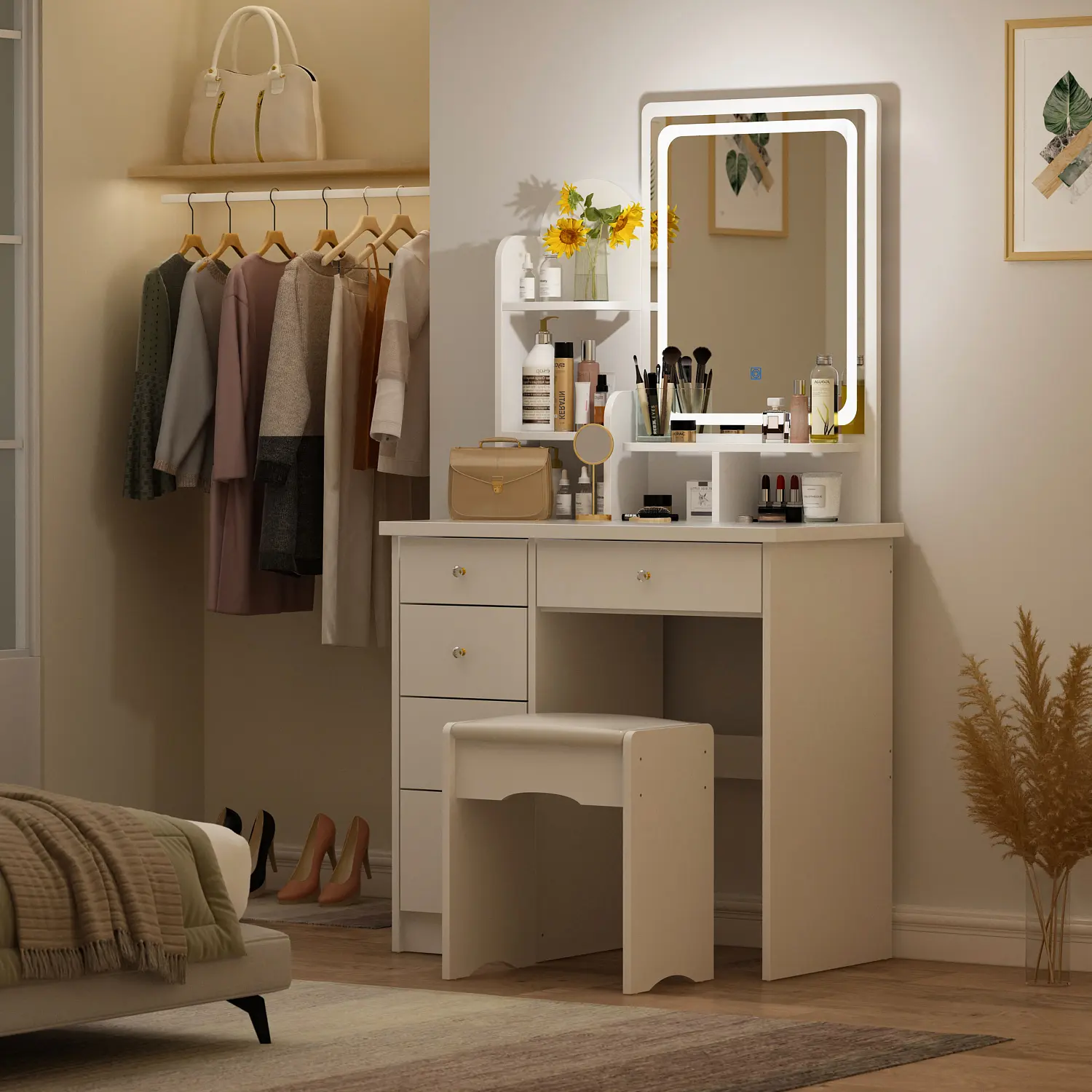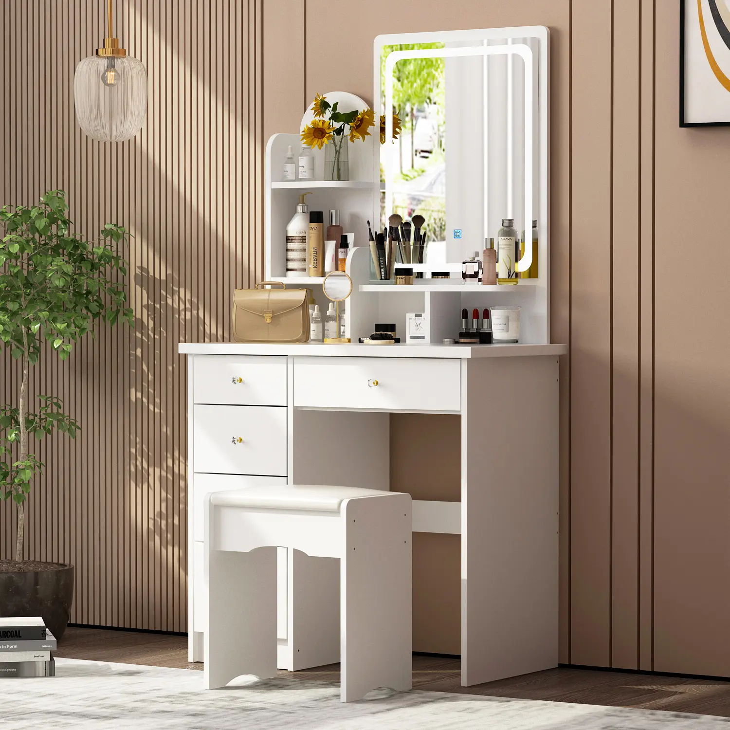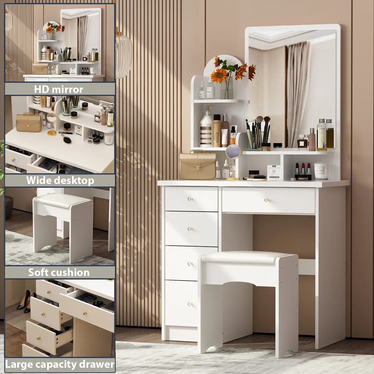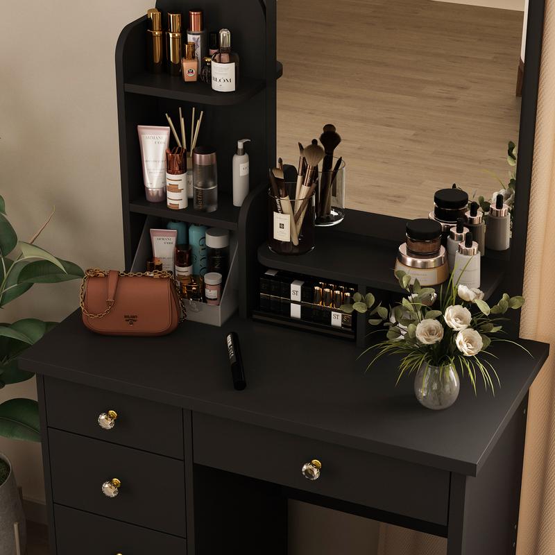 [Cushioned Vanity Stool]: This vanity set comes with a stool, the vanity stool is filled with elastic cushion and covered by PU leather to offer a comfortable experience. The comfortable stool with proper height can be placed under the desk