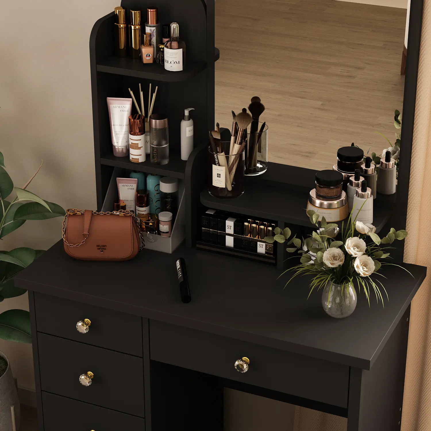 [Ample Storage Space]: The makeup dressing table features 4 storage shelves on desktop and 5 drawers, which provide large storage space. You can store your various cosmetics, jewelry, perfume, photos, decorative crafts and more essentials in an orderly way