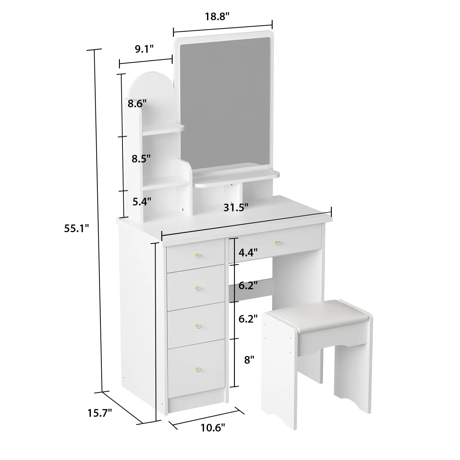 [Dimensions & Assembly]: Overall Sizes: 31.5”L x 15.6”W x 55.1”H. This vanity table with stool set is assembly required, all parts and instructions are included in package. Just look through the manual then follow the steps
