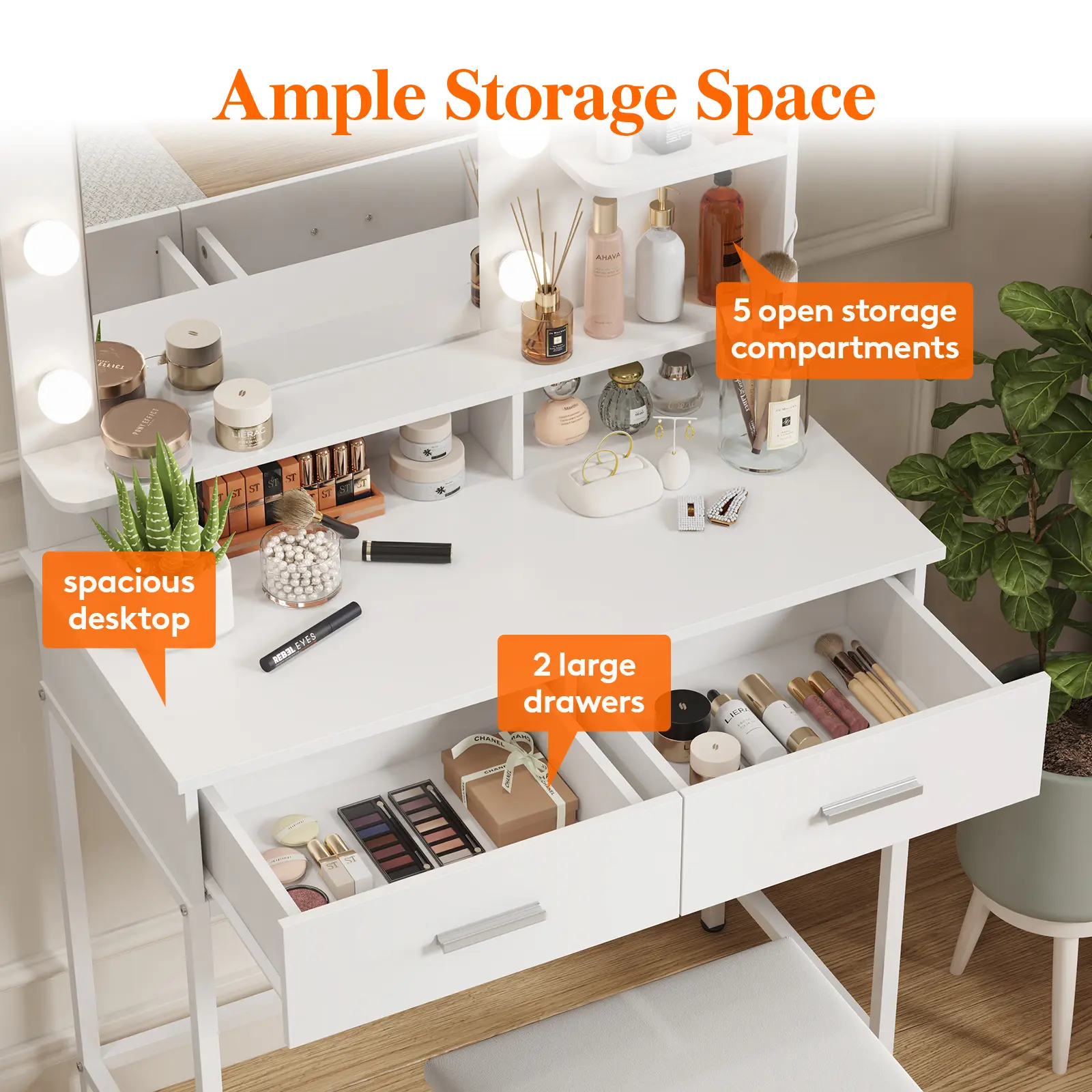 ·Ample Storage SpaceThis makeup vanity includes 2 large drawers, 5 open compartments, and a spacious desktop, offering ample space for cosmetics, perfumes, jewelry, and hair tools. The hidden wiring keeps the appearance tidy, enhancing your bedroom's beauty.