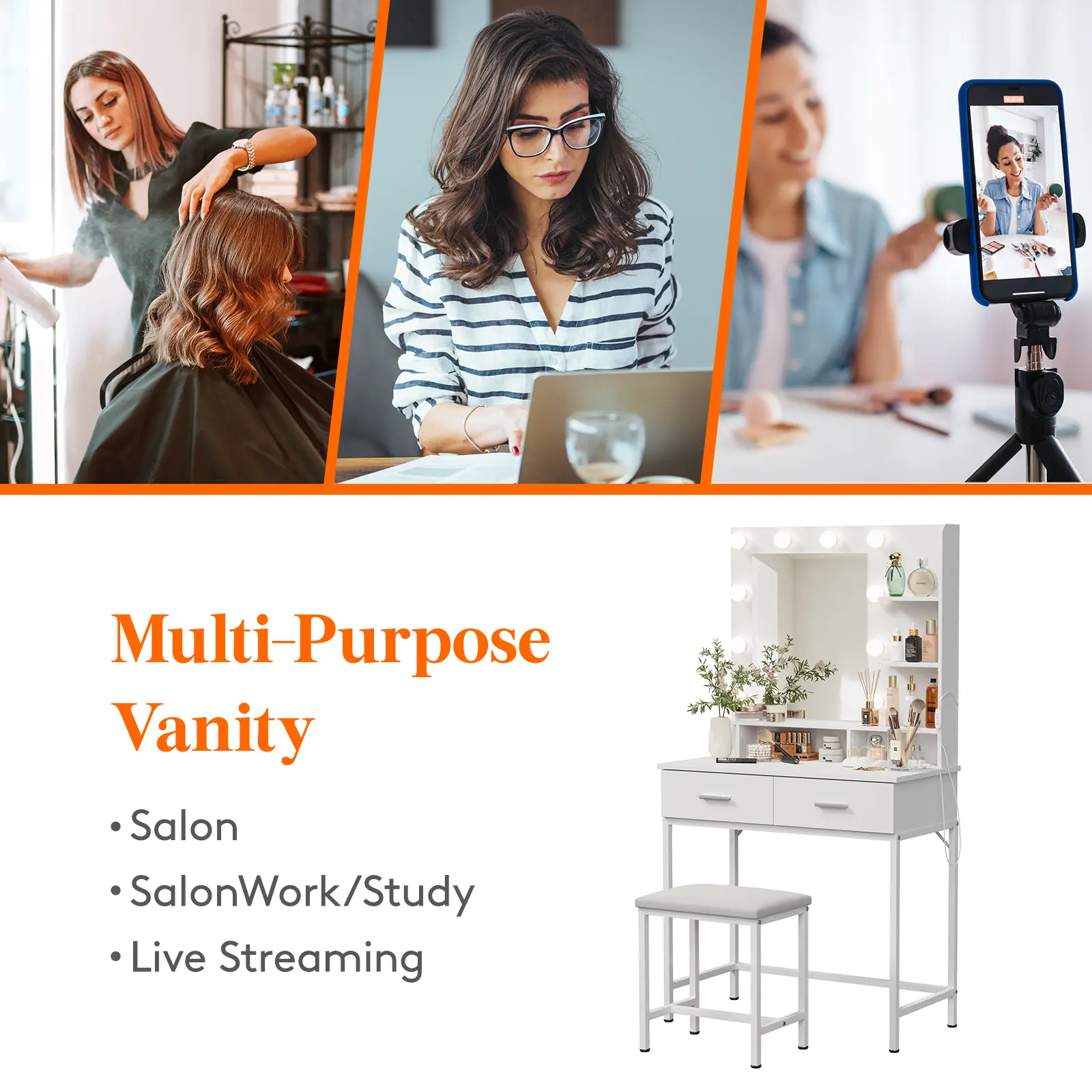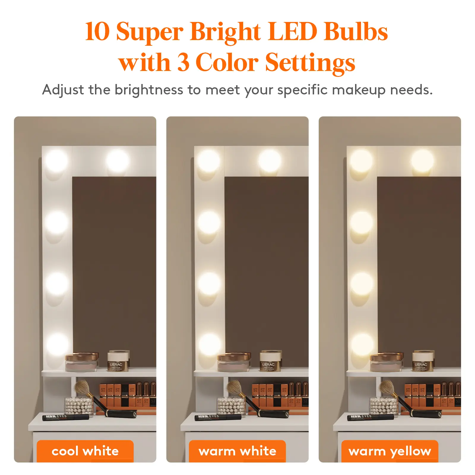 ·Mirror Vanity with Dimmable LightingExperience Hollywood-style makeup with our dimmable mirror vanity desk featuring 10 super bright LED bulbs. Choose from 3 color settings (cool white, warm white, warm yellow) and adjust brightness. Whether at home, in a salon, or live streaming, this vanity provides the perfect lighting for professional results.