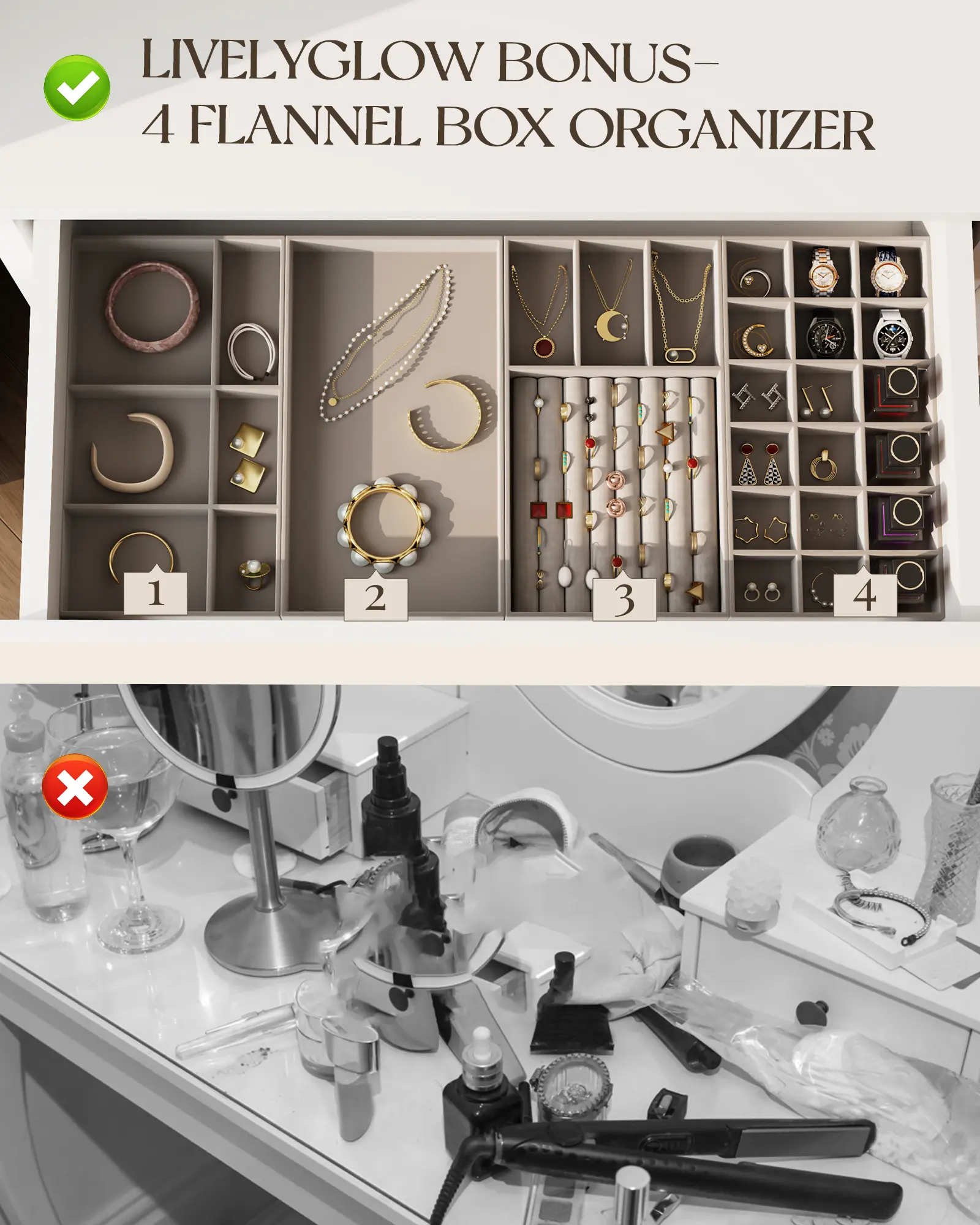 ·4 Flannelette Storage Boxes: Designed with four flannelette boxes in the drawer, including 6 rectangular storage grids, large rectangular storage box, and 8 rows of ring and stud accessories. This thoughtful design provides ample storage for your makeup, jewelry, and accessories.