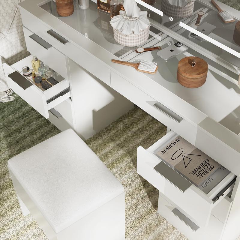 This vanity is a girls dream a girls best friend I sit at her date and night and do my work and my make up and my hair. It has so much space to store everything you need and more if I can have two of these in my room, I would.