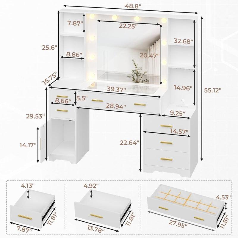 This 48.8-inch vanity desk features a spacious tabletop and 4 shelves. It holds your makeup essentials effortlessly. The 6 hooks organize bracelets and necklaces. The large vanity ensures your table stays tidy. Perfect for home organizing and interior aesthetics.