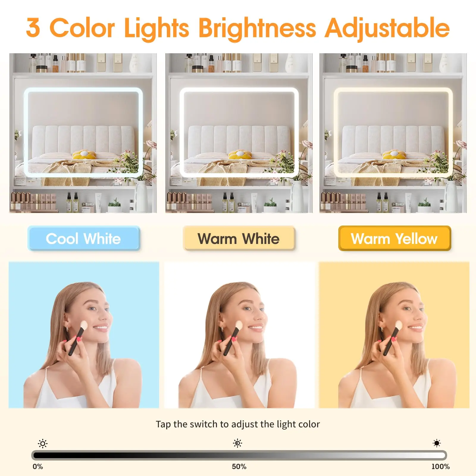 【3 Models Light & Adjustable Brightness】The glamorous vanity mirror comes with bright but not blinding LED lights in 4 color modes, warm yellow, warm white and cold white, and features a new high sensitivity smart sensor switch to control the LED lights, adjusting the lightness or darkness according to the desired level of brightness