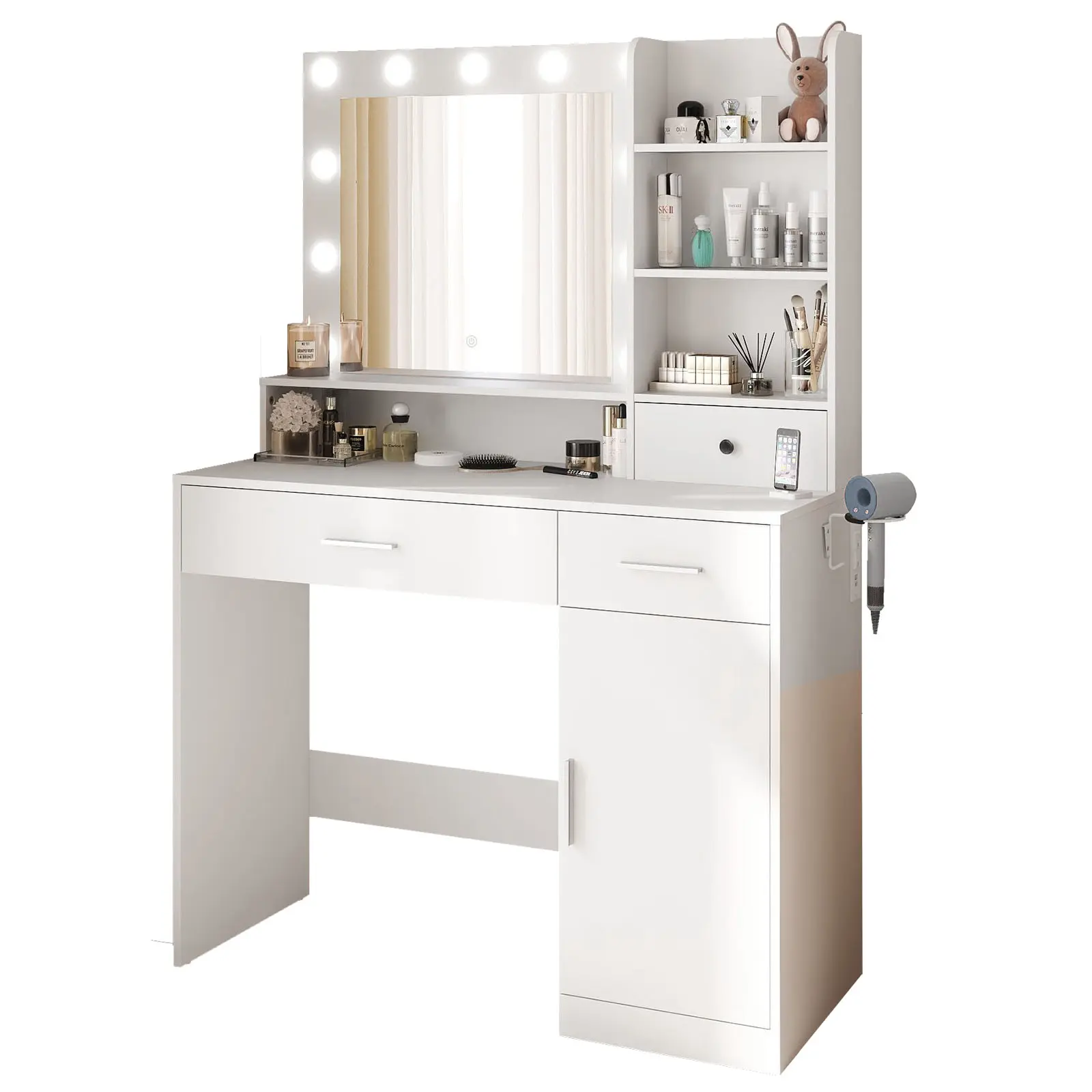 Vanity Desk with Adjustable Lighten Mirror & Power Outlet, Makeup Desk for Bedroom with a Storage Stool and 3 Drawers, 6 Storage Shelves, White Dresser for Girls