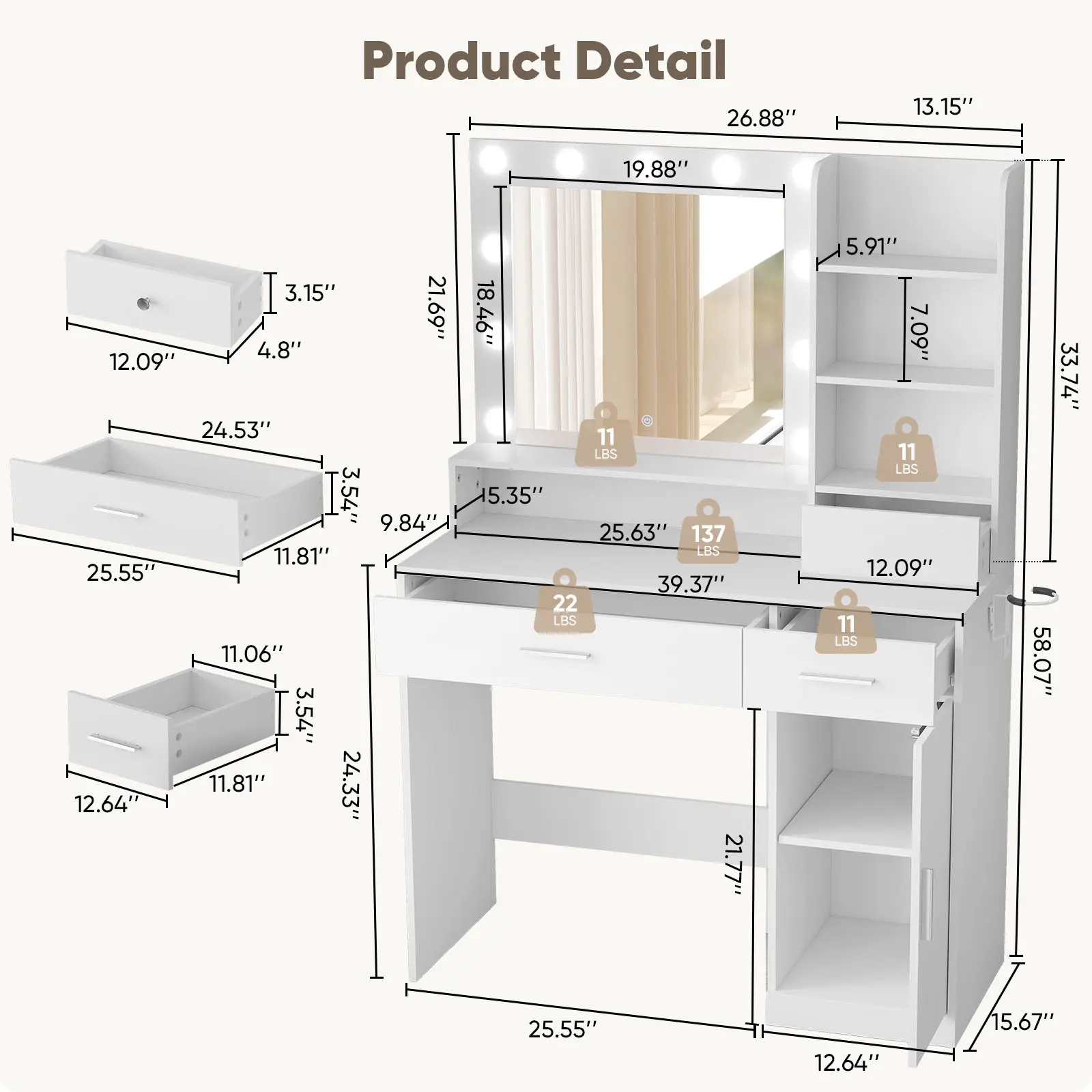 ·Convenient Charging: Equipped with 2 sockets and 2 USB ports, the vanity table allows you to charge your phone or other electronic devices easily. The power cord is 145cm long, providing added convenience.