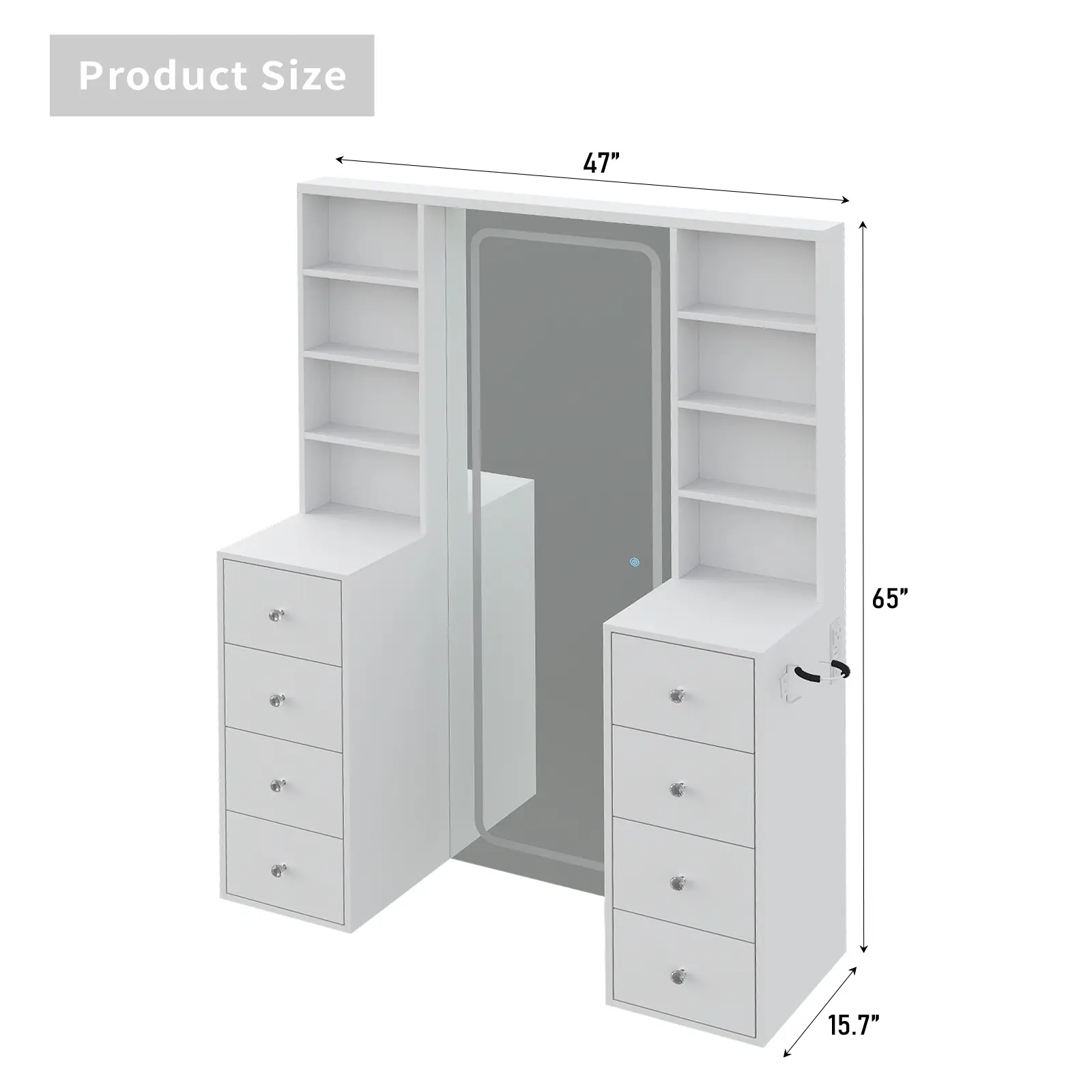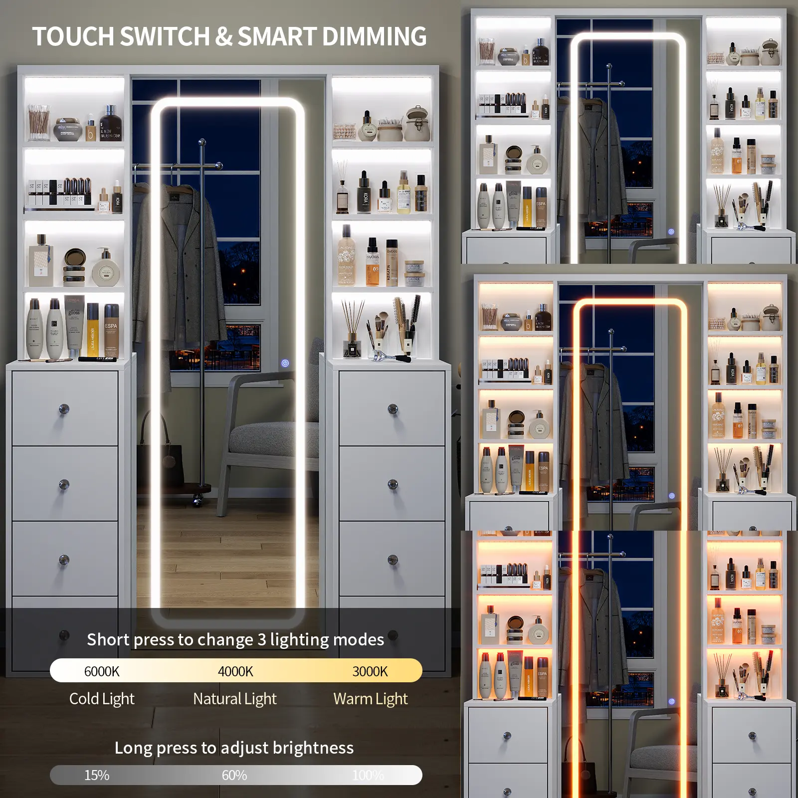 Vanty with Full-Length Mirror Perfection: Admire your full look with our 65" full length LED mirror that featuring ultra-clear HD glass. The smooth line add modern elegance while providing a distortion-free reflection, allows you to check your outfit immediately after putting on makeupperfect for makeup, styling, and outfit coordination