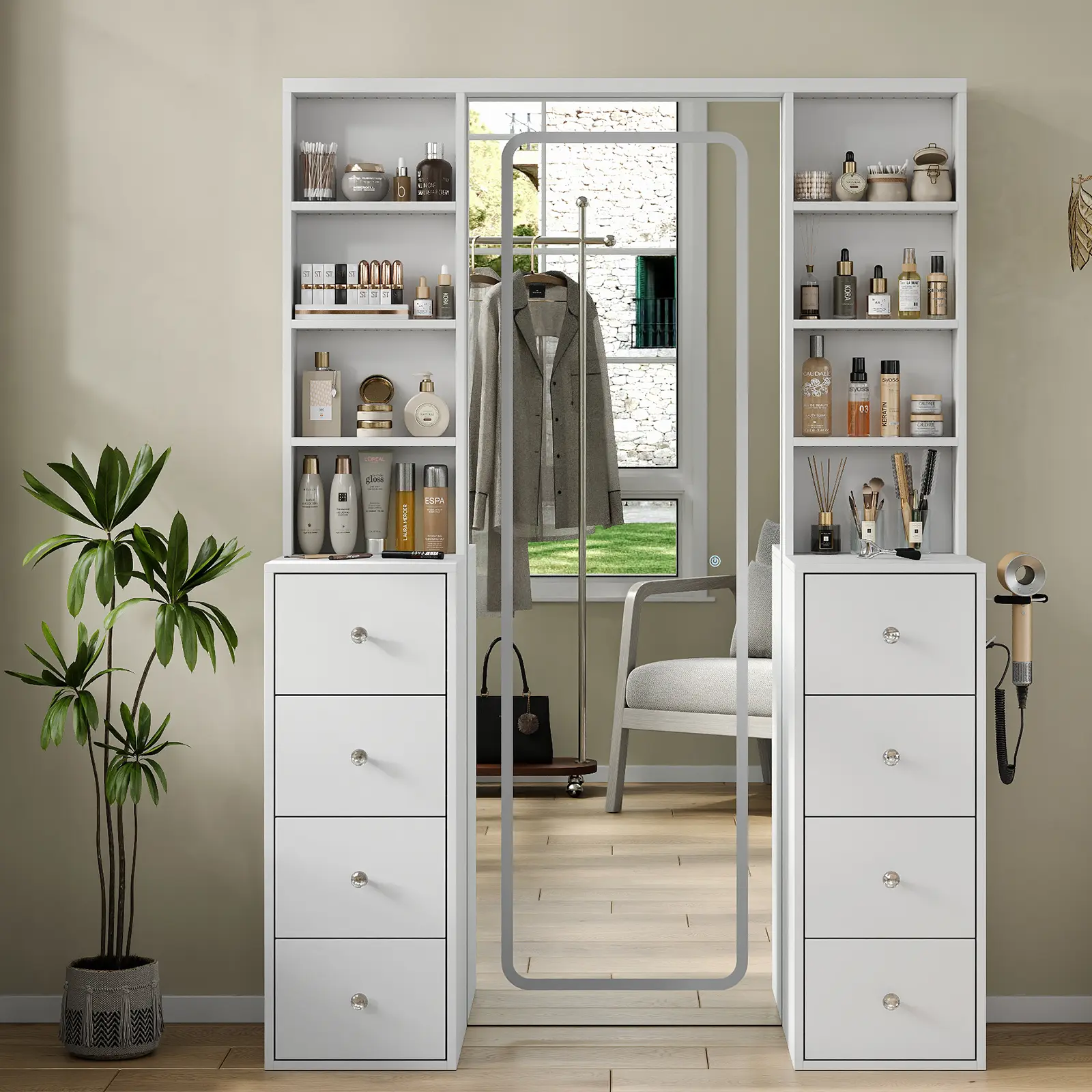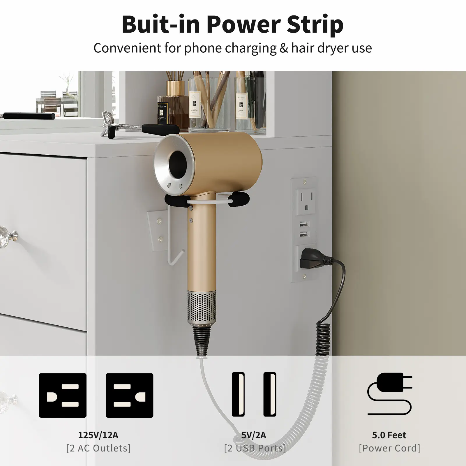 Built-In Power for Your Routine: This makeup vanity comes with a hair dryer stand and charging station, including 2 standard plug sockets and 2 USB ports to connect your hair dryer, curling iron, computer, mobile phone. Everything stays charged and within reach for a seamless beauty routine