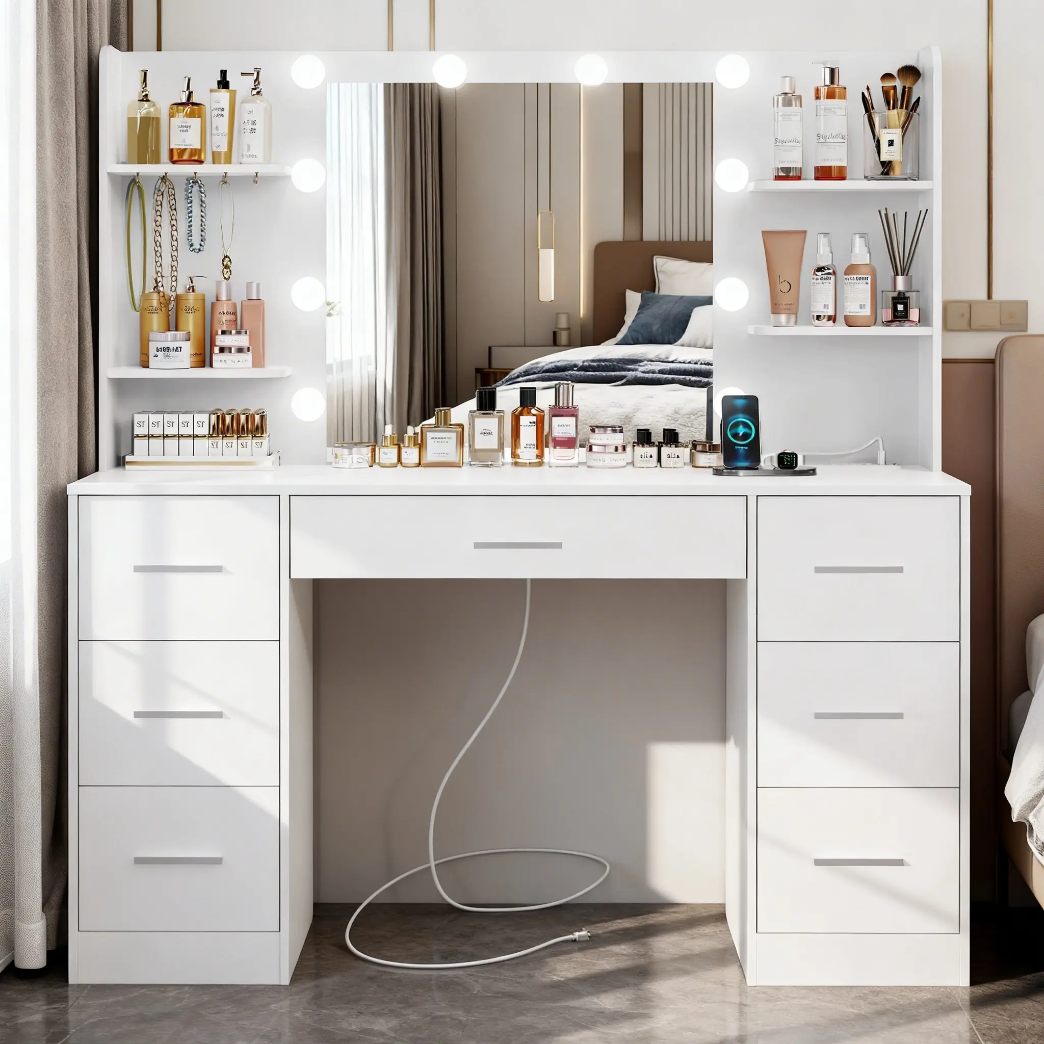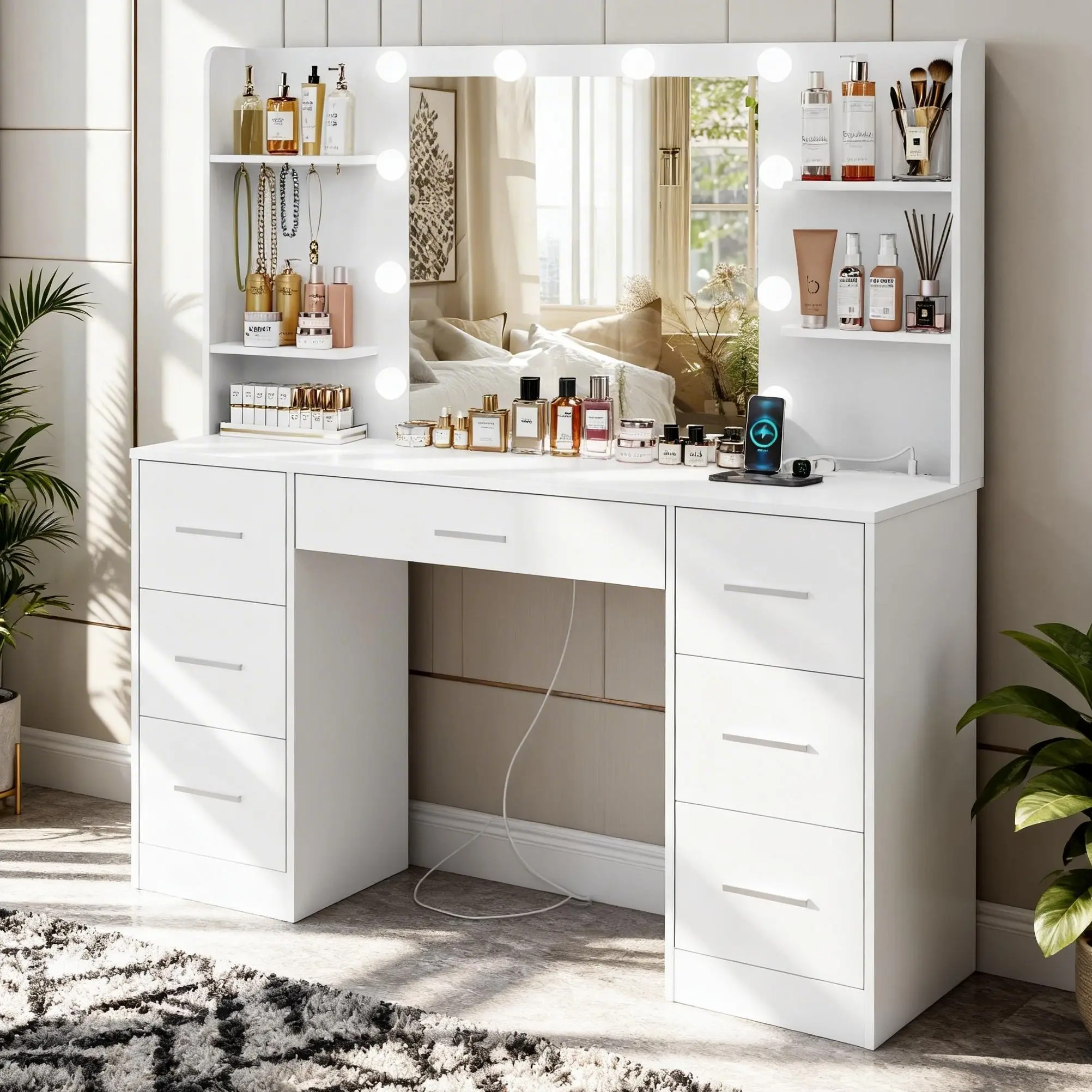 Dream Vanity Table Set with LED Lights 7 Drawers Power Outlet Adjustable Brightness Easy Assembly Durable Design Super Bright Lighting Solution Perfect for Bedroom Makeup RoutineDream Vanity Table Set with LED Lights 7 Drawers Power Outlet Adjustable Brightness Easy Assembly Durable Design Super Bright Lighting Solution Perfect for Bedroom Makeup Routine