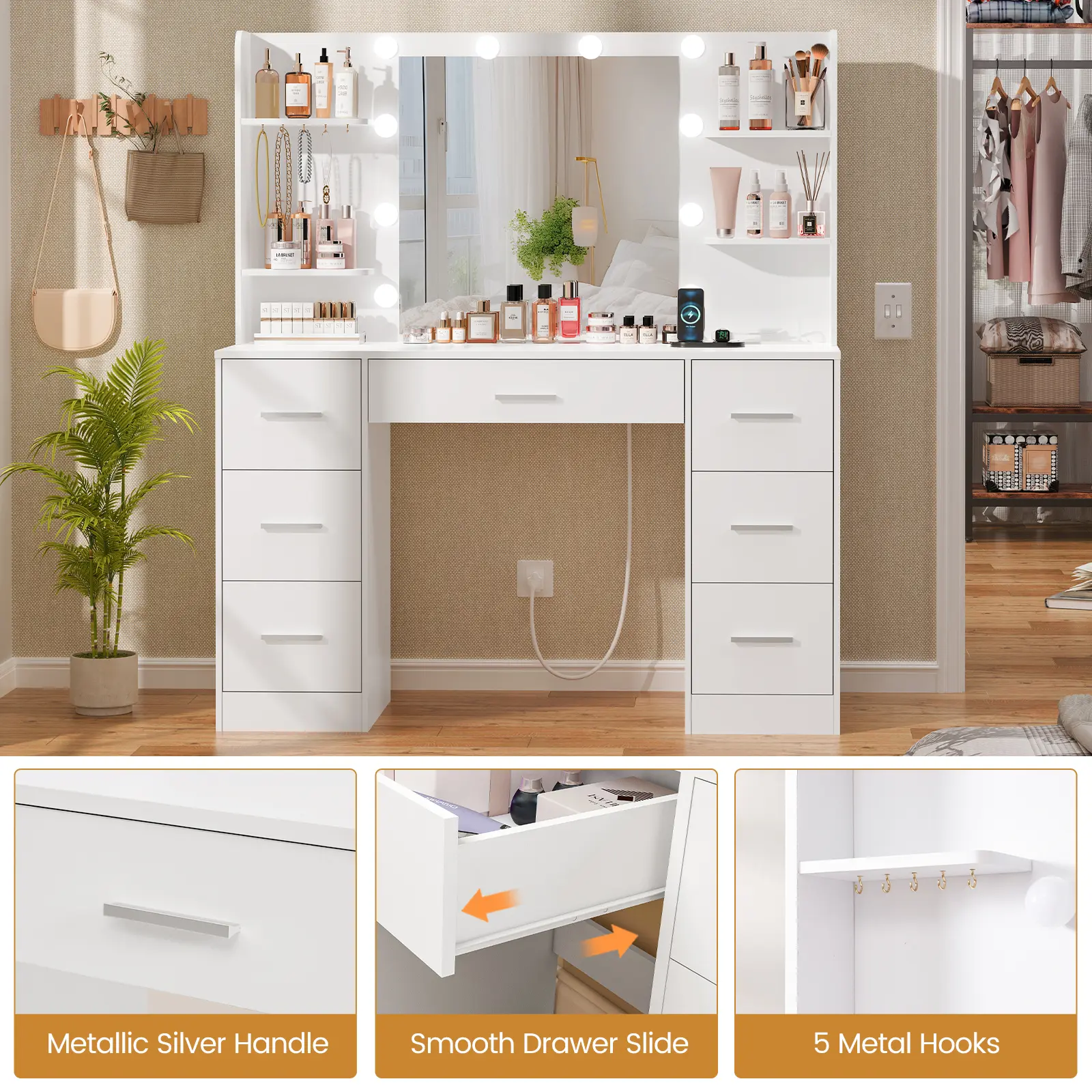 5. Dream Vanity Table Set with LED Lights 7 Drawers Power Outlet Adjustable Brightness Easy Assembly Durable Design Super Bright Lighting Solution Perfect for Bedroom Makeup Routine