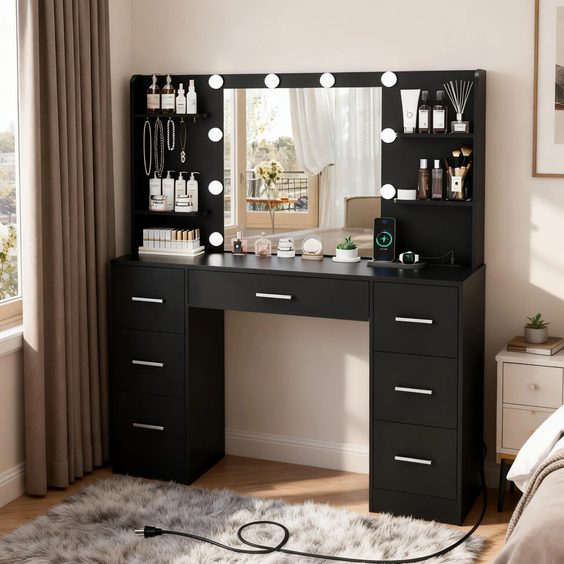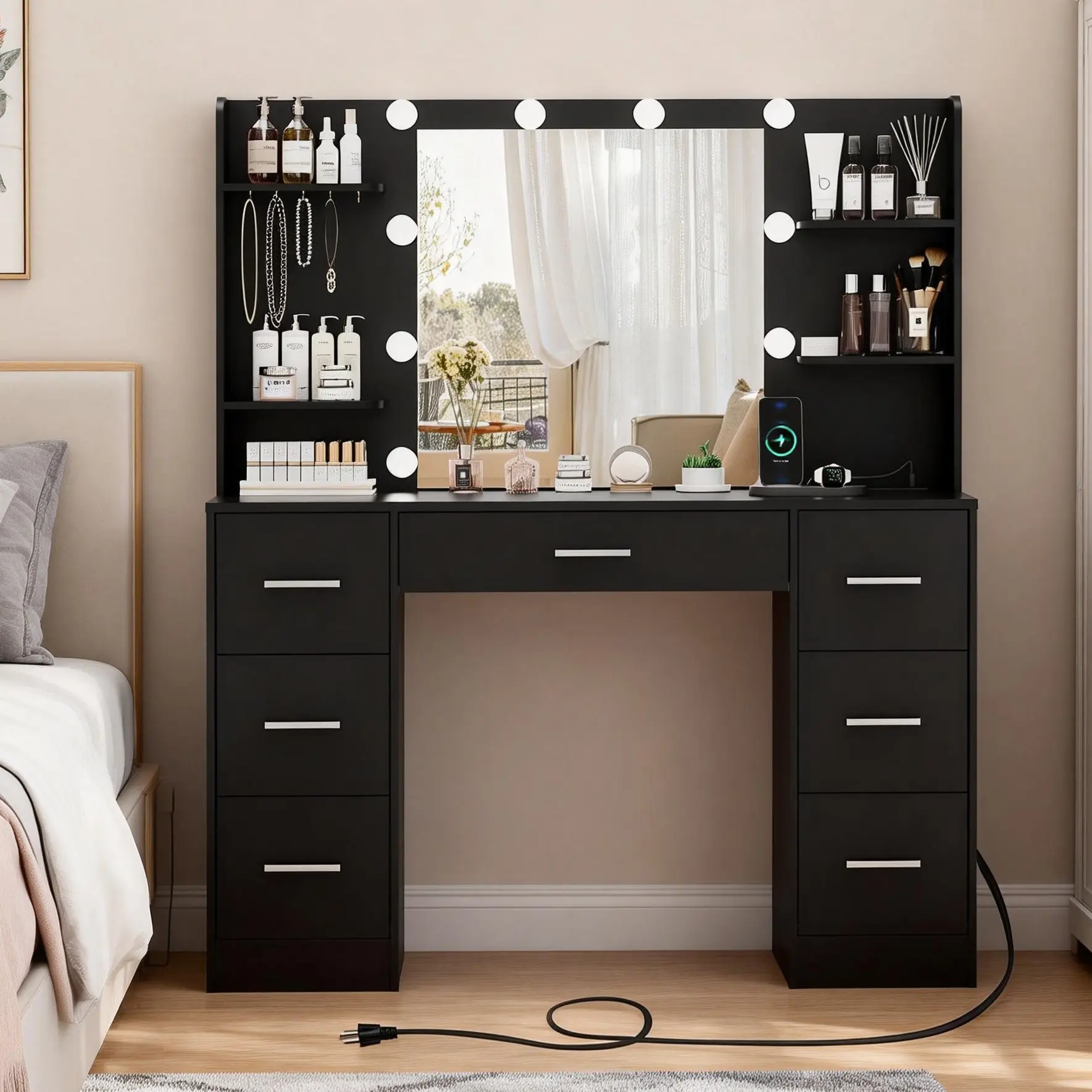 ✨ Enhance Your Makeup Routine ✨ Elevate your makeup game with this dream vanity table. It features a built-in power outlet, ample storage space, and 7 drawers. The set is easy to assemble, ensuring a sturdy and durable setup. Perfect for any bedroom, it combines functionality with style. Say goodbye to cluttered desks. This vanity set enhances the room's charm, making it a beautiful dressing station.
