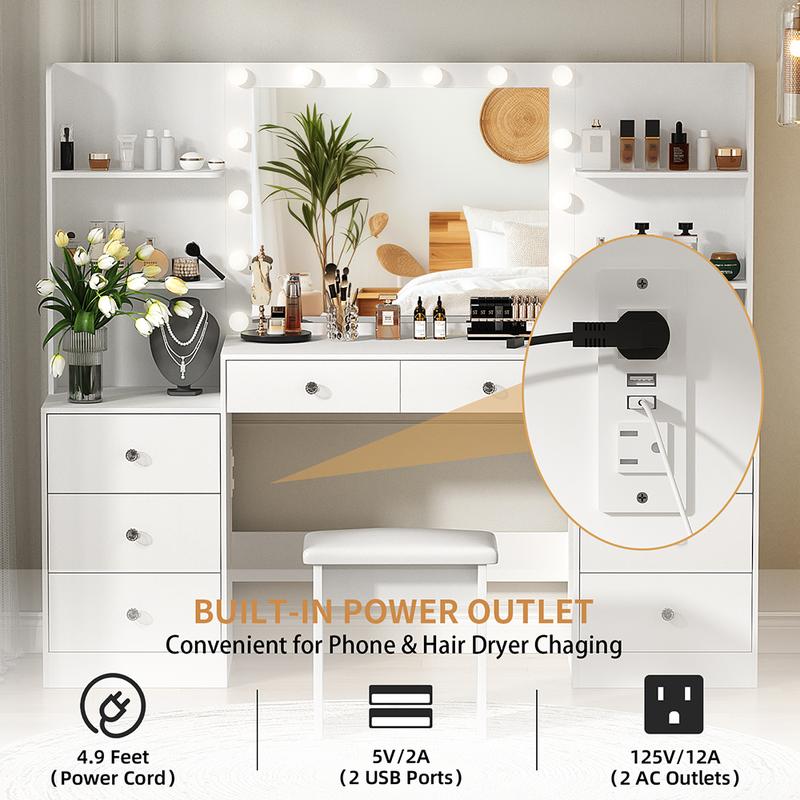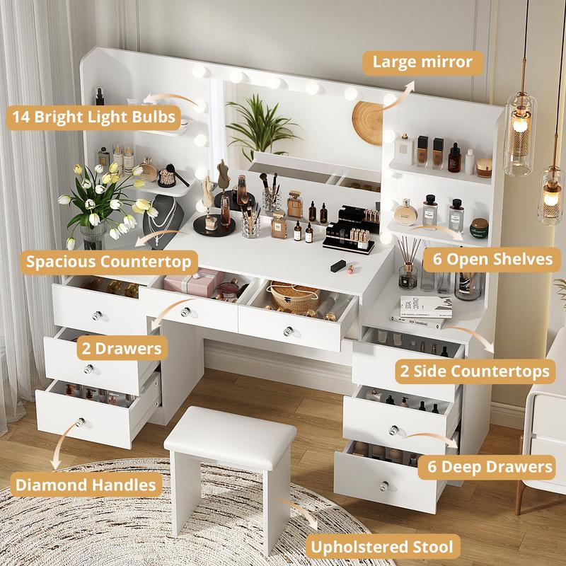 AMAZING STORAGE SPACE: A dream vanity, with 8 drawers and 4 shelves with plenty of space,it can perfectly hold all your cosmetics and jewelry without clutter, making your daily beauty routine easier and faster.