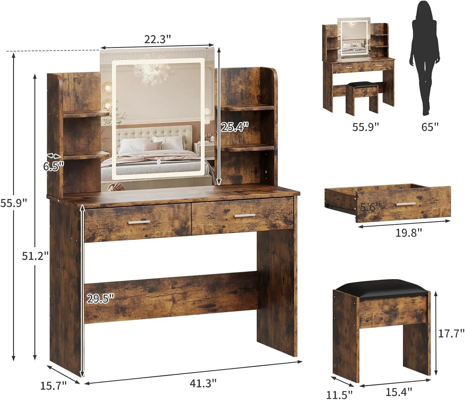 【Large Storage Space】Featuring 6 storage shelves, 2 large drawers, and a spacious tabletop, this makeup vanity ensures that storage space is readily available at your fingertips. Keep all your beauty products and jewelry neatly organized and easily accessible while applying makeup.