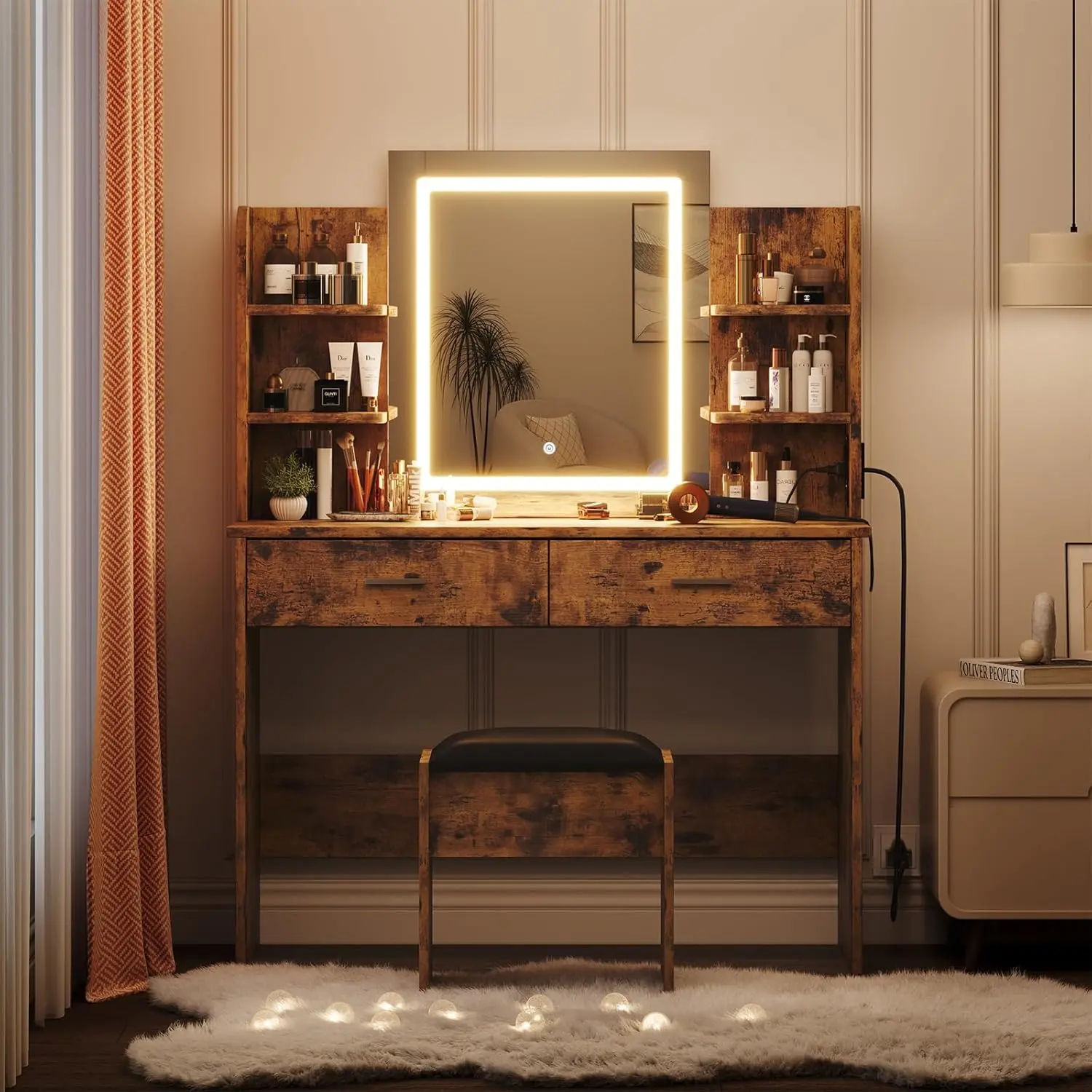 【Convenient Charging Station】quipped with 2 standard outlets and 2 USB ports, this makeup vanity desk with lights makes it easy to connect your hairdryer and curling iron, as well as charge your phone, tablet, or other devices. Get picture-perfect selfies after finishing your makeup with ease.