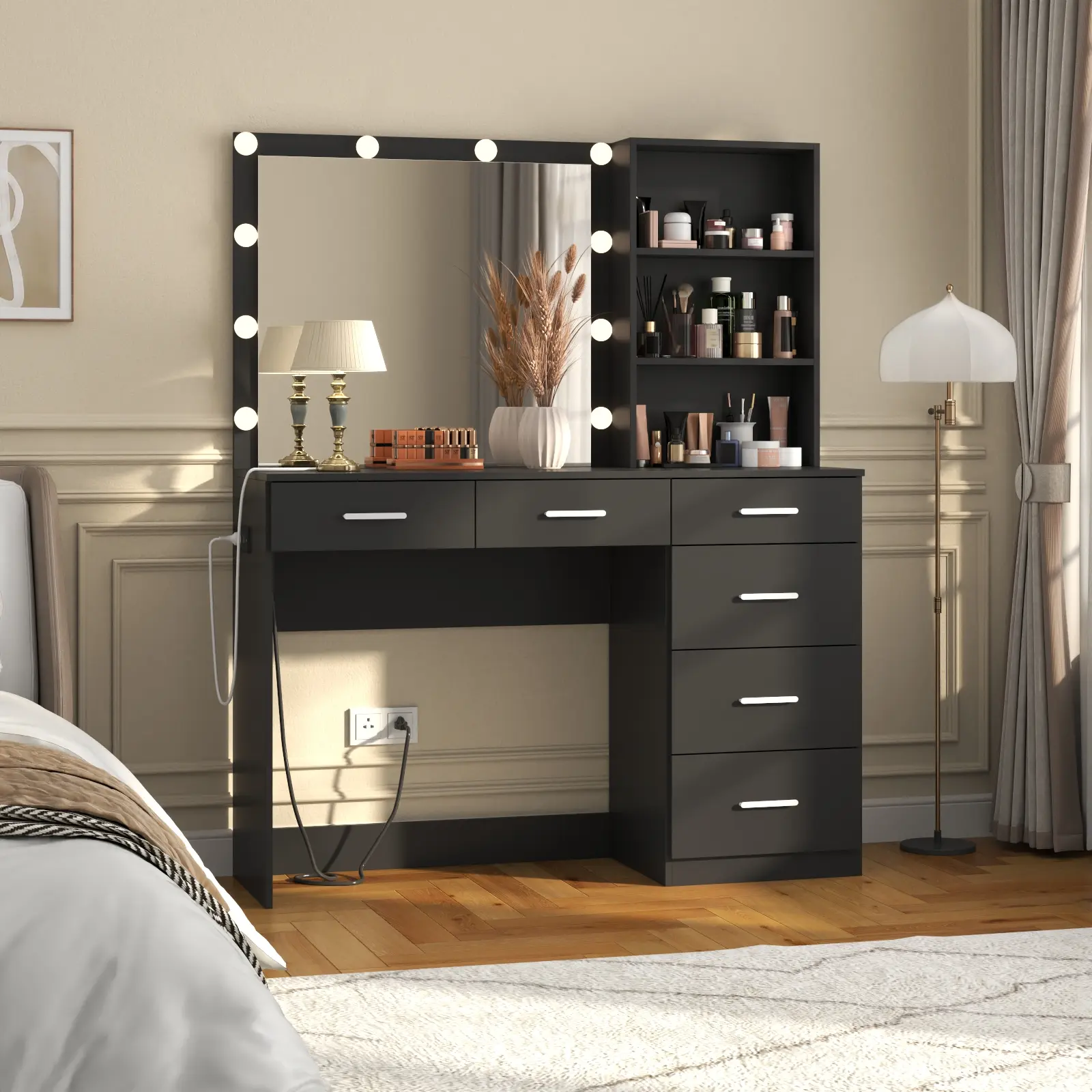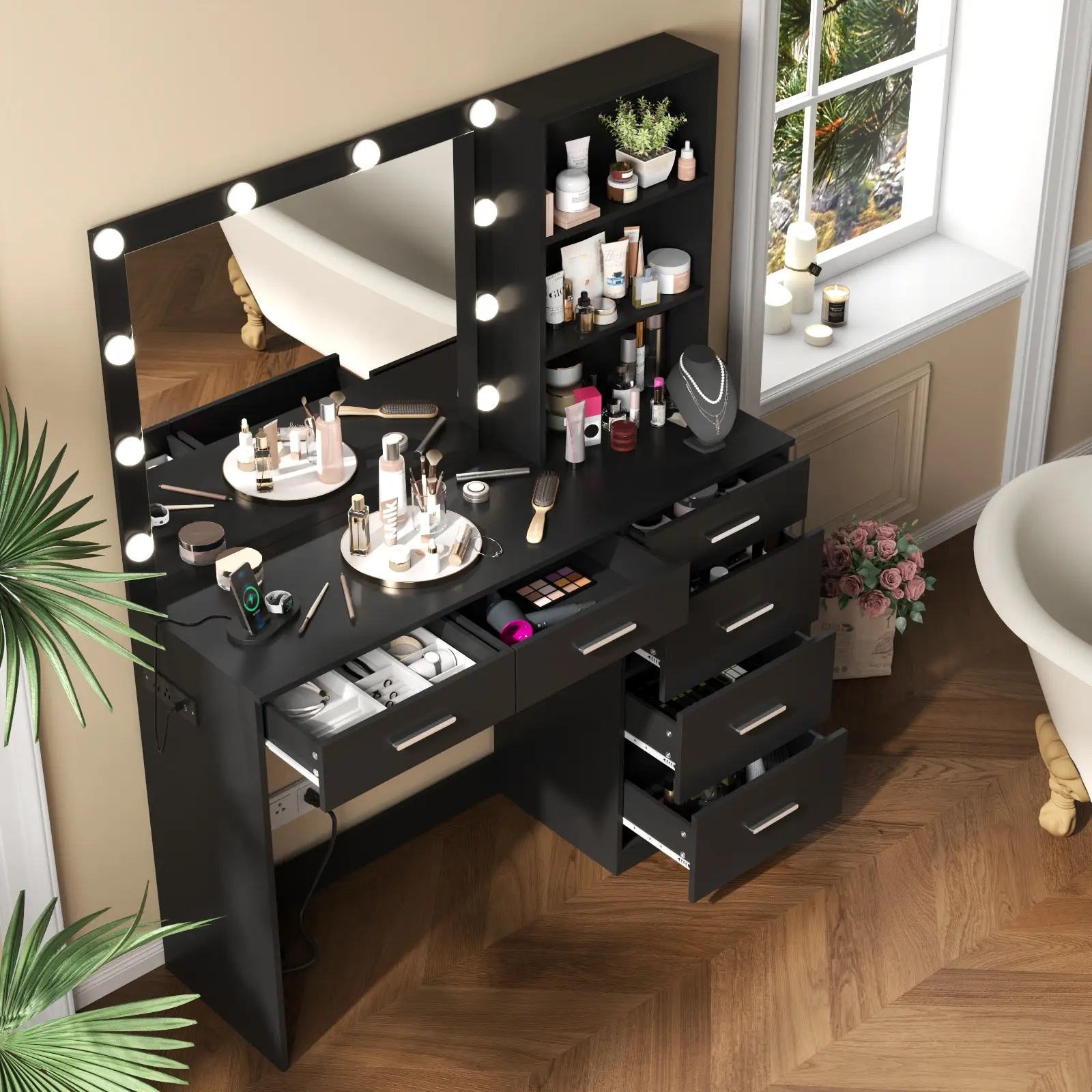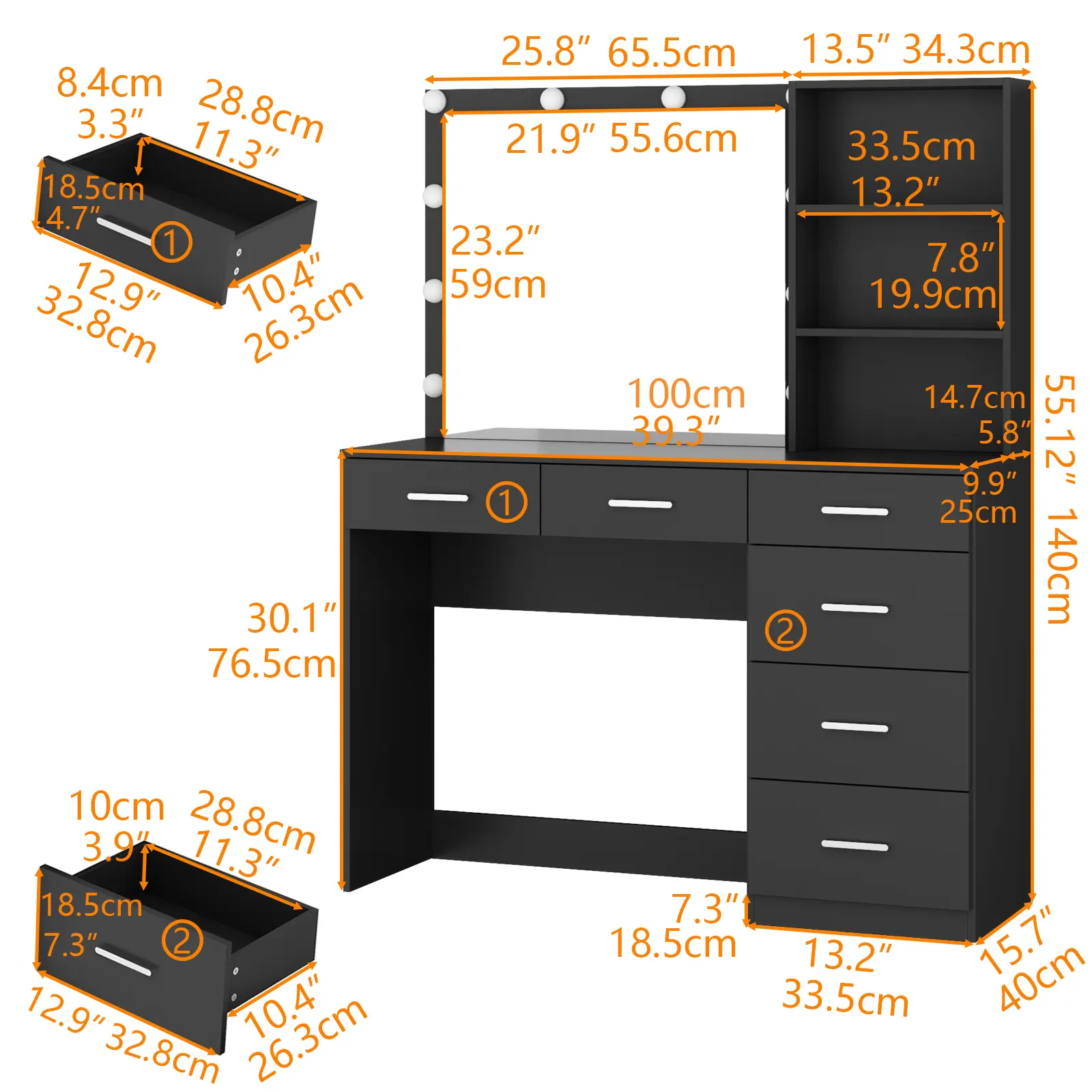 ·ELEGANT DESIGN WITH ABUNDANT STORAGE SPACE - This dressing table has an elegant design with plenty of storage space. It looks sleek and stylish, with drawers that have silver handles, enhancing its overall aesthetic. It has six spacious drawers, making it easy for you to organize and store your cosmetics. Additionally, the right side of the vanity has three-tier open storage spaces, ensuring convenient access to all your essentials whenever you need them.