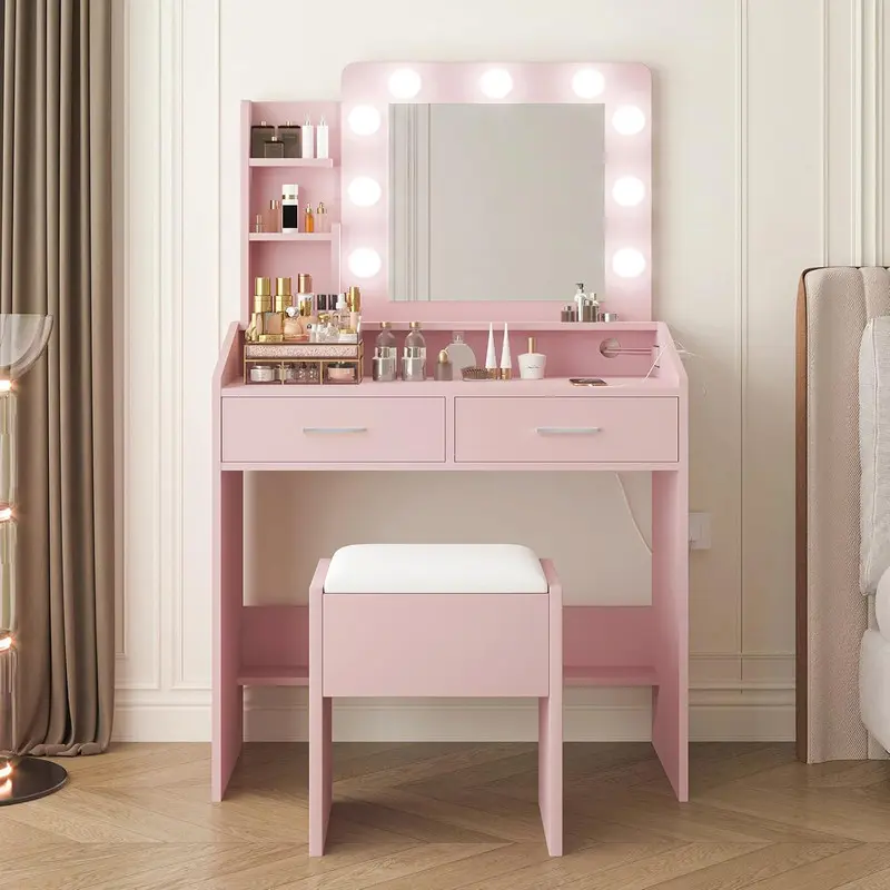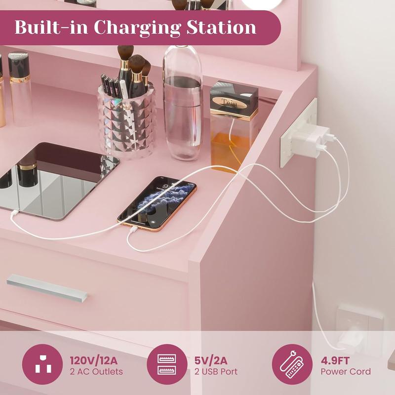 3.With Charging Station - This makeup vanity desk with lights has a power outlet on the right side, including 2 AC outlets and 2 USB ports, which can easily connect a hair dryer and curling iron, and can also charge your phone, tablet or other electronic devices, convenient and practical