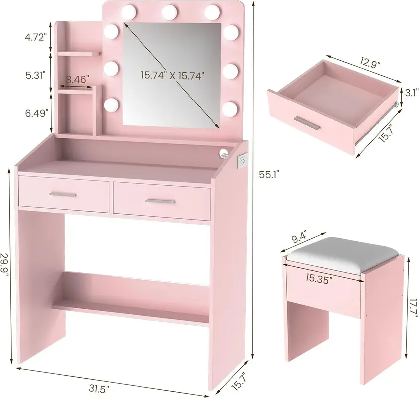 4.Upholstered Stool - Our small vanity desk power outlet is also specially equipped with an upholstered stool, you can comfortably sit on it to do your makeup, giving you a comfortable experience. Meanwhile, the makeup vanity table is made of sturdy MDF, with smooth and easy-to-clean surface, durable and elegant, you deserve it