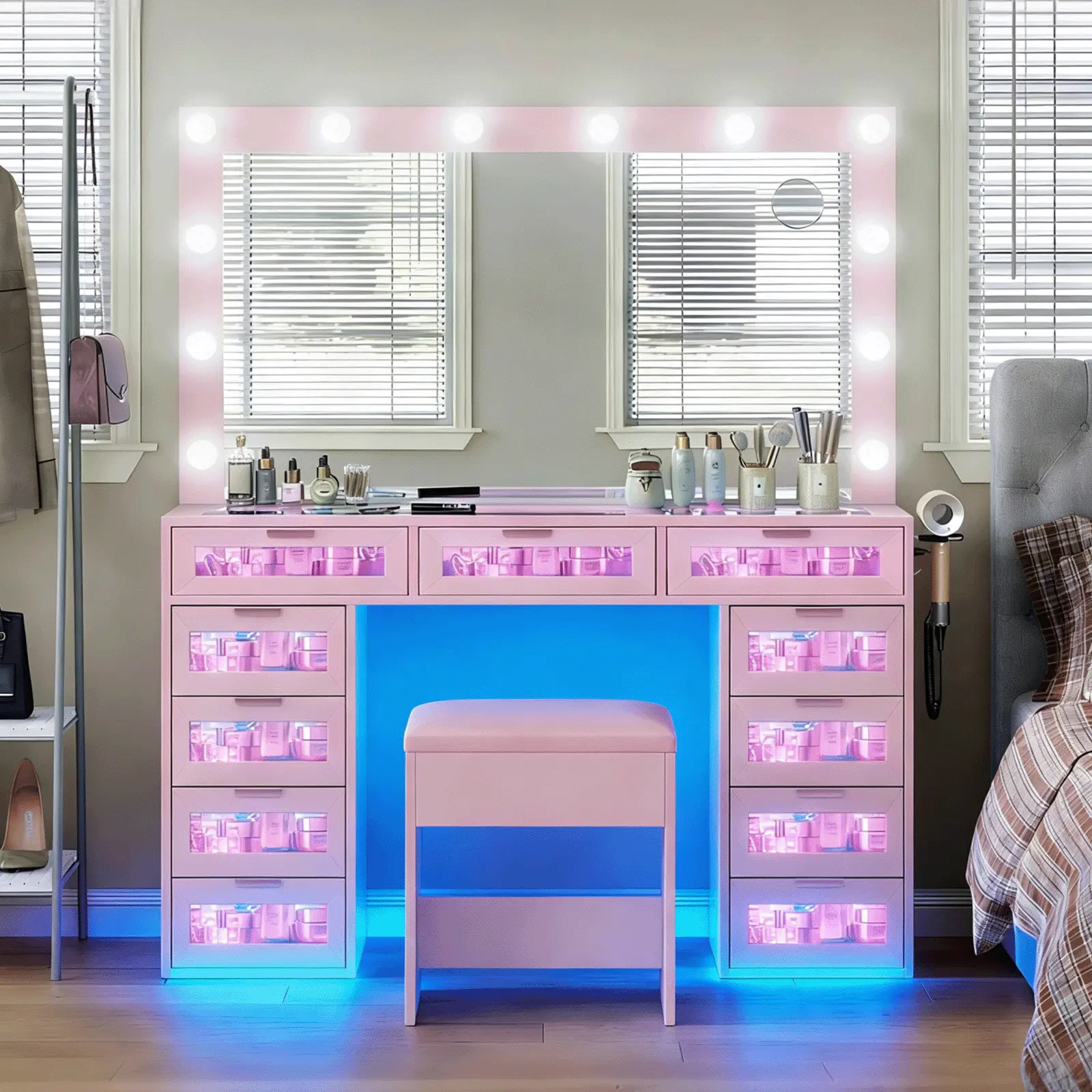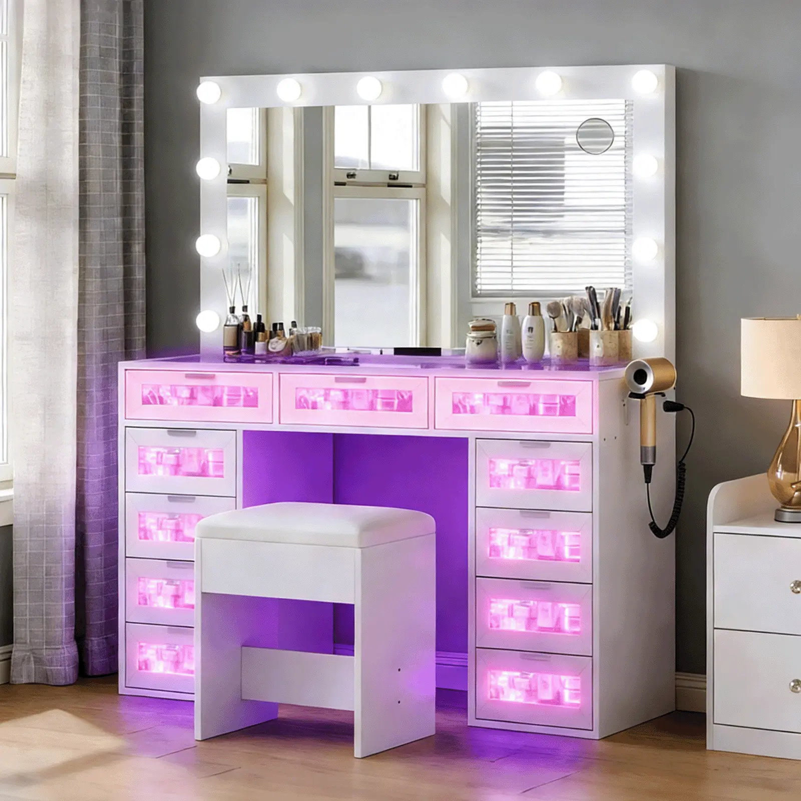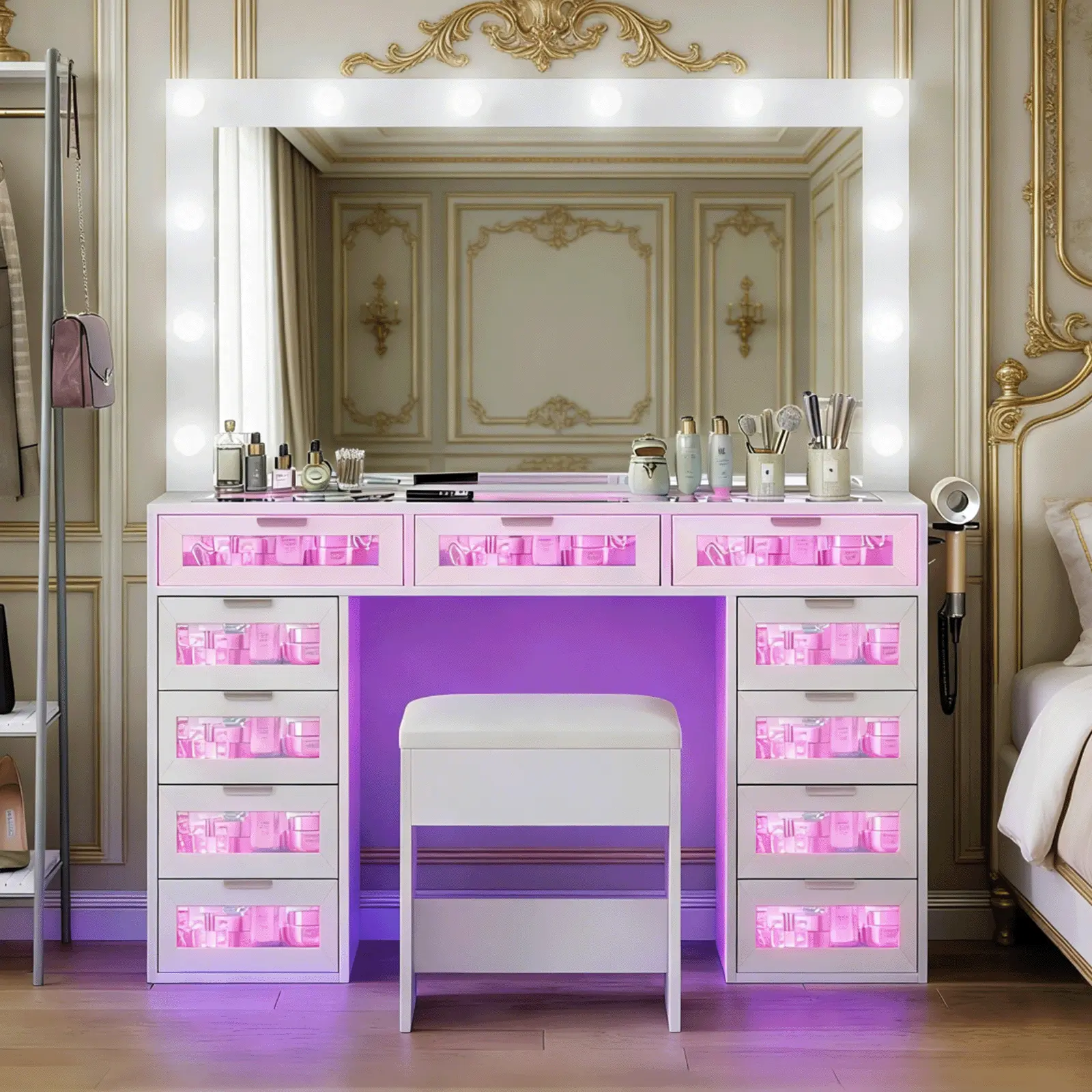 This vanity set features a large Hollywood-style mirror with 12 dimmable LED bulbs, paired with 11 spacious drawers. It offers ample storage for skincare, cosmetics, jewelry, styling tools, and more. The high-gloss pink finish and tempered glass tabletop blend style with practicality.