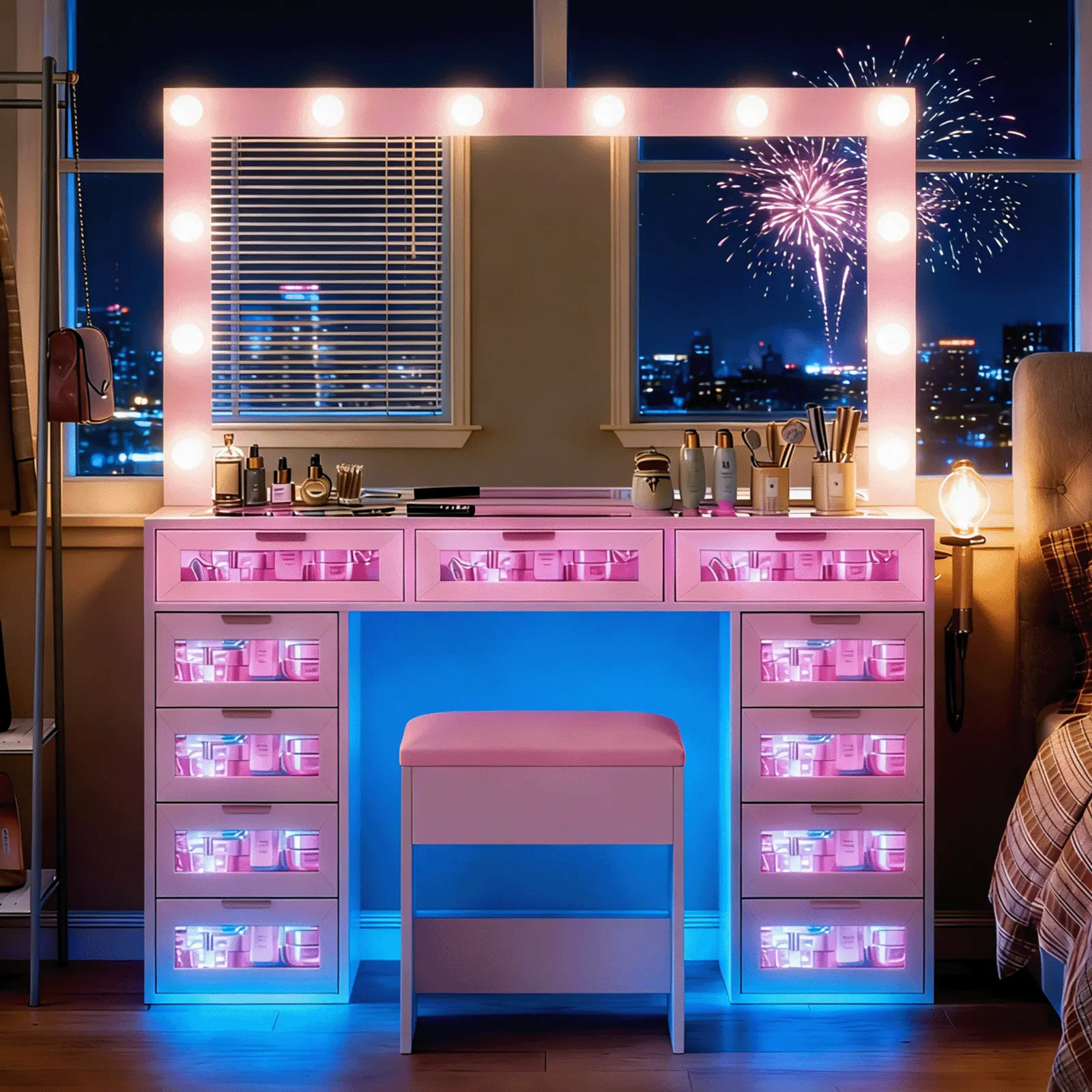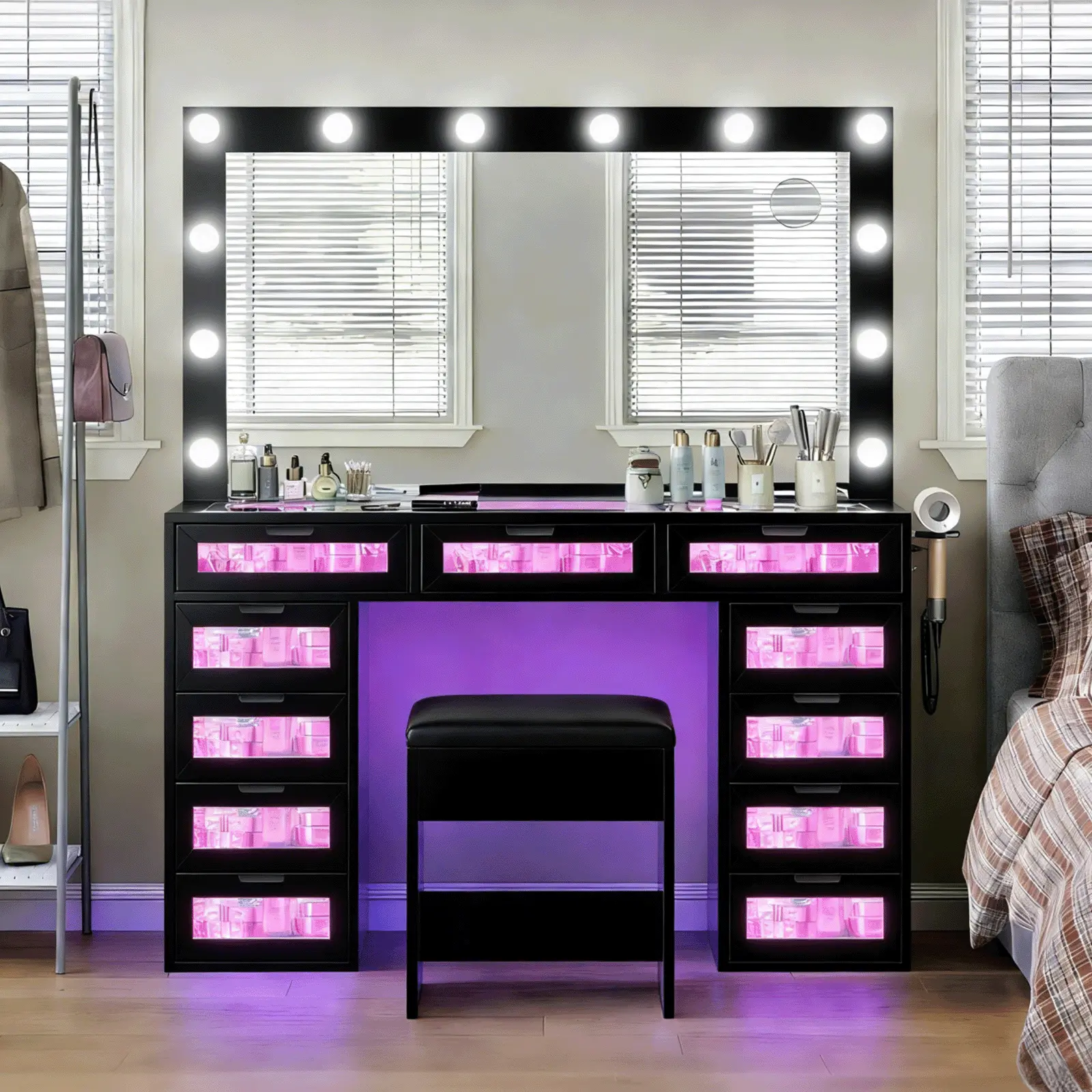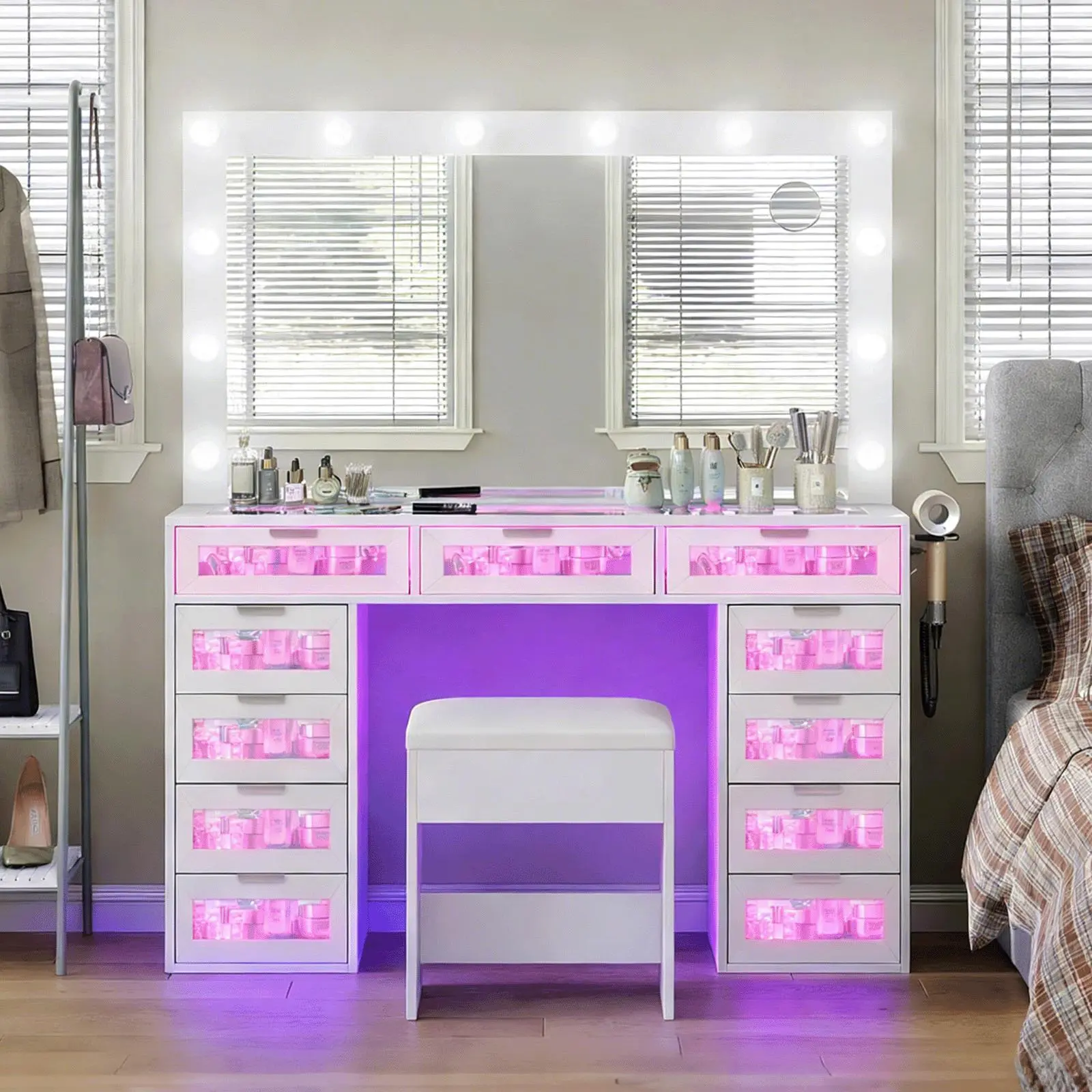 This vanity set features a large Hollywood-style mirror with 12 dimmable LED bulbs, paired with 11 spacious drawers. It offers ample storage for skincare, cosmetics, jewelry, styling tools, and more. The high-gloss pink finish and tempered glass tabletop blend style with practicality.