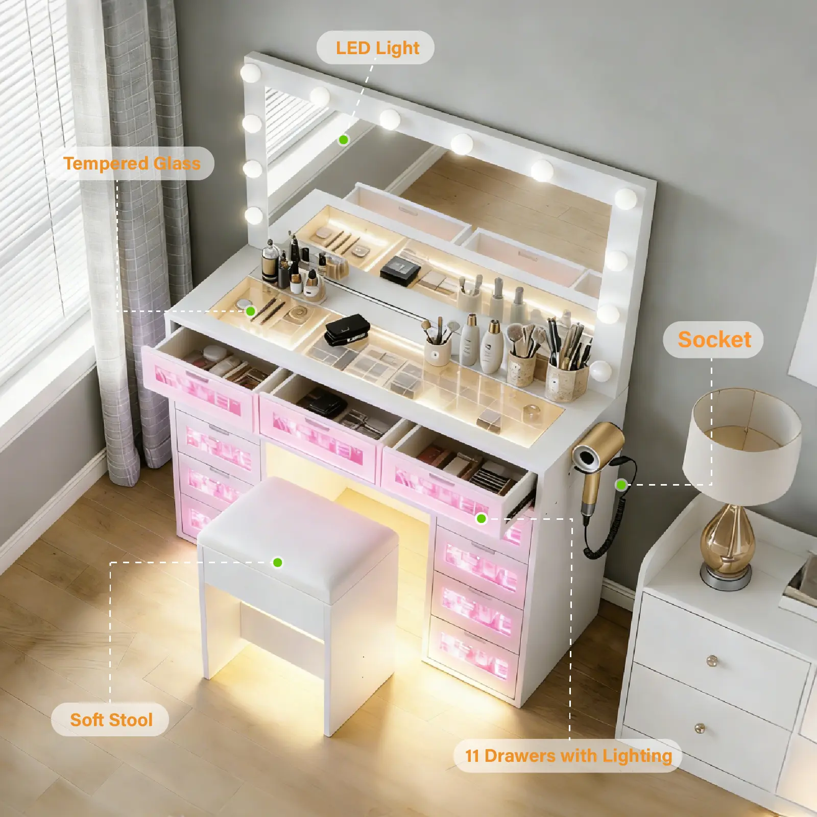 Designed for daily convenience, this vanity features a tempered glass tabletop that's easy to clean, illuminated drawers for quick access to your essentials, a built-in charging station for your hairdryer and devices, and a plush, padded stool for comfortable seating.