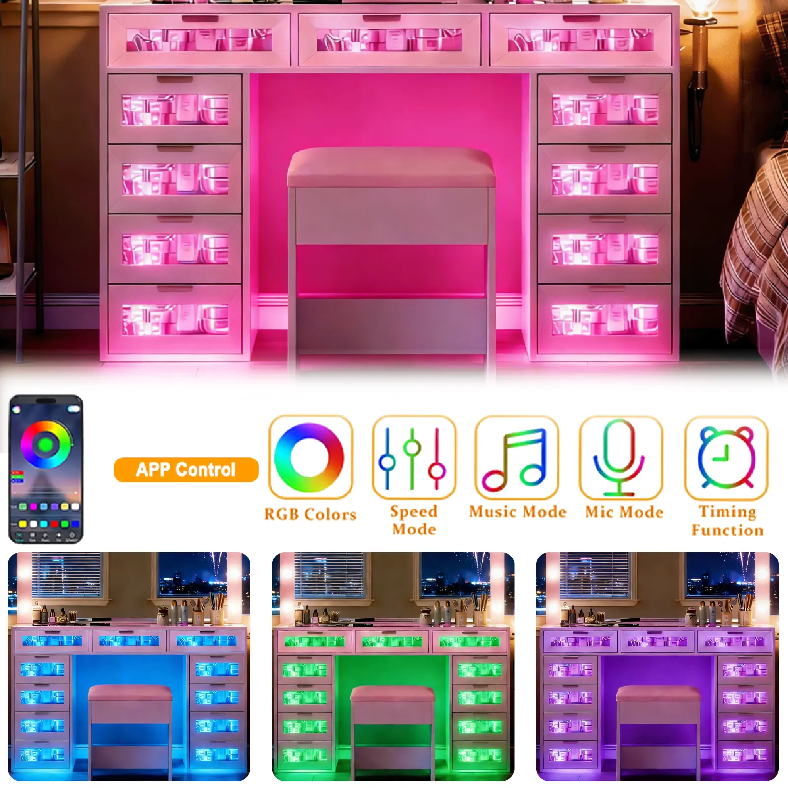 Customize your lighting with 3 color modes (warm yellow, warm white, cold white) and adjustable brightness. The Hollywood mirror provides studio-quality illumination for flawless makeup applications, while the RGB strip lights under the desk add a vibrant, personalized touch to your space.