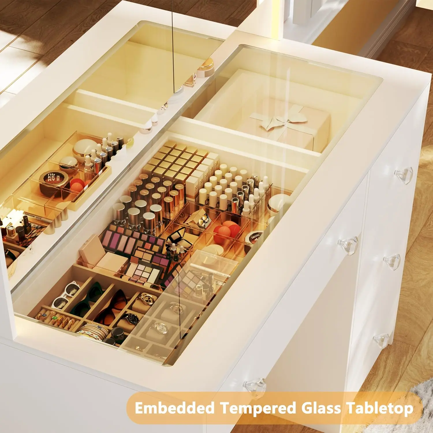·Makeup Vanity with Glass Top: With a tempered glass top that is sleek, modern, and aesthetic. It is not only can be a great way to showcase your jewelry and cosmetics, easy to find what you want but also can brighten up your bedroom because of its contemporary look.