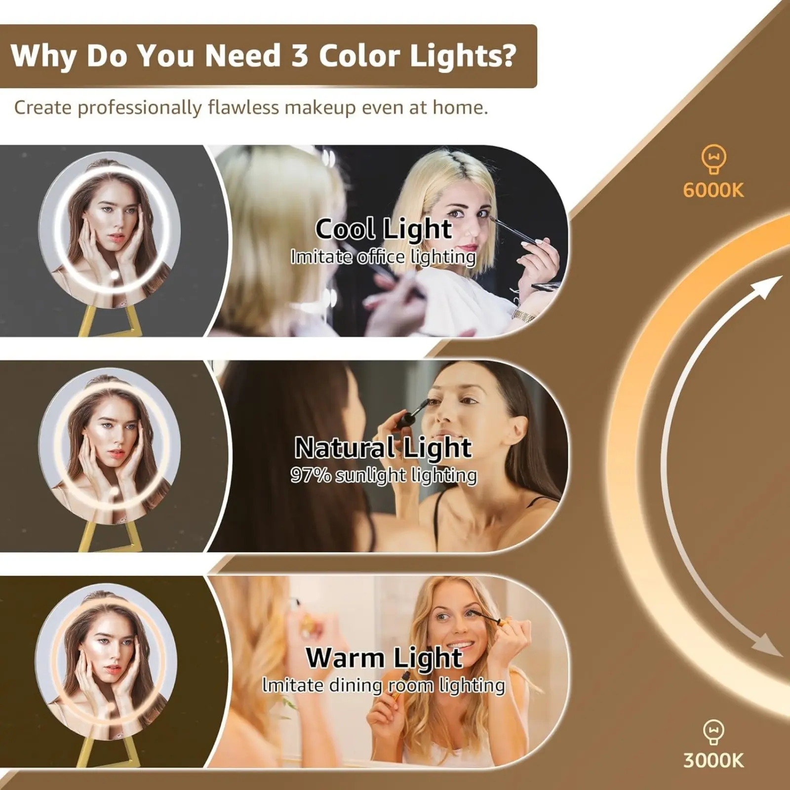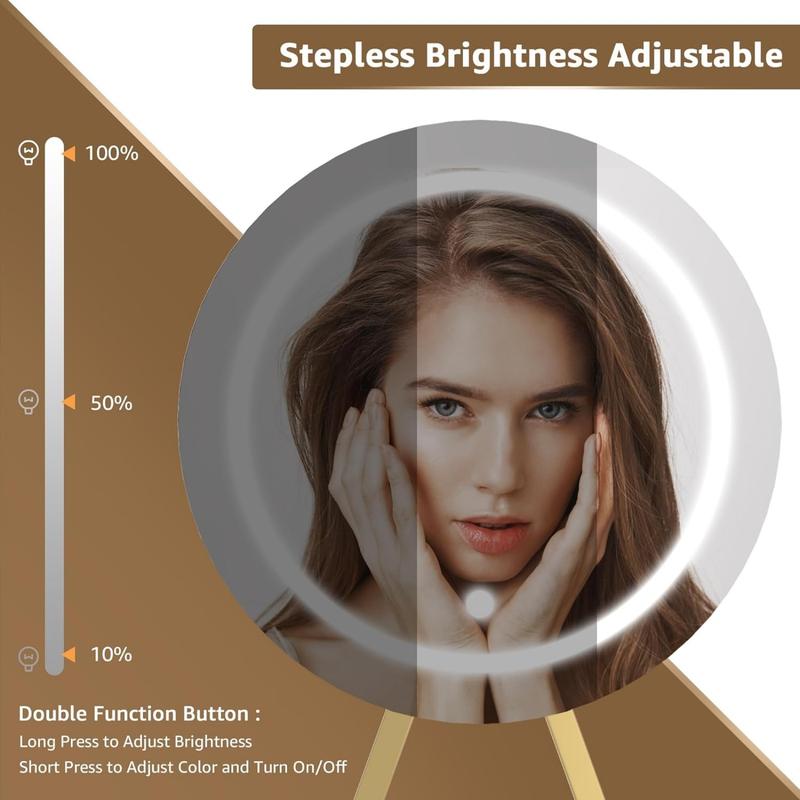Vanity Mirror with Lights: Our round mirror with built-in LED lights offers soft, balanced illumination, making it easy to achieve flawless results. Enjoy 3-mode lighting that mimics natural daylight, office and dinning room lighting, helping you feel confident and look your best