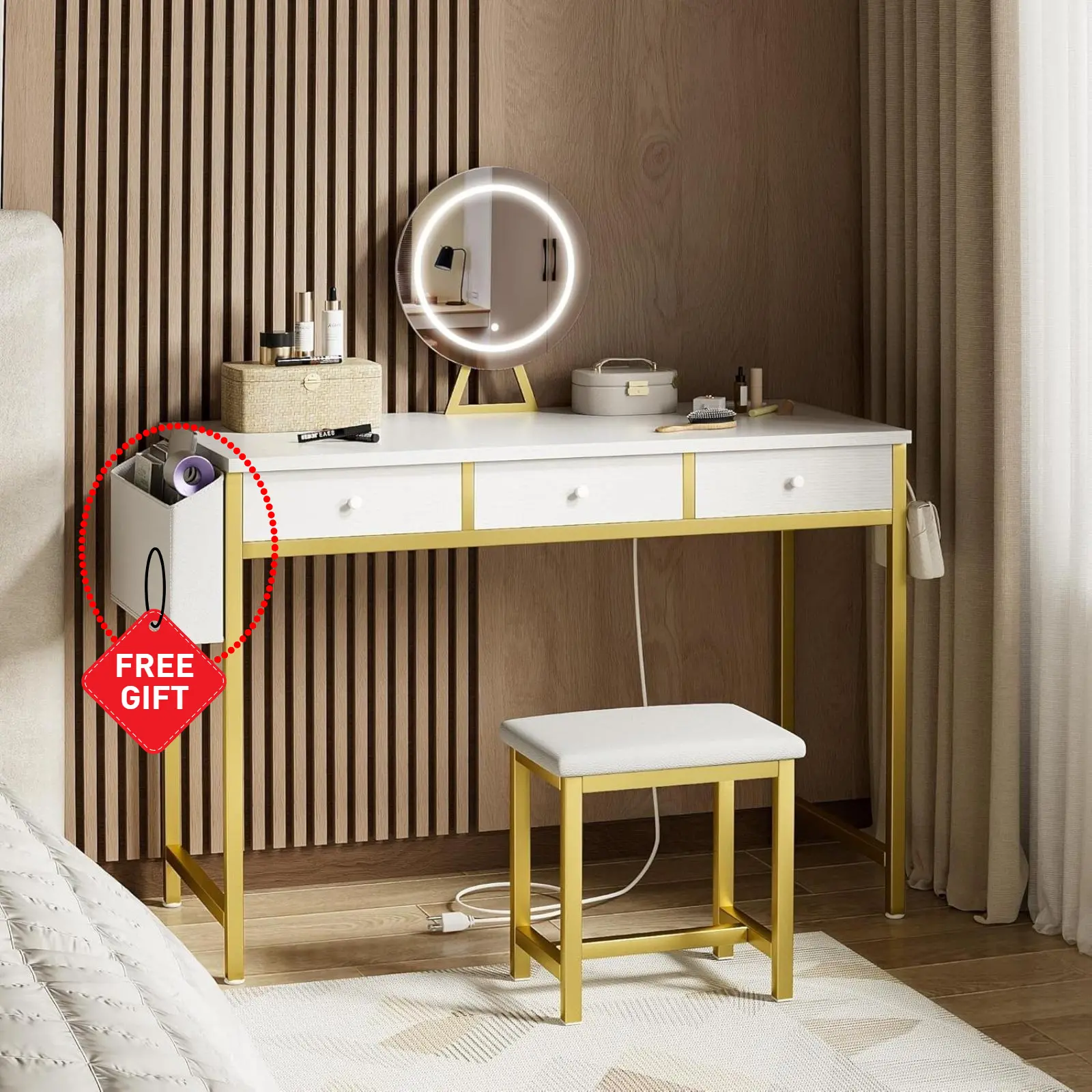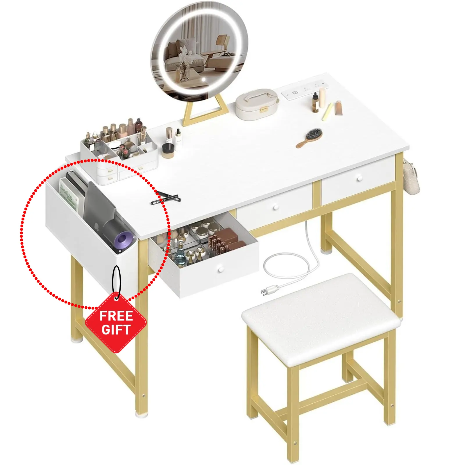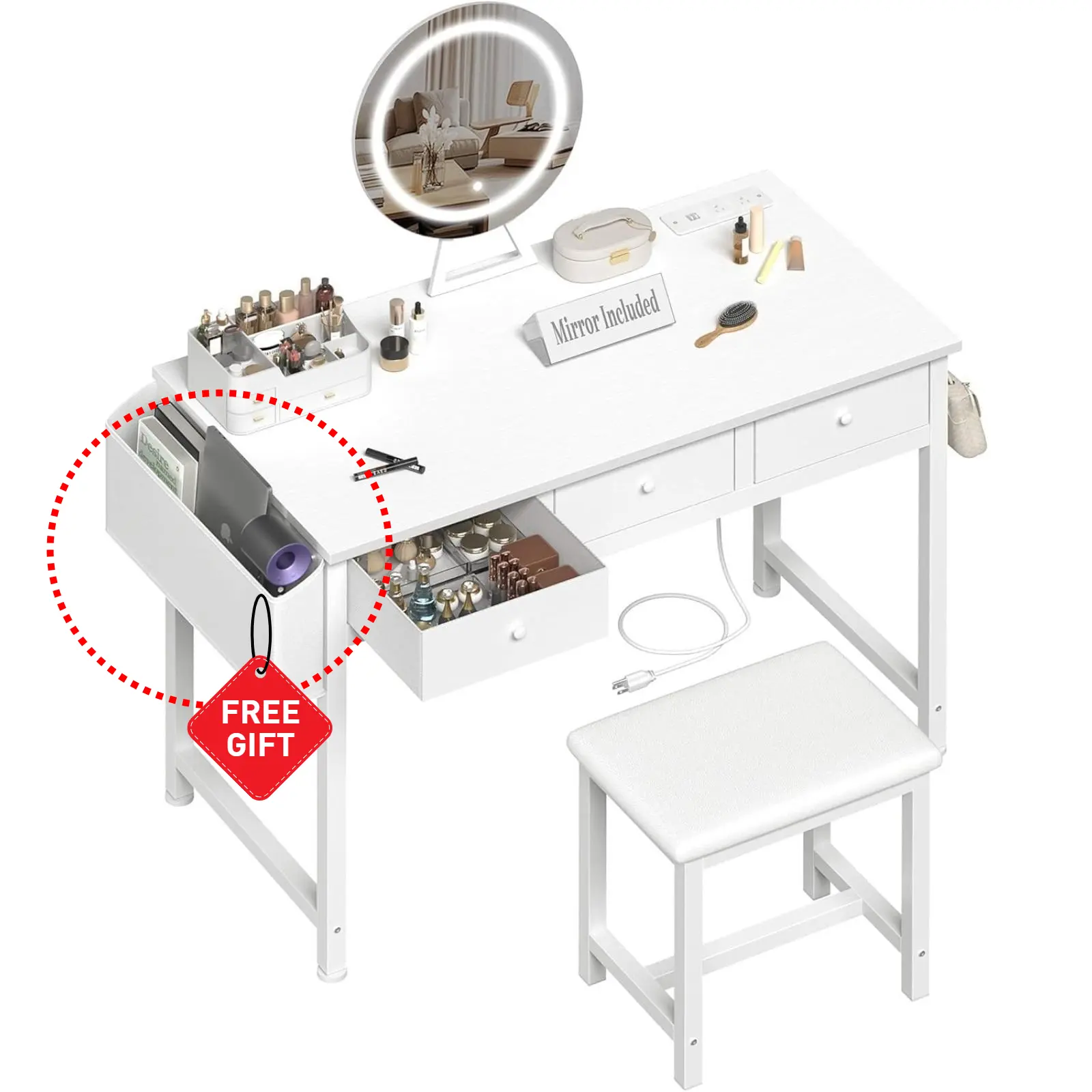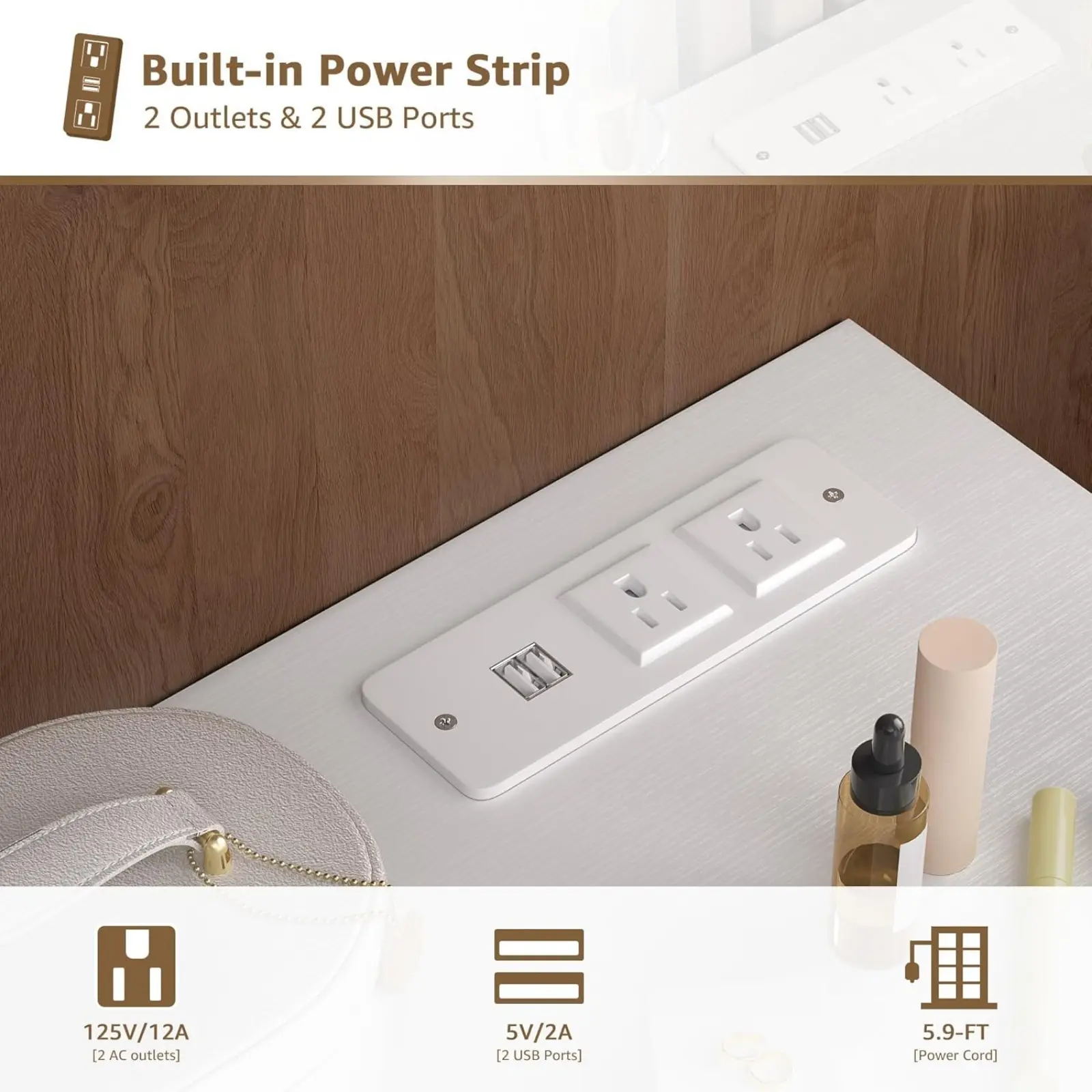 Stay Powered and Connected: Tired of finding a place to charge your phone or beauty tools? With the built-in charging station, includes 2 standard plug sockets and 2 USB ports, you can easily charge multiple devices, keeping your phone, laptop, or hair tools within reach