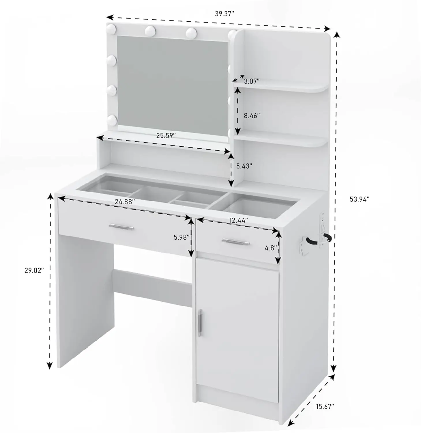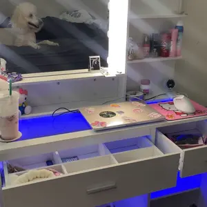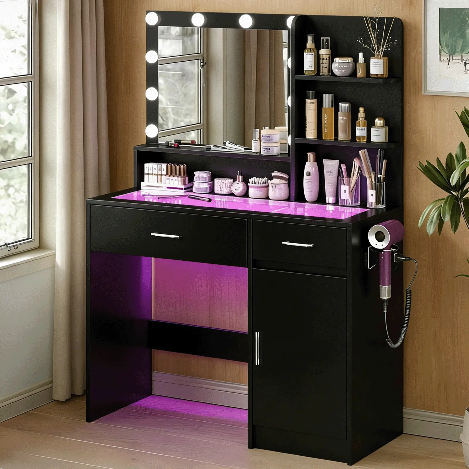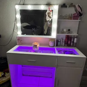 This LED vanity instantly upgrades any space. Easley assembled! Gives you a screw driver. The glass top with built-in LED lighting creates a sleek, luxury glow, while the Hollywood-style mirror provides perfect lighting for makeup and content creation. Spacious drawers keeps everything organized