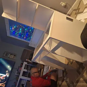 It’s so cute and decent sized, it look me and my man 4 hours to build without power tools. It only took 2 days for it to arrive and nothing came broken or missing. I def recommend, there is an app where you can download it and change the color of the lights and play music.