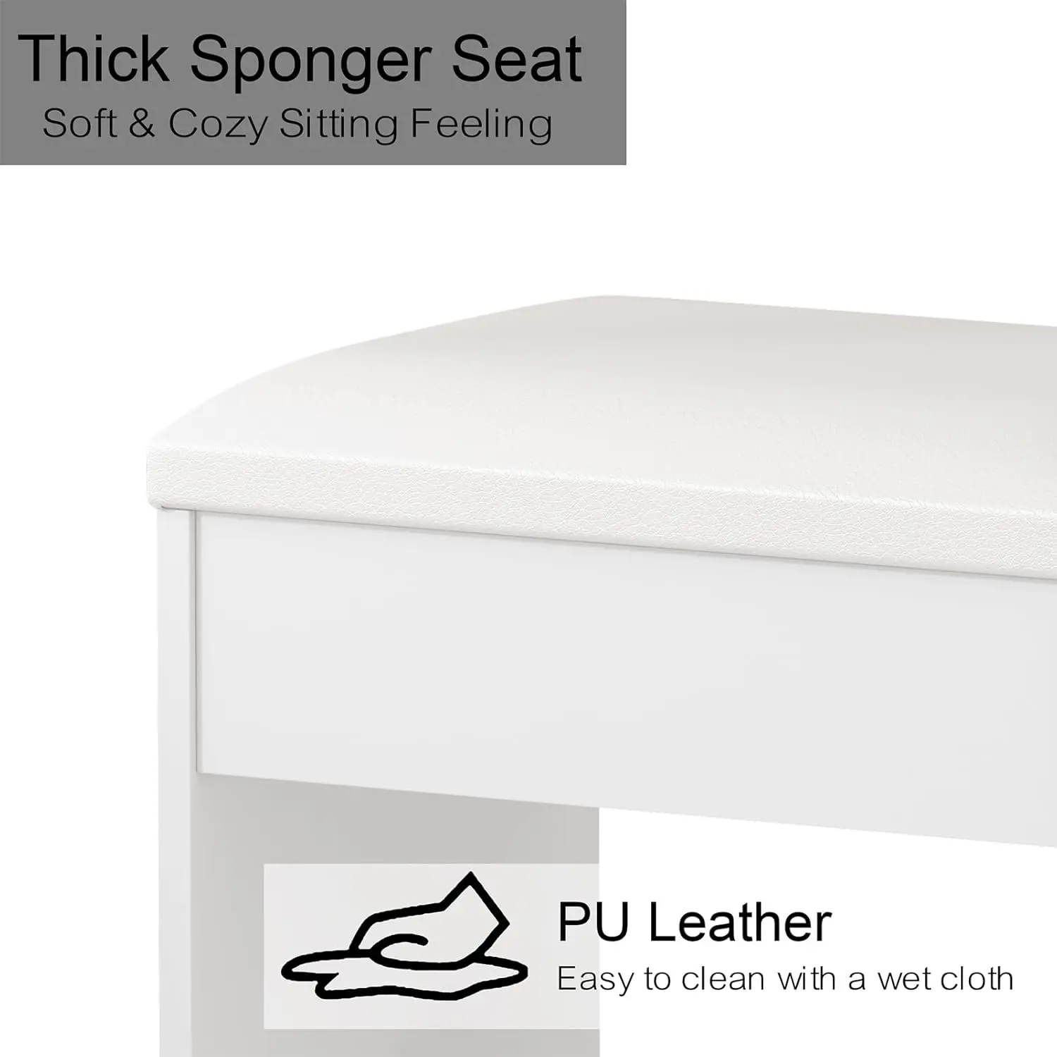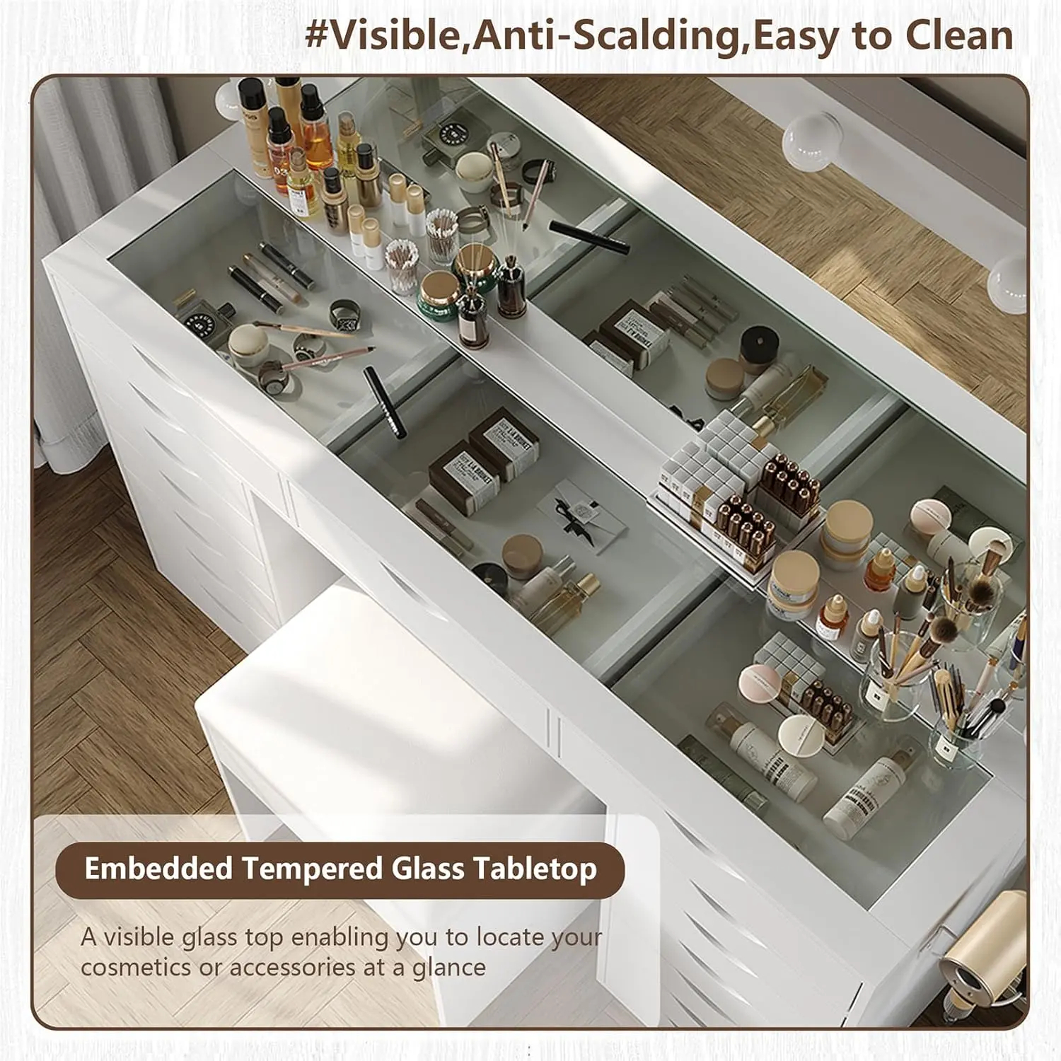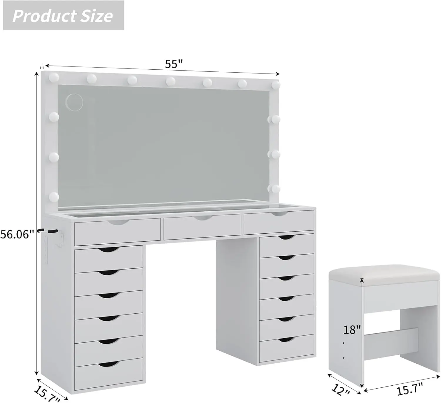 Come with Vanity Chair: This vanity stool is made of premium flame-retardant sponge and fabric. Proper height and a soft cushioned seat will ease your fatigue and give you a more comfortable makeup experience. This vanity stool can be placed completely under the table without taking up extra space for the makeup room