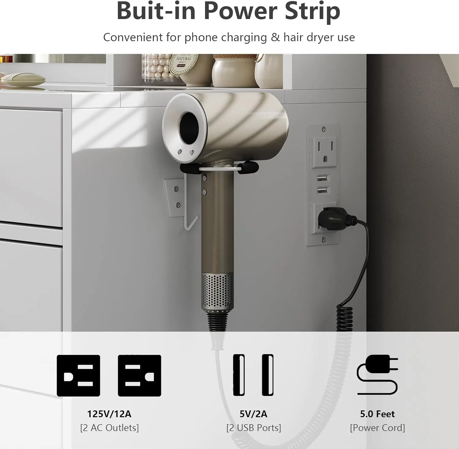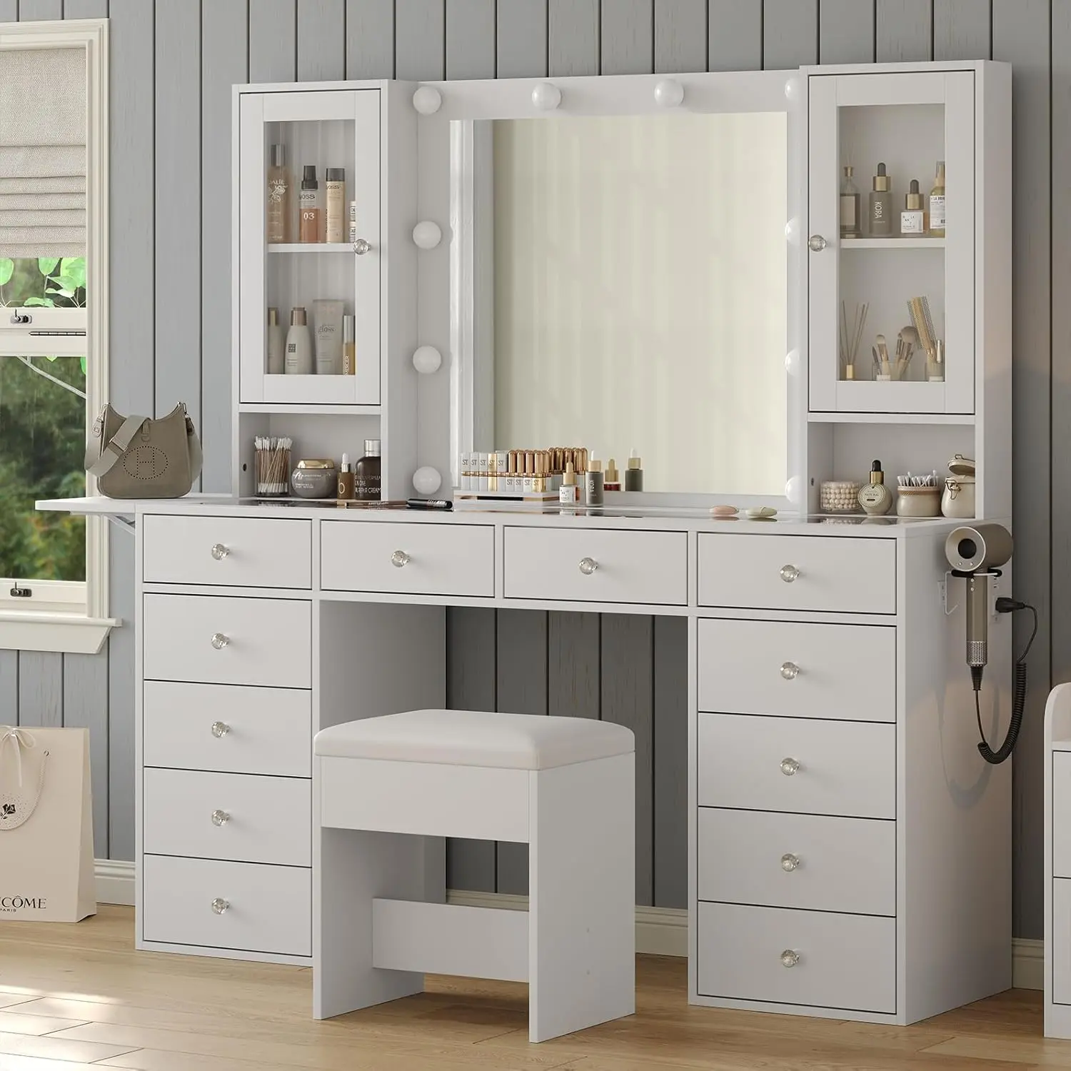 Vanity Table with Charging Station: This Vanity comes with a hair dryer stand and charging station, including 2 standard plug sockets and 2 USB ports to connect your hair dryer, curling iron, computer, Ipad, mobile phone, allowing you to take beautiful selfies after applying makeup