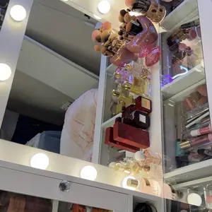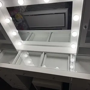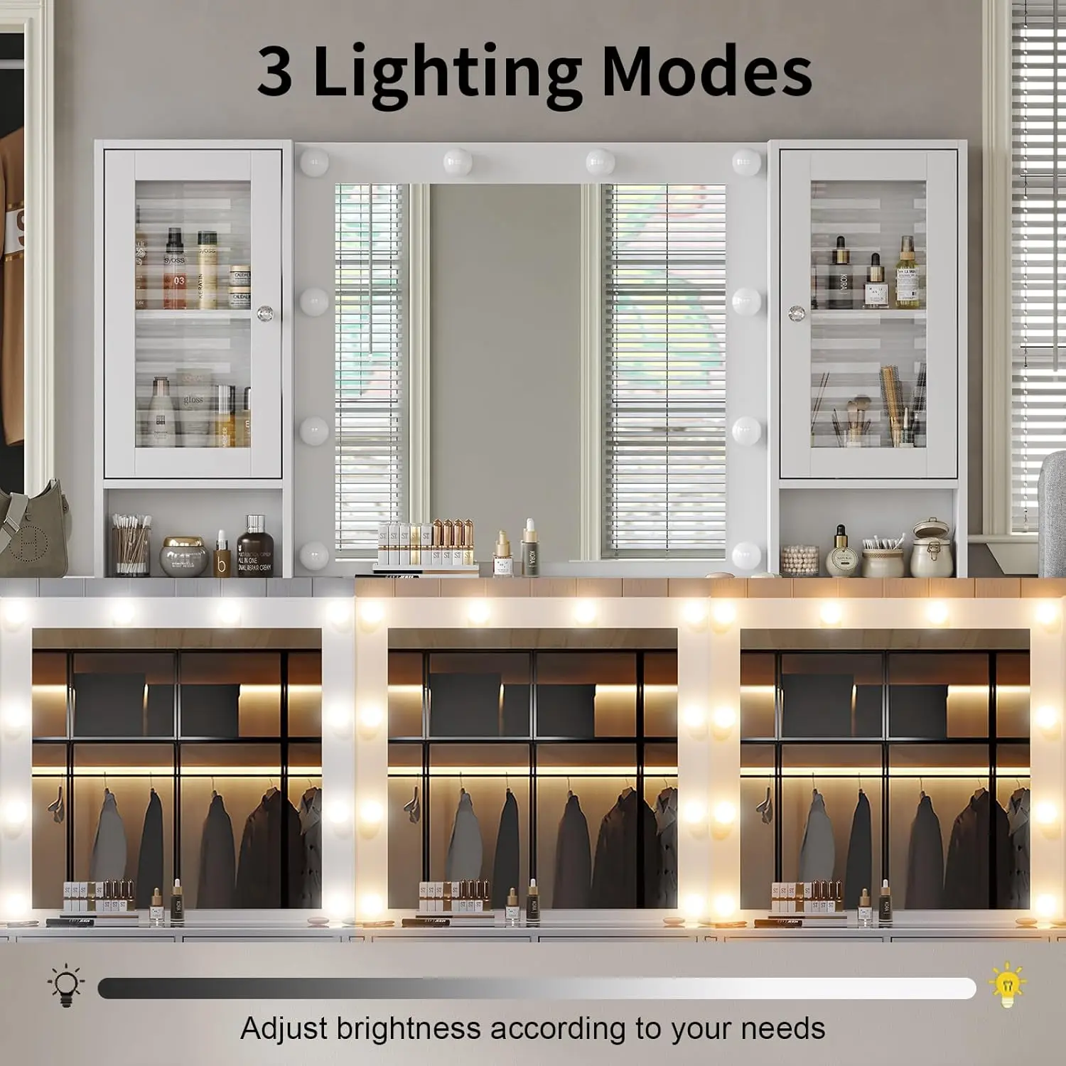 3 Lighting Modes & Brightness Adjustable: The vanity desk is equipped with an HD mirror and 10 bright Hollywood plastic bulbs, provides 3 color modes (warm/natural/cool) and adjustable brightness. This makeup vanity can meet all your different needs, perfect for home makeup, salon, and live broadcast., so you can experience the star-like makeup treatment