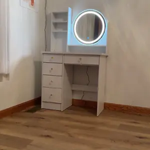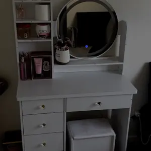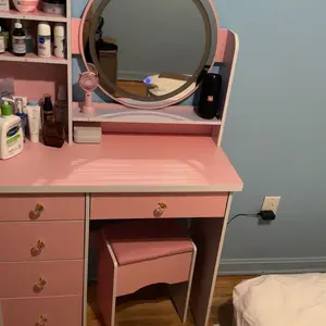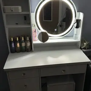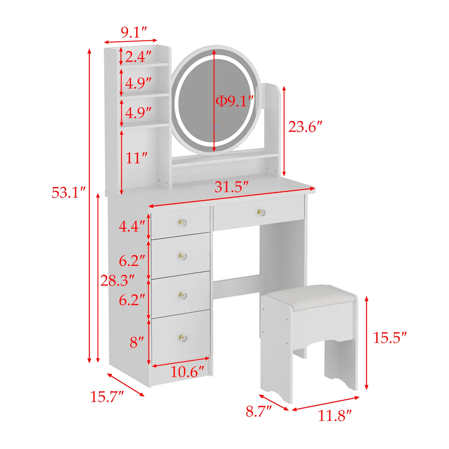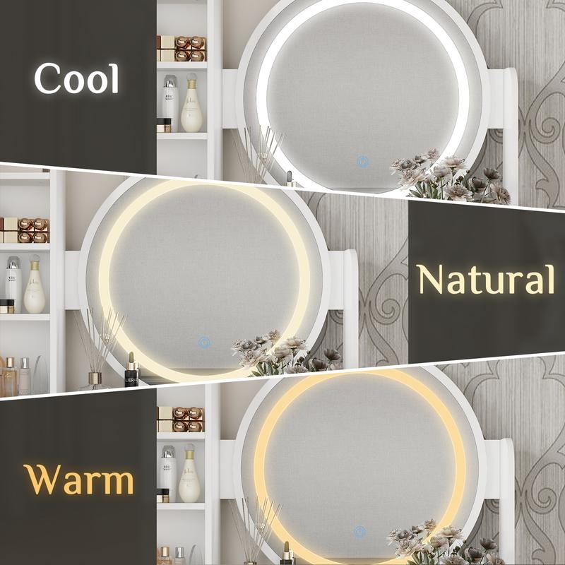 ·[Flexible Lighting Options] - This vanity desk features a round mirror with bulit-in light and sensitive button. There are 3 lighting options: color white, warm white and warm yellow to meet your needs when you are doing your makeup. Besides, the lightness is adjustable when you long press the button.