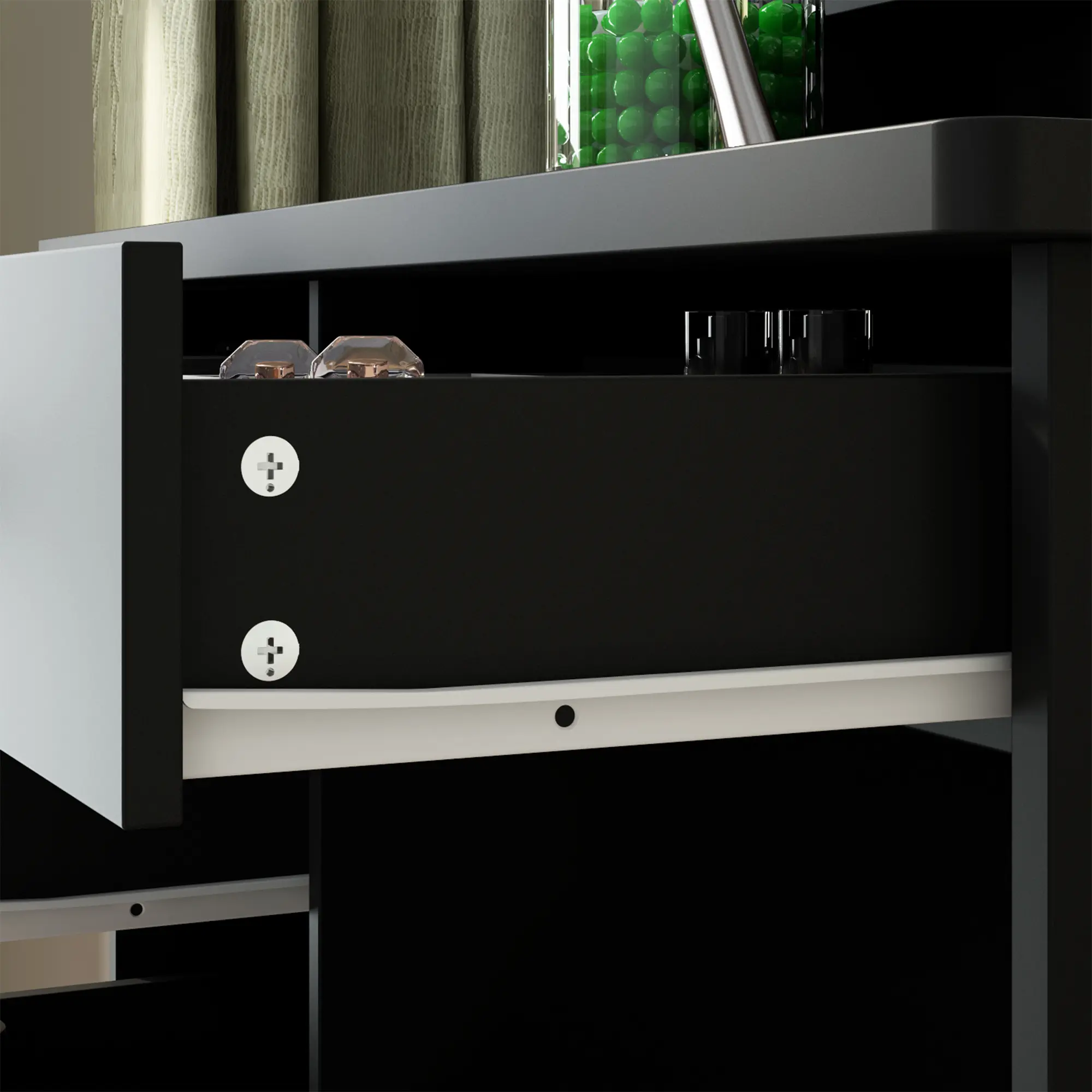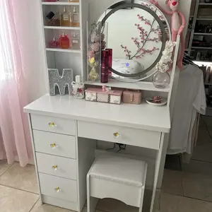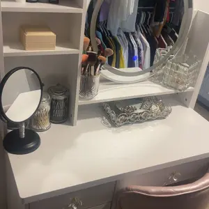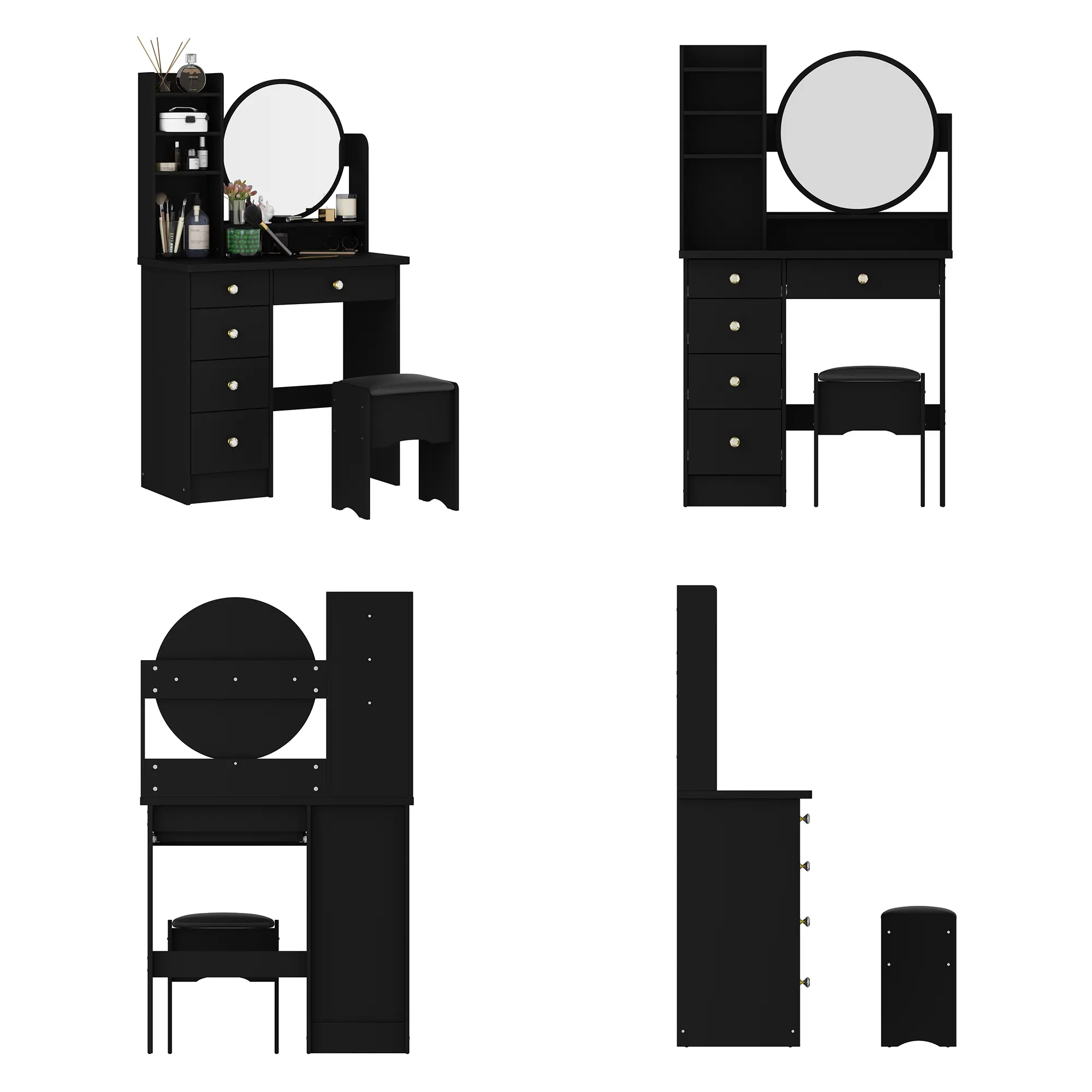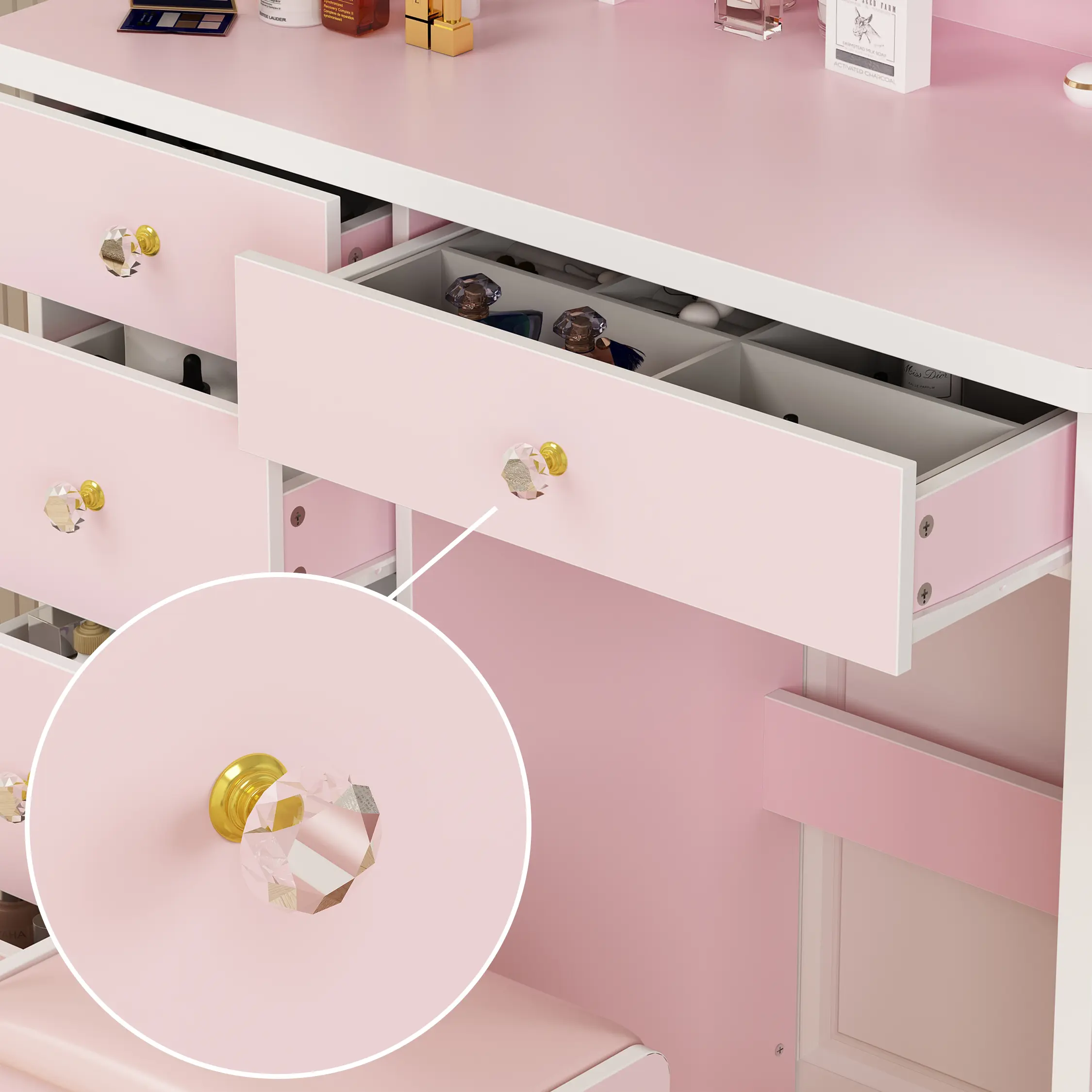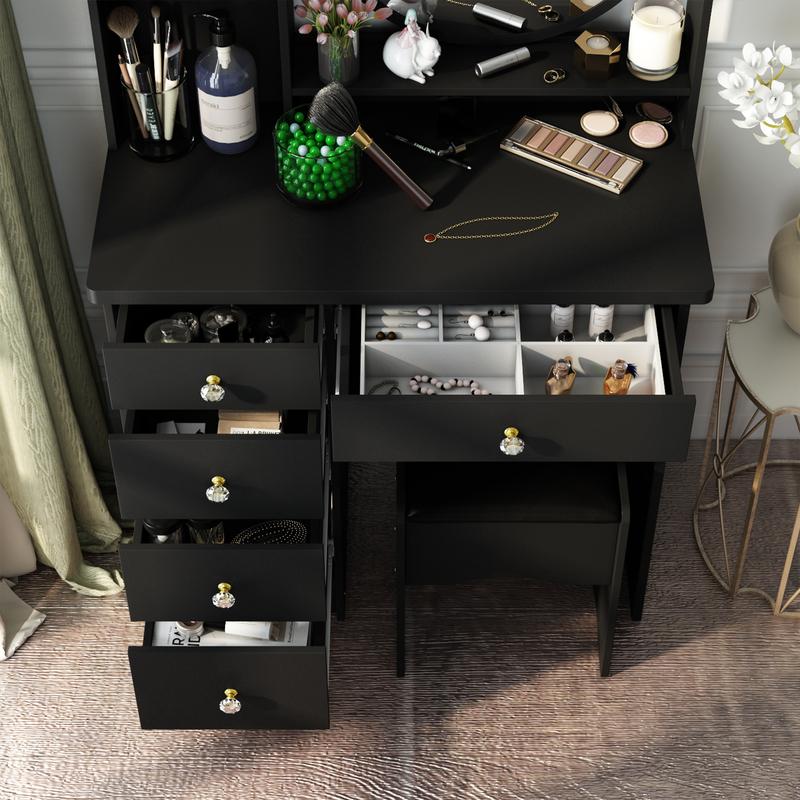 ·[Varieties of Storage Space] - The makeup vanity is really functional and practical to organize your makeup stuff. Featuring different sizes of drawers(no slides equipped) and shelves, the vanity table set provides considerate space to store your cosmetics, nail polish, perfume, eyeliners and so on. You can make the best of it.