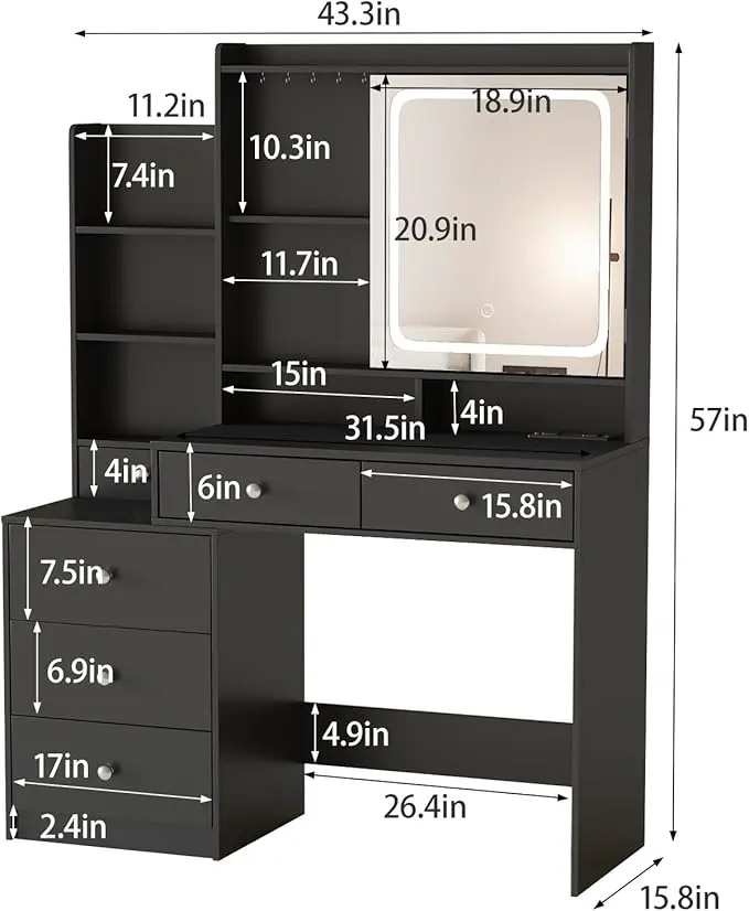 【Large Storage Capacity】The makeup vanity table constructed with 6 drawers, 5-tier open shelf and 2-tier hidden shelves behind mirror.Especially the hooks on the storage shelf for hanging your necklaces and earrings, which will makes it easier for you to use.