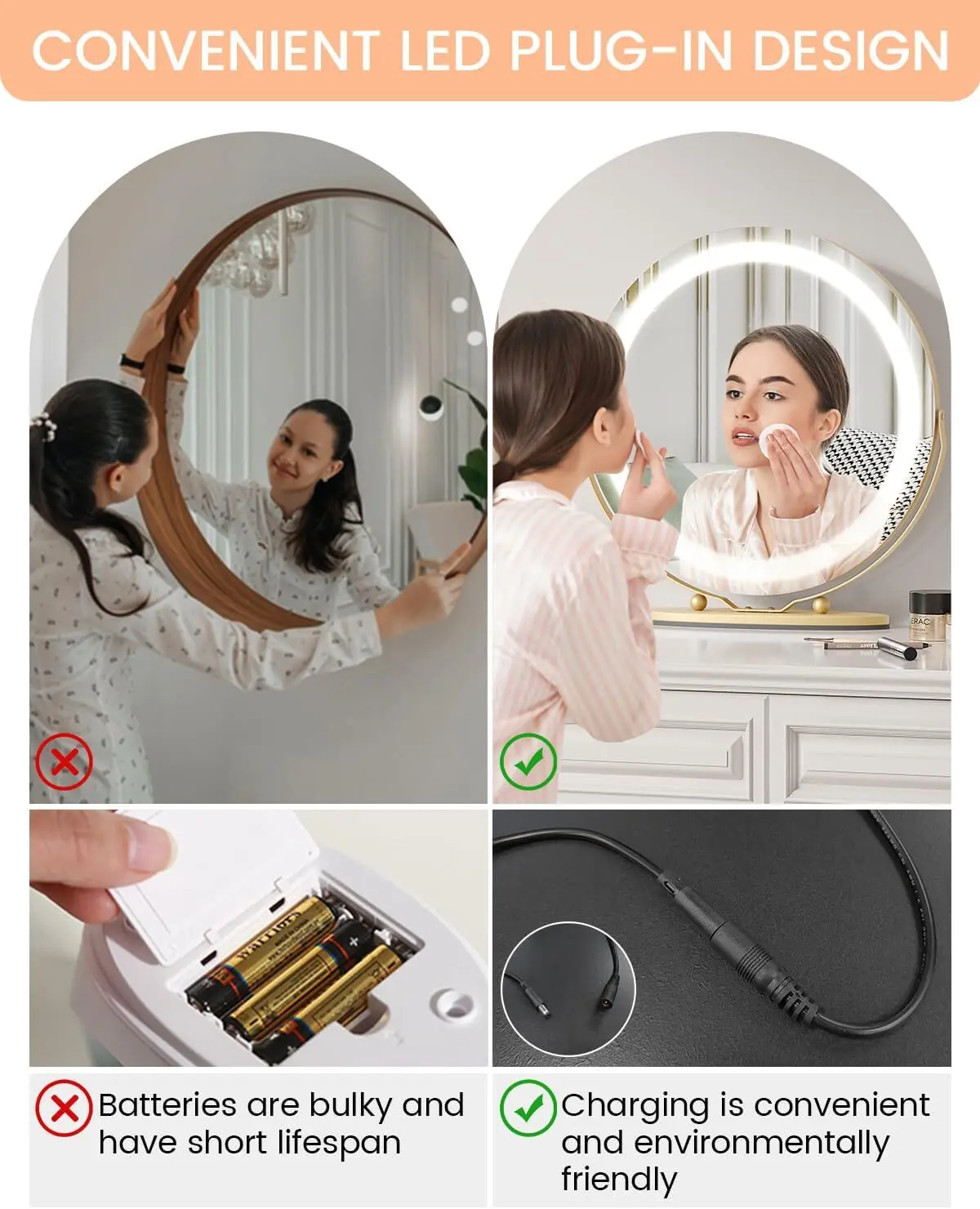2. Advanced Lighting Features: Our LED-equipped vanity mirror features three versatile light settings—warm, daylight, and cold—allowing you to adjust the ambiance according to your needs. With seamless dimming capabilities, you have complete control to fine-tune the brightness for flawless makeup execution in any setting.