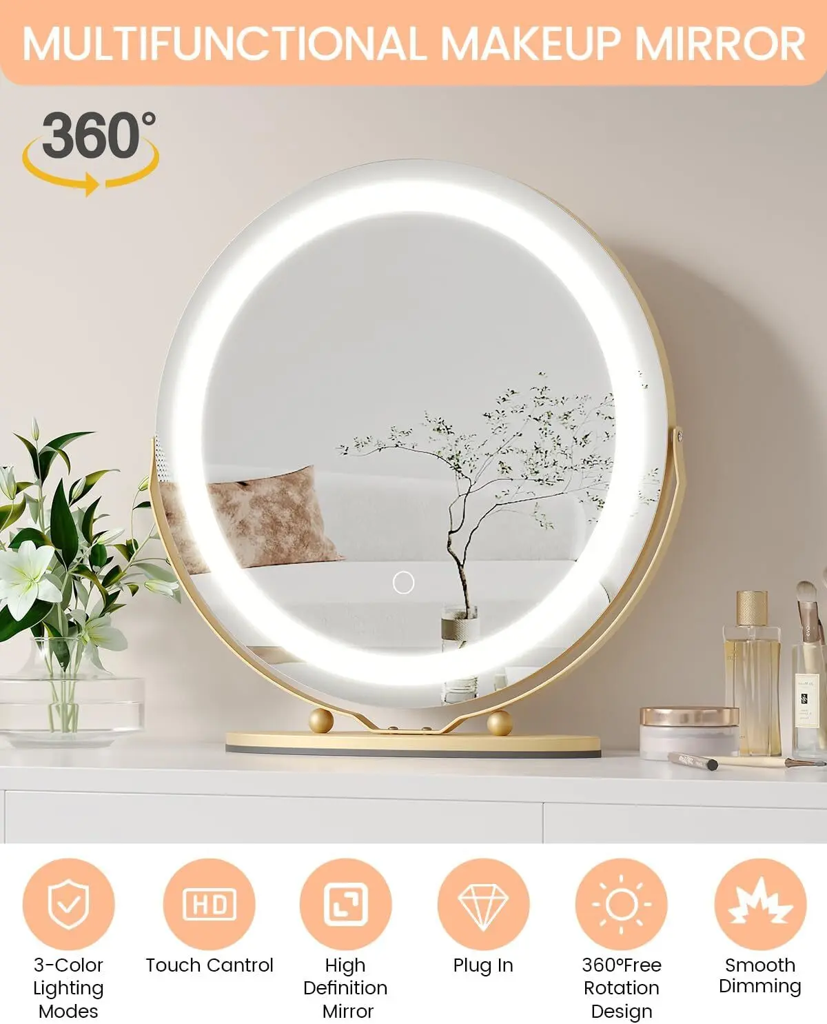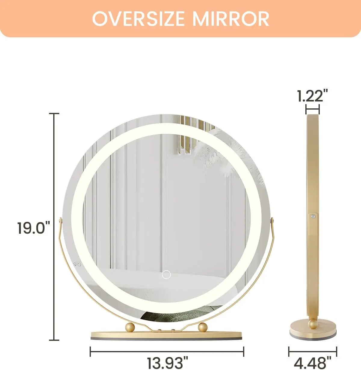 1. Elegant Design & Generous Dimensions: Revel in the elegance with our 19-inch round gold vanity mirror, perfect for broadening your view during makeup application. The makeup mirror with lights, set in a sumptuous gold frame, infuses a touch of grandeur into any decor, transforming your makeup routine into a luxurious experience.