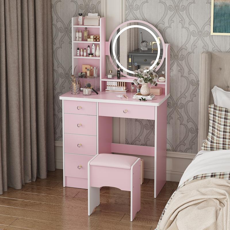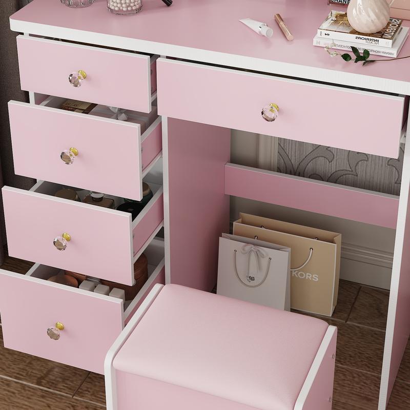Makeup Vanity Set in Pink. This dressing table features a large high-definition mirror, perfect for your daily makeup and skincare routine. Organize your beauty supplies and daily necessities with ease thanks to the ample storage space provided by the multiple drawers, shelves, and compartments. The soft cushioned stool included with the set ensures a comfortable makeup experience. Features: Large high-definition mirror for clear reflection Multiple drawers, shelves, and compartments for ample storage space Soft cushioned stool included for comfort Spacious surface is easy to clean Open storage compartments make storage more convenient 4 shelves are extra space for storing makeup accessories 5 drawers provide ample space for your jewelry Open storage shelf keeps your cosmetics organized ECACAD is committed to providing exceptional customer service and offers long-term installation guidance for all our products. If you have any questions or concerns, please feel free to contact us before or after your purchase. Product Dimensions: 31.5''L x 15.7''W x 52''H