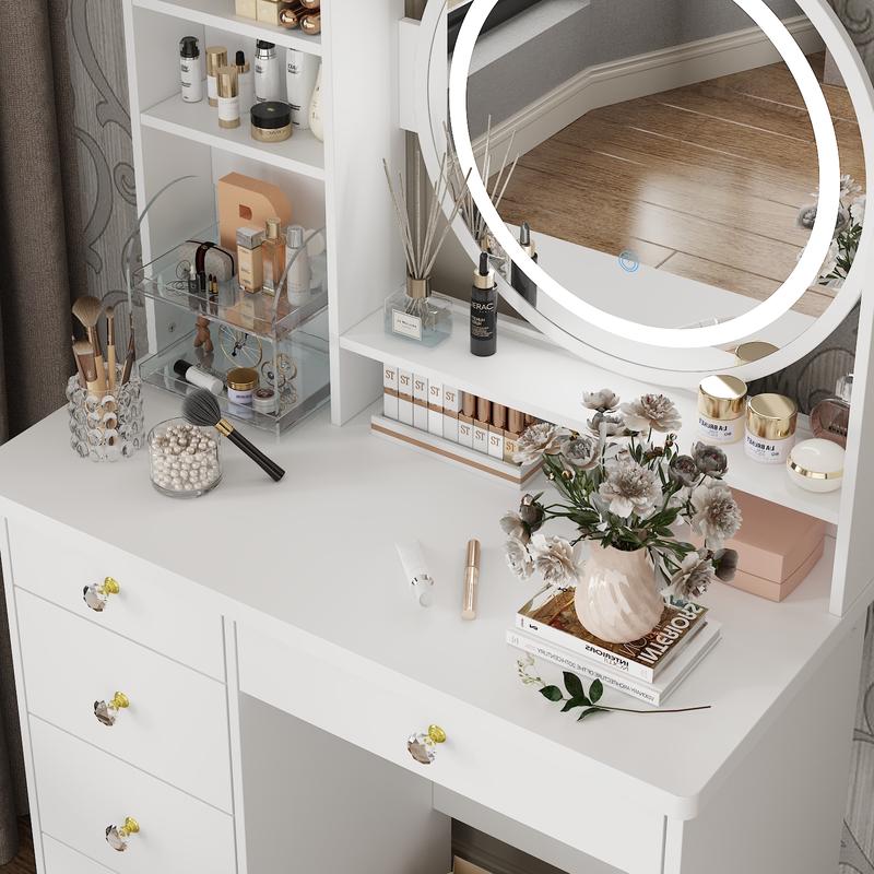 5. FUFU&GAGA Vanity Set with Round Mirror for Bedroom Makeup Dressing Table with Drawers for Girls Furniture Organization Storage Aesthetic Home Modern Design Minimal Interior