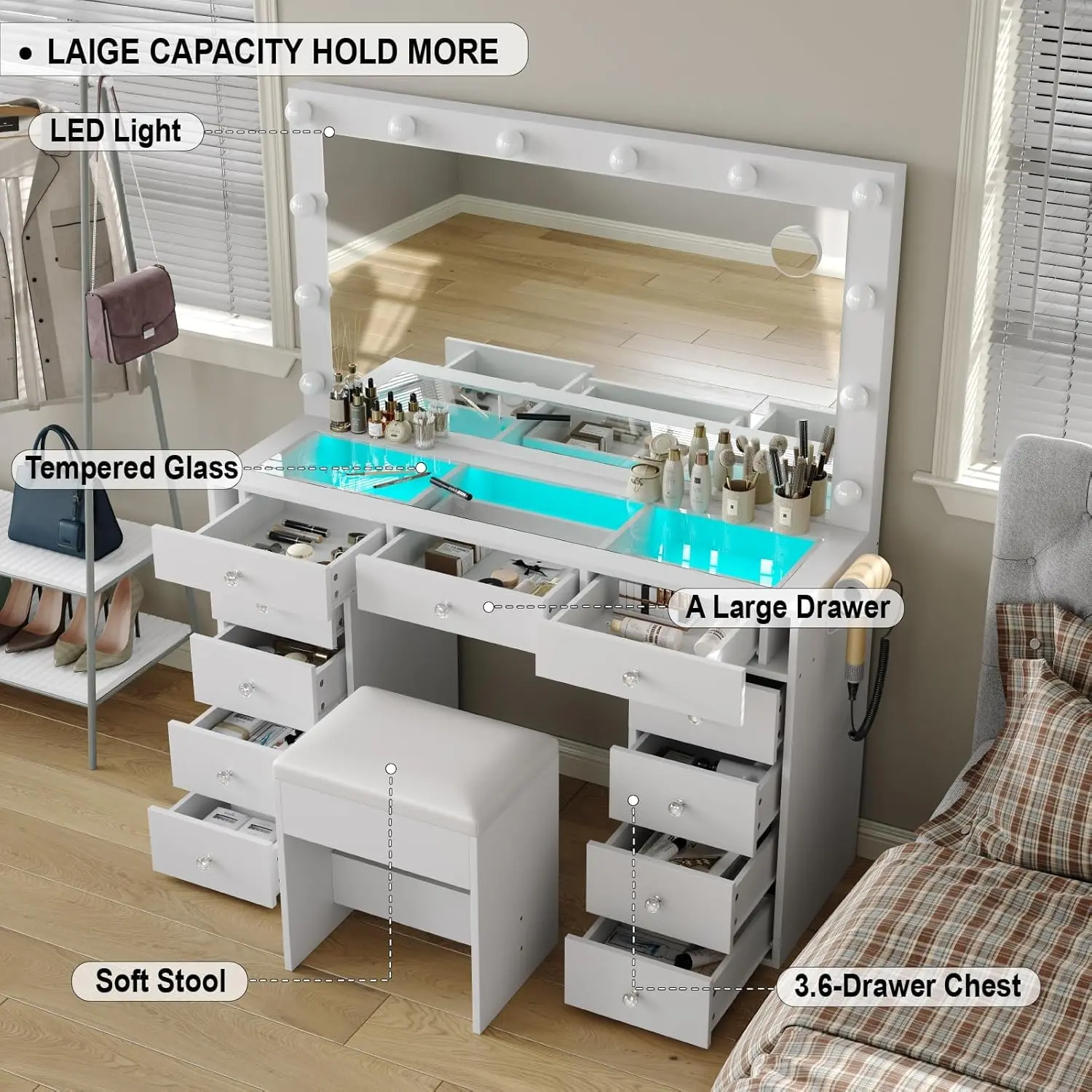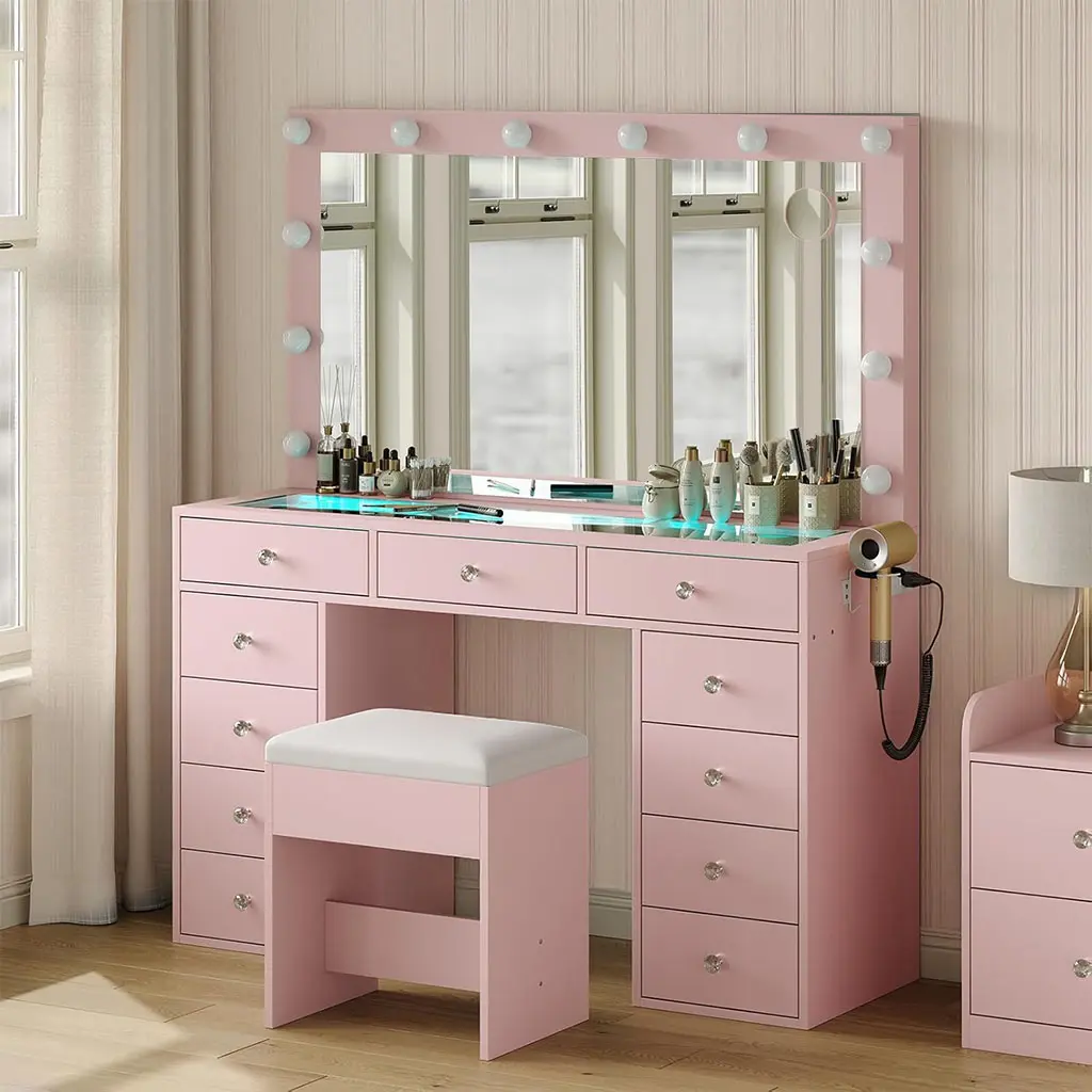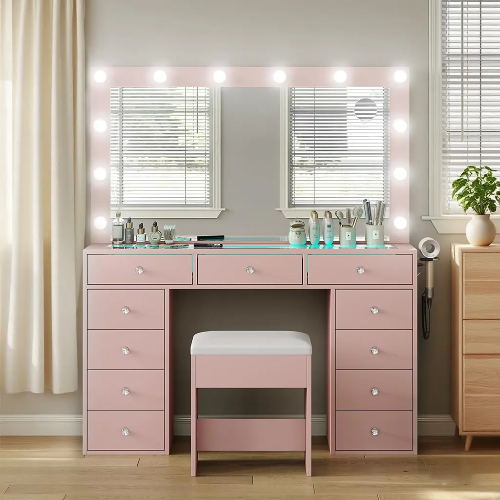 Storage Galore:Say goodbye to clutter! With 11 spacious drawers, this vanity offers endless storage for all your makeup, skincare, brushes, and accessories. Everything has its place, so you can keep your beauty zone tidy and organized—no more digging through messy piles to find what you need.
