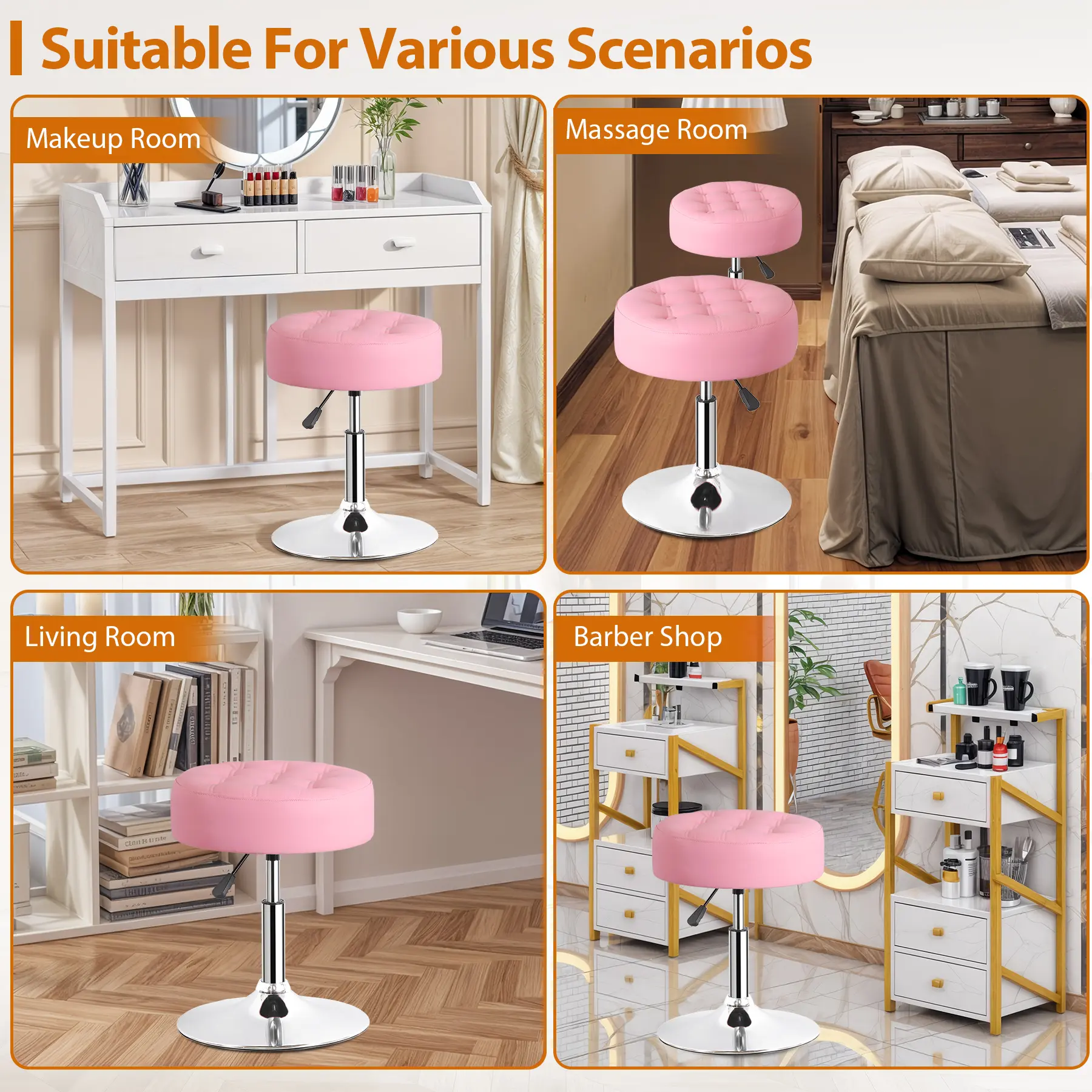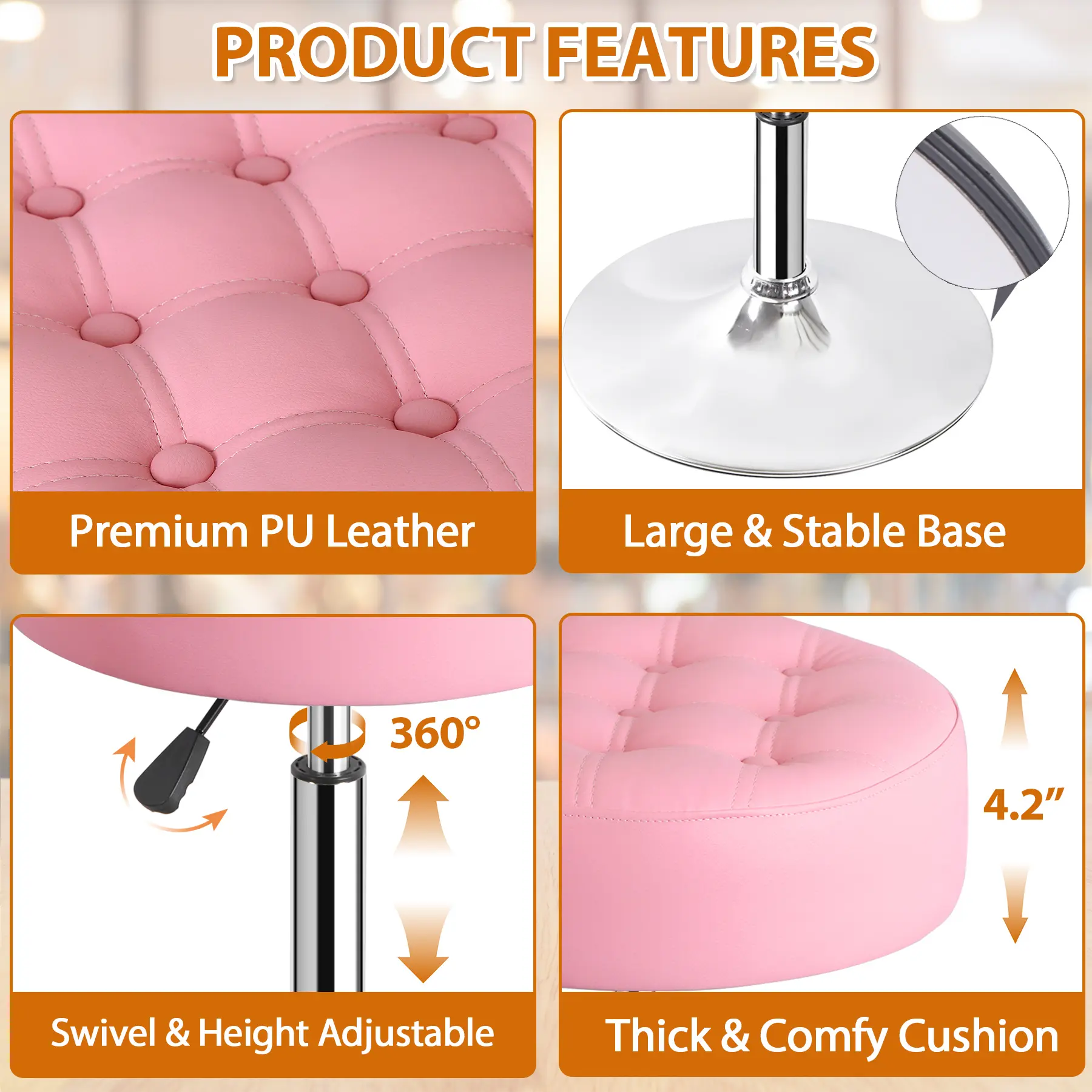 ·Durable iron pedestal base with a sleek chrome finish—stylish, sturdy, and fits any decor. Features an anti-slip rubber ring for stability (300lb capacity) and floor protection.