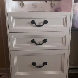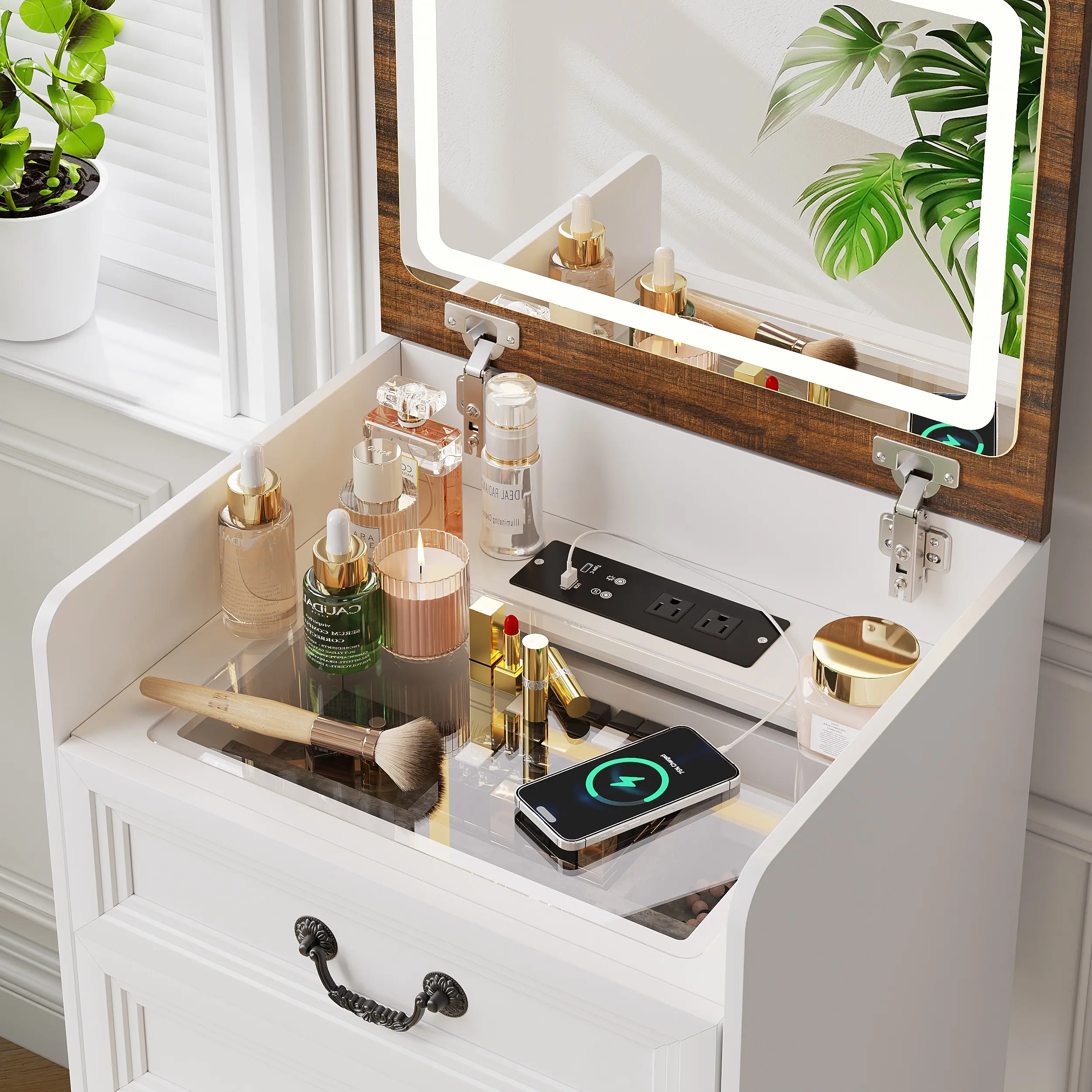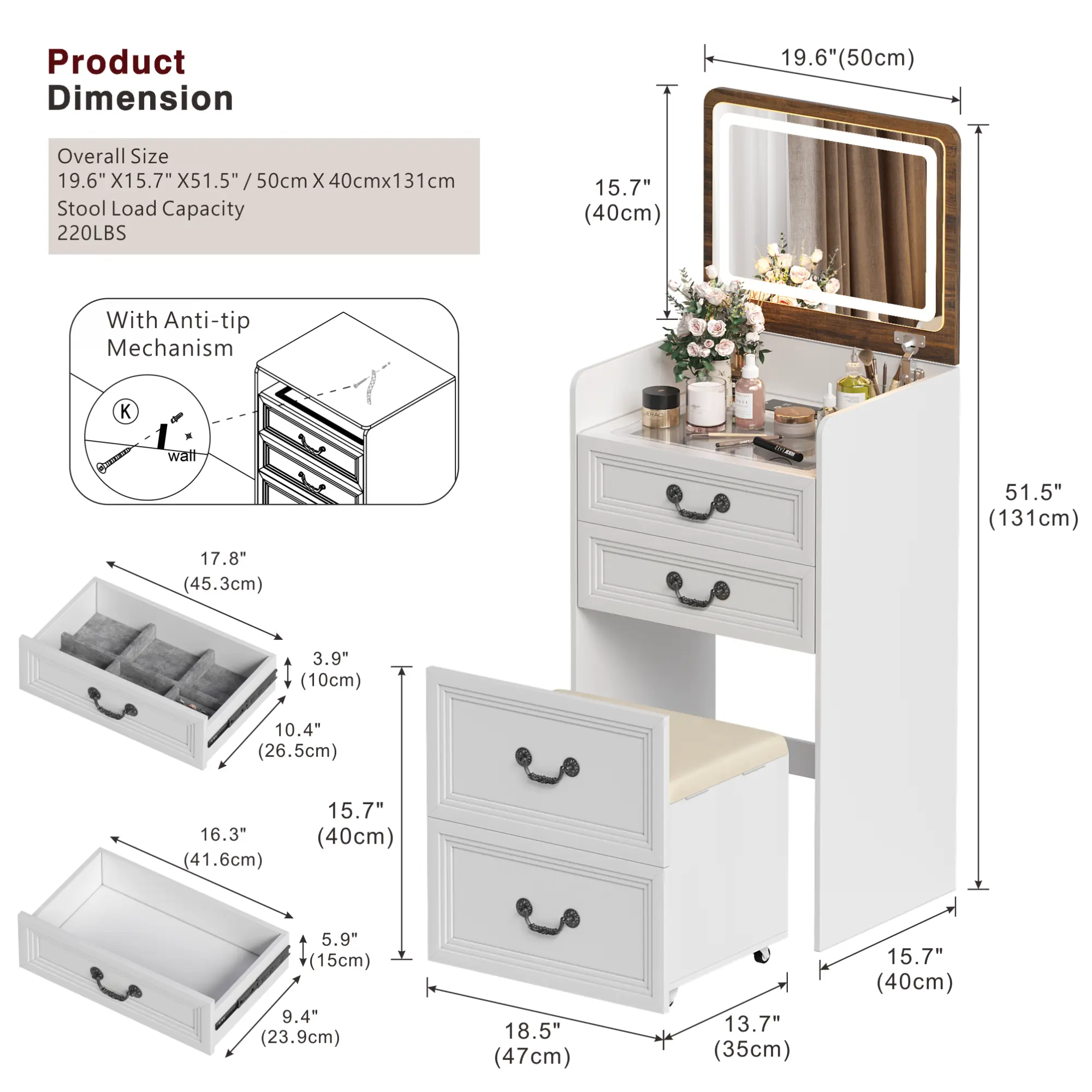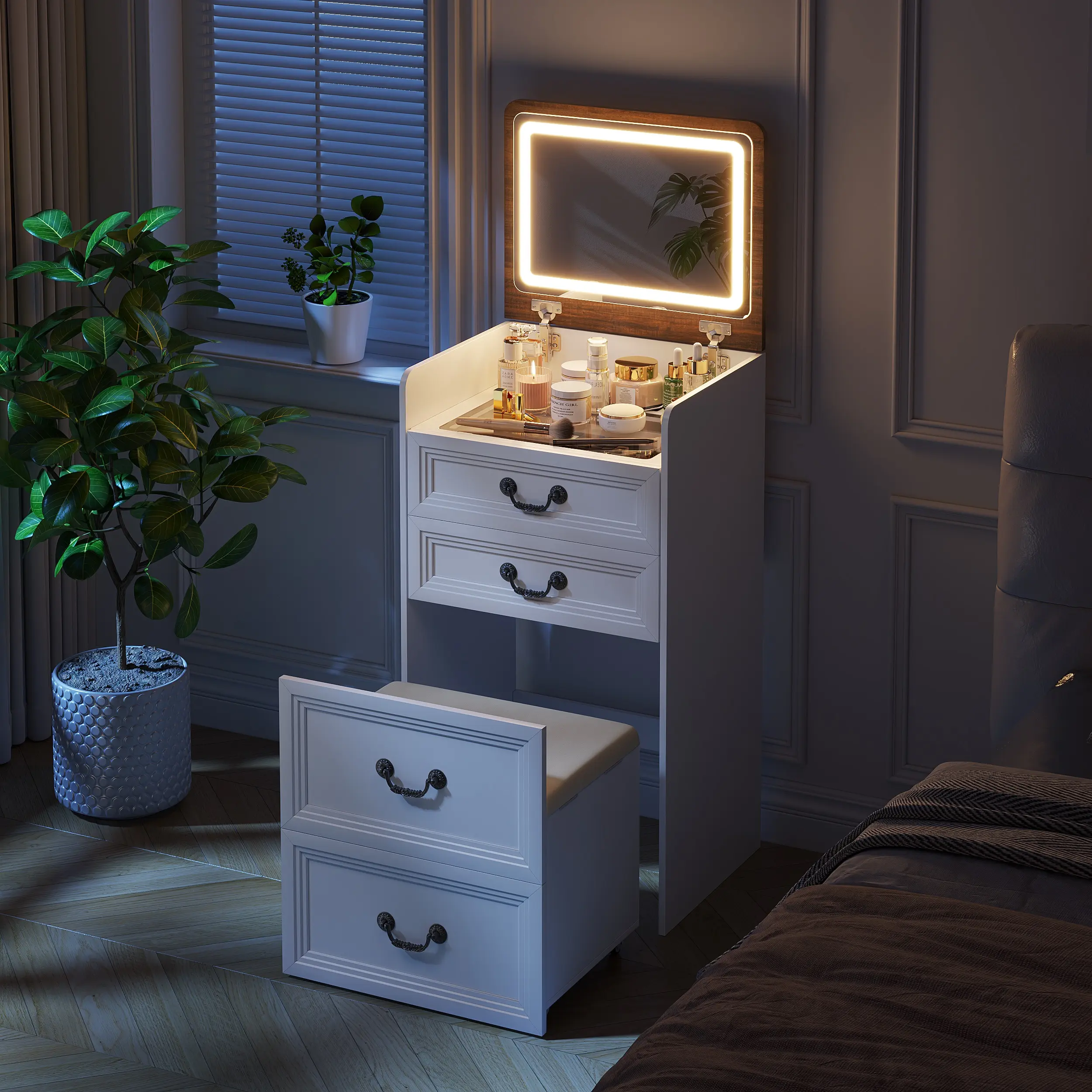 ·Soft PU Stool with Hidden Space and Drawer: The cabinet comes with a matching soft PU stool that not only provides a comfortable seating option but also includes hidden storage space. The stool has a lift-up top that reveals a storage area, perfect for keeping extra items or as a discreet spot for personal belongings. It also features a small drawer for additional storage needs.