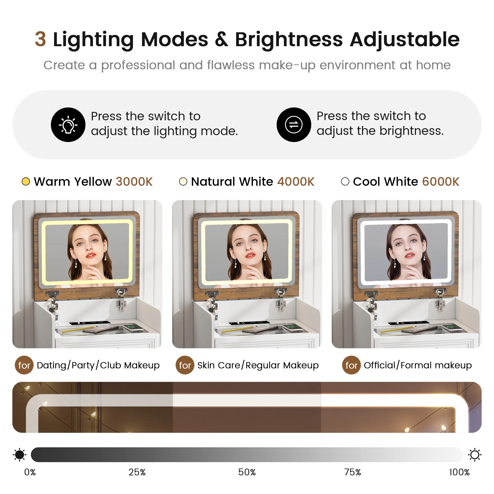 ·Flip-up LED Mirror: The cabinet boasts a high-quality LED mirror that flips up for easy access. This mirror is designed to provide perfect lighting for your morning and evening routines, ensuring you look your best every day. The LED lighting is adjustable, allowing you to tailor the brightness to your preference.