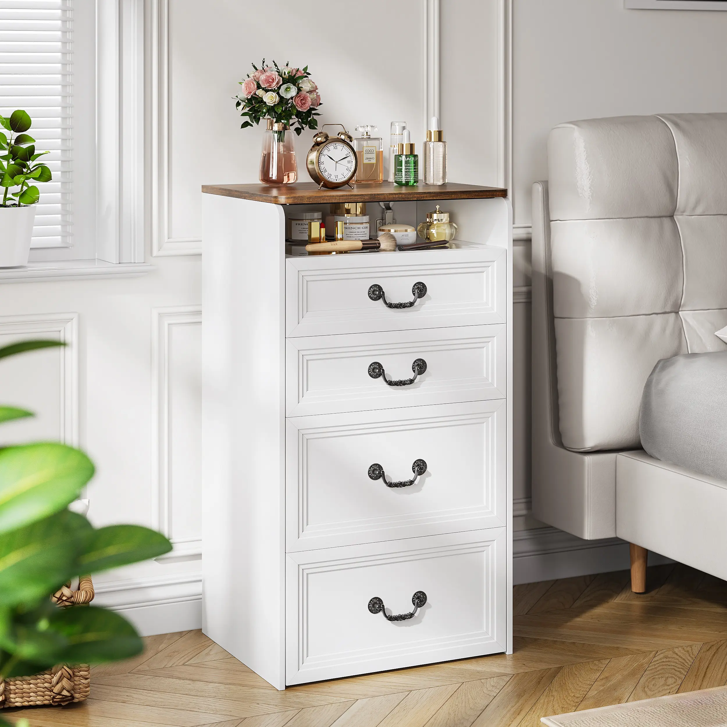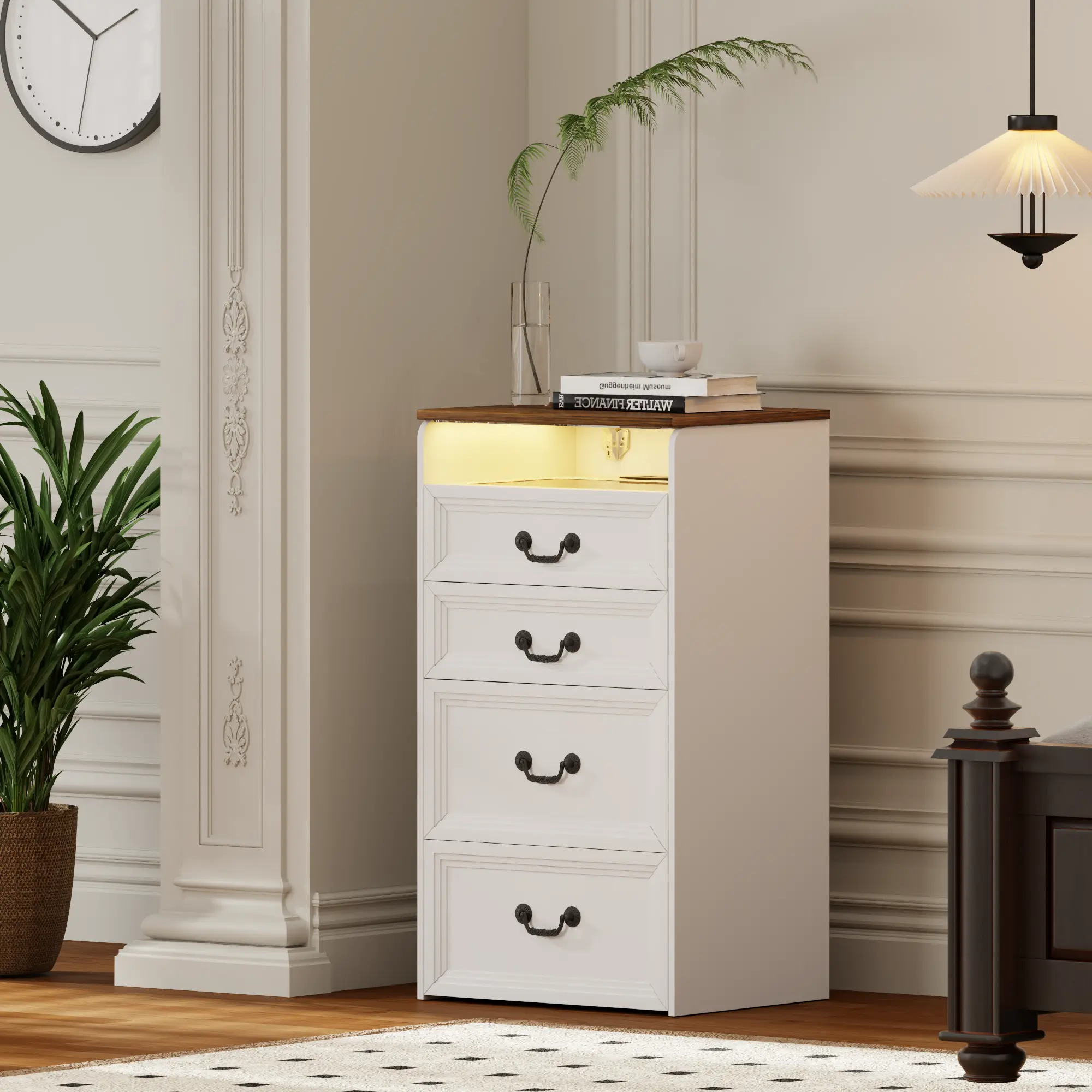 ·Visible Glass Tabletop: The top of the cabinet is adorned with a clear glass tabletop, offering a transparent surface that adds a touch of elegance to your room. This tabletop is not only visually appealing but also practical, as it allows you to keep frequently used items within easy reach.