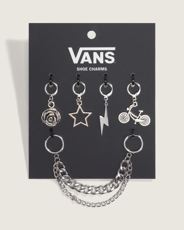 Silver shoe charms embellish every outfit from the ground up. Personalize any outfit with chains, metal roses, and lightning bolts that infuse your shoes with edge.